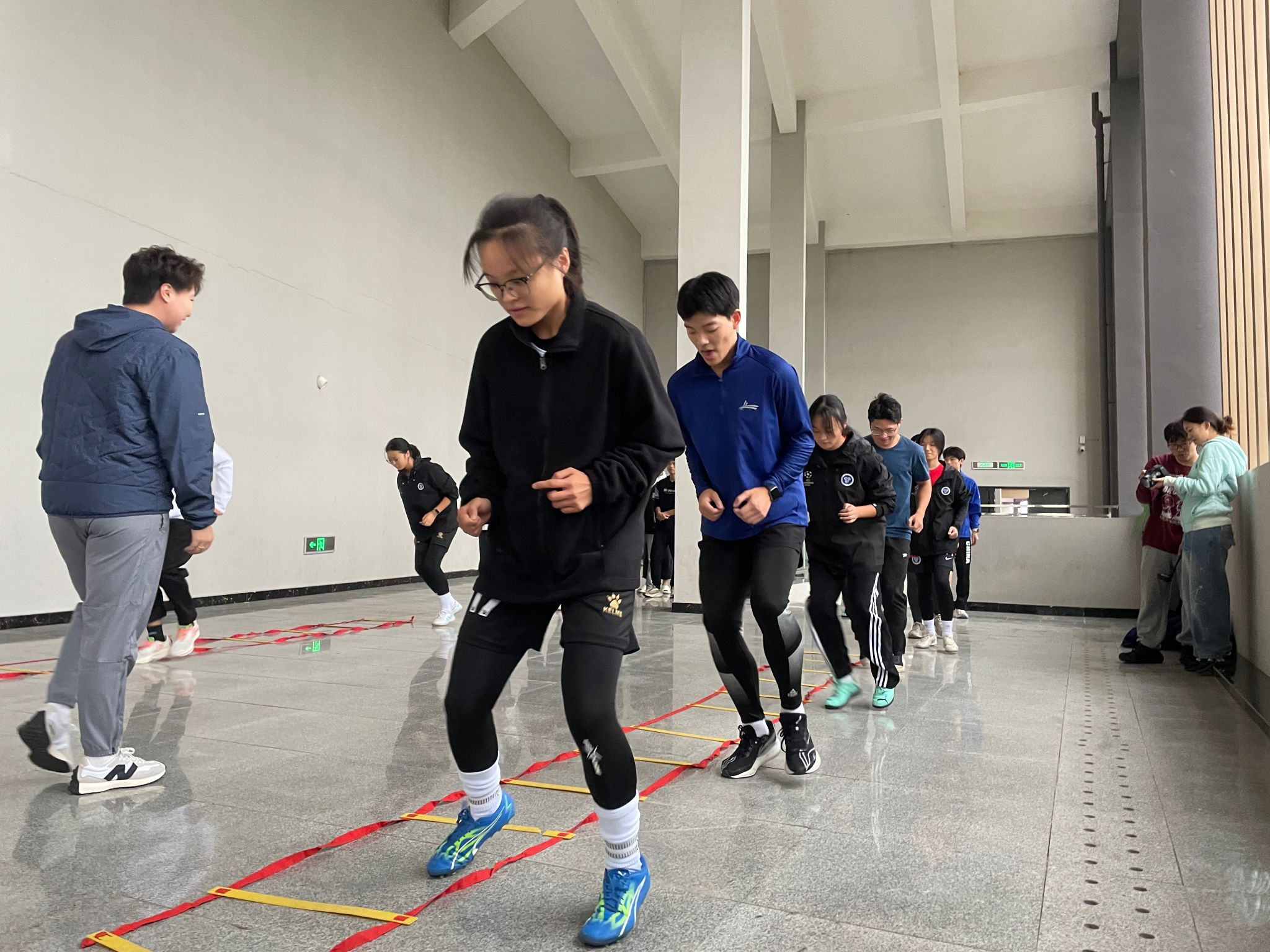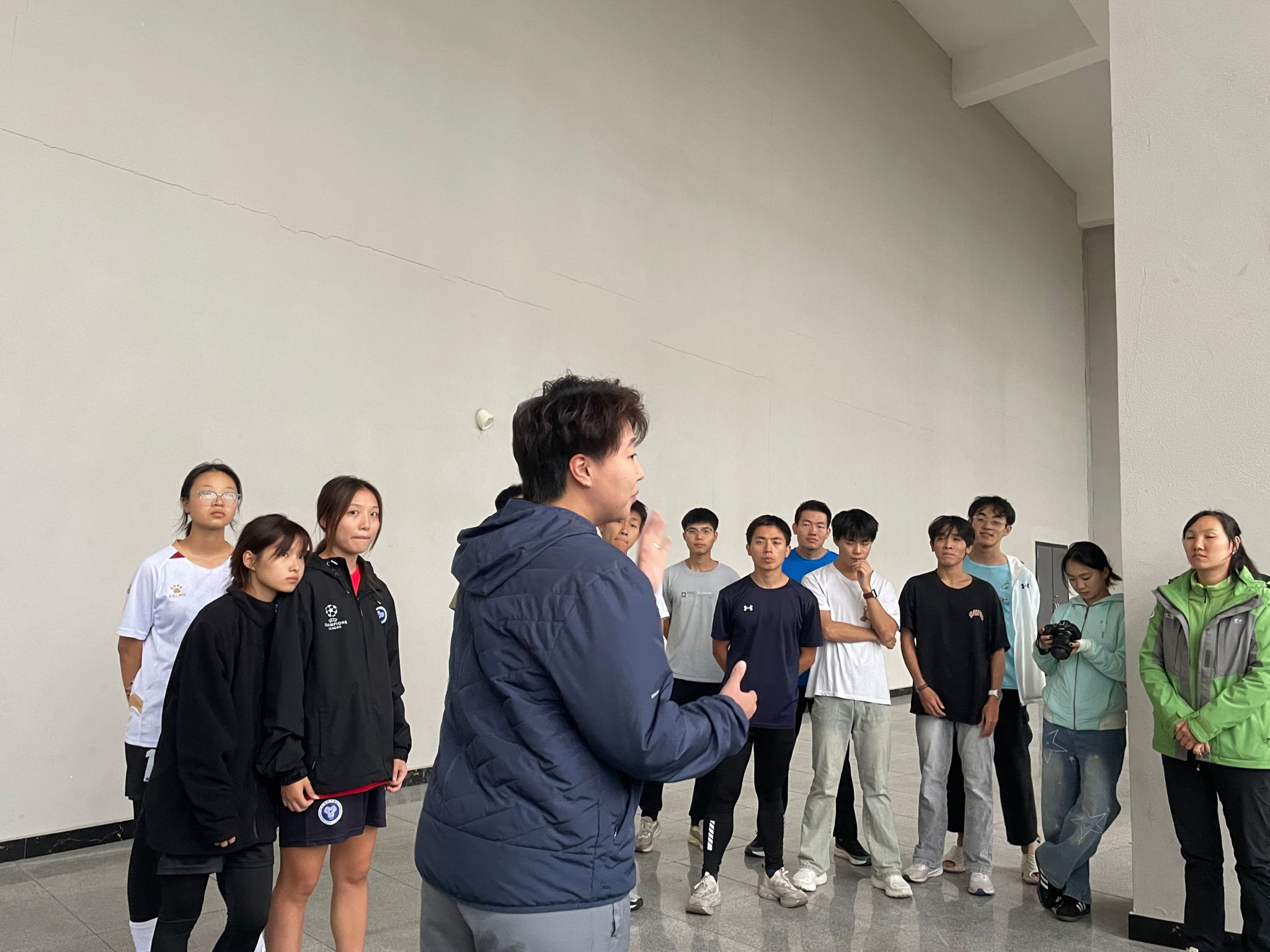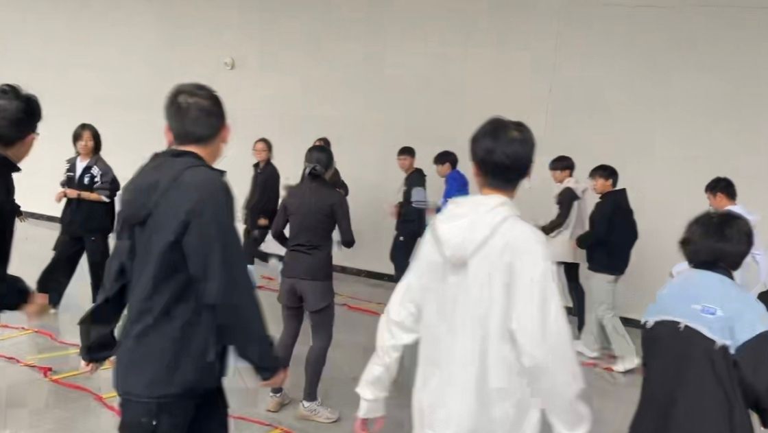 活动在下午16:00的欢声笑语中拉开帷幕,游泳馆外,大家通过 “数字抱团” 游戏快速破冰,队员们进行自我介绍简单熟络,18 名女足队员与25 名铁三队员便随机结对成为 “教学伙伴”,活动现场氛围热烈,充分体现出了队员们参与活动的积极性。