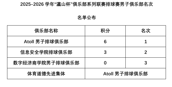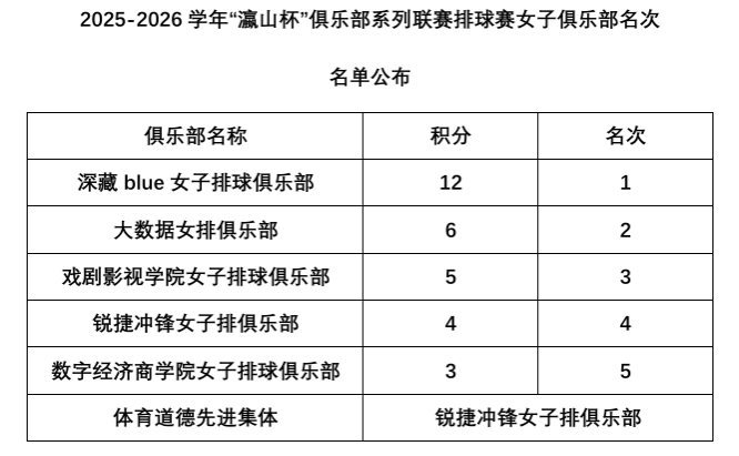 根据《完满教育委员会竞技体育学年重点工作计划》,竞技体育中心于2025年10月29日起在古剑书院排球场和星耀体育馆排球场举办的2025-2026学年“瀛山杯”俱乐部系列联赛排球赛现已完满收官,现将本次比赛的男、女俱乐部的前三名进行公示。名单如下: