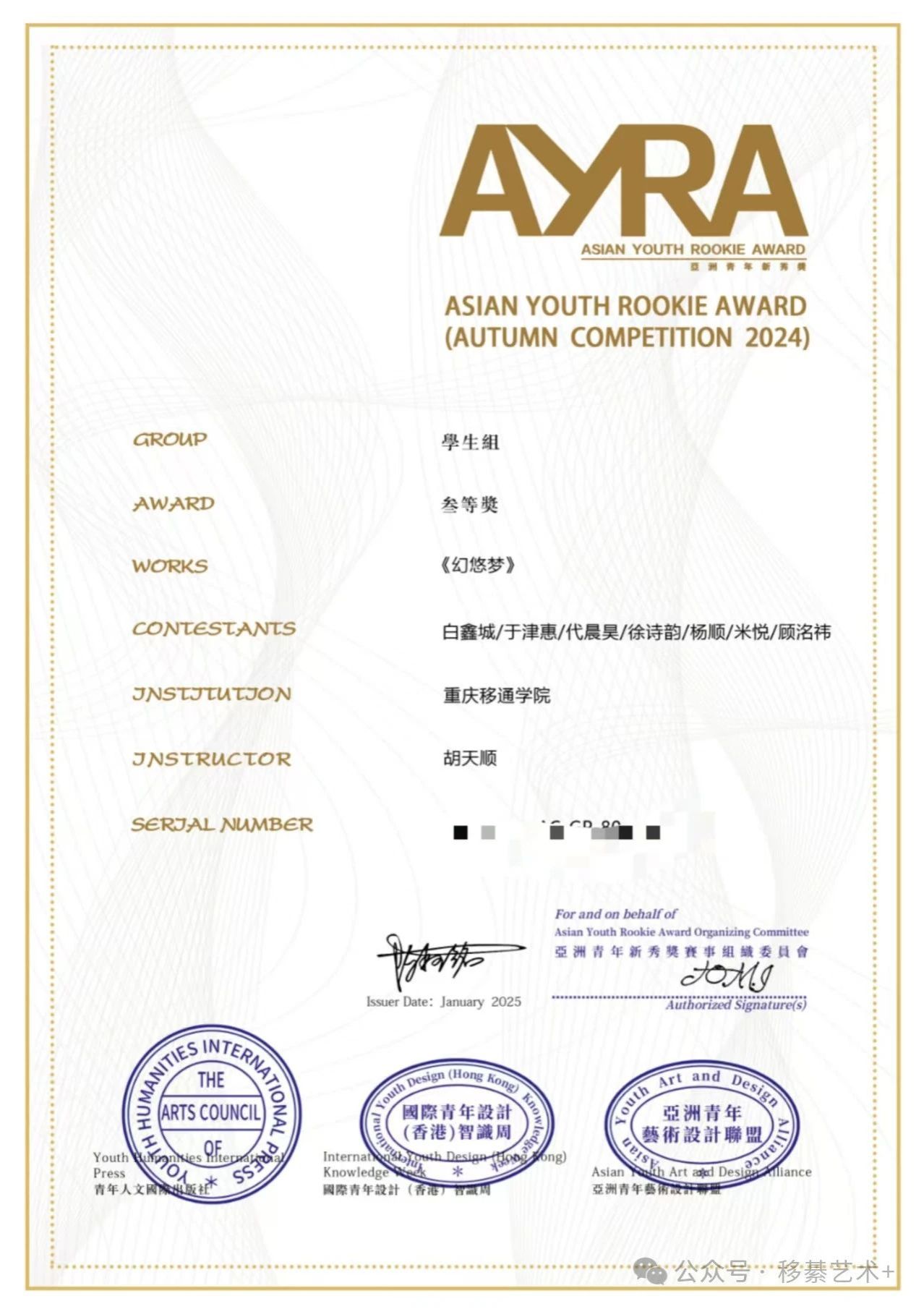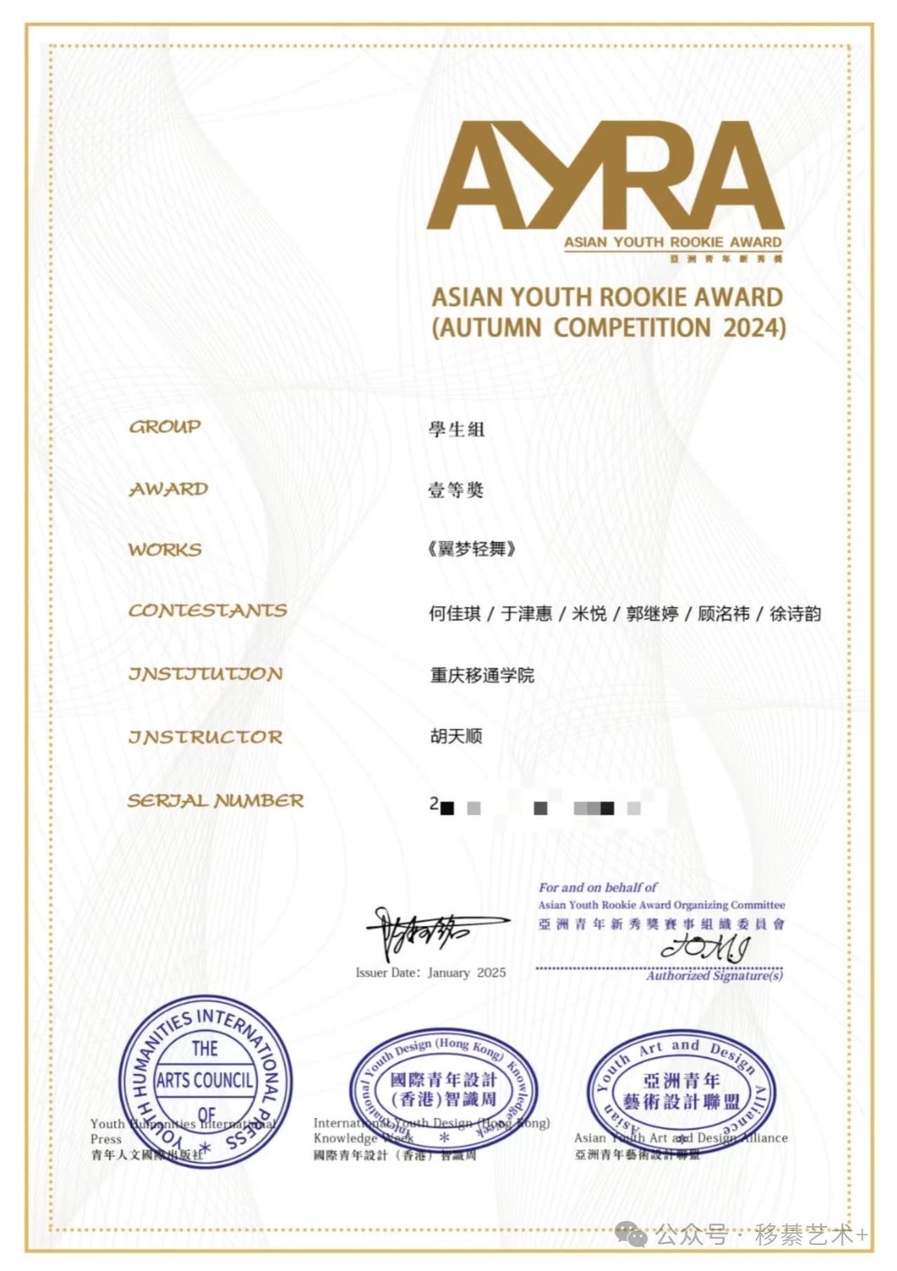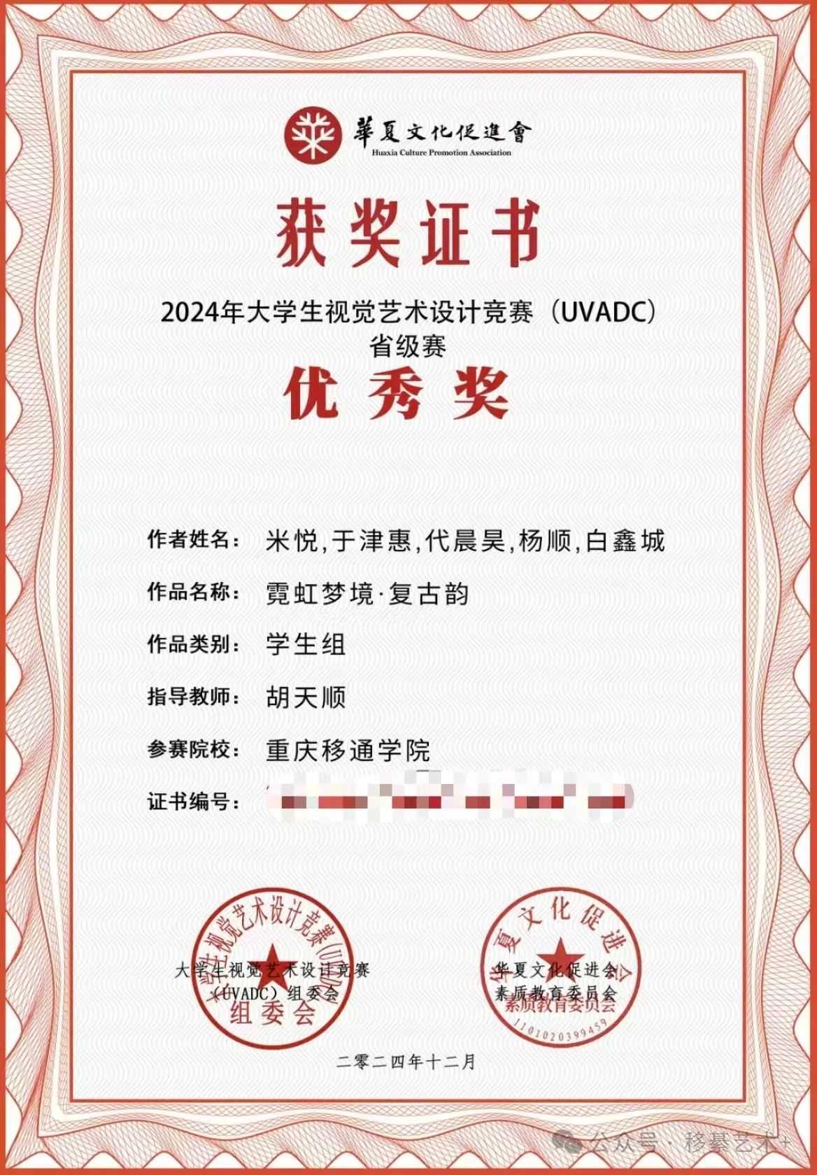 在激烈角逐中,重庆移通学院的学子们凭借出色的创意和扎实的设计功底,取得了优异的成绩。其中校服化造型设计团学生在亚洲青年新秀奖(秋季赛)中斩获全国一等奖、三等奖;中国大学生视觉艺术设计竞赛(UVADC)中荣获1个三等奖和3个优秀奖。