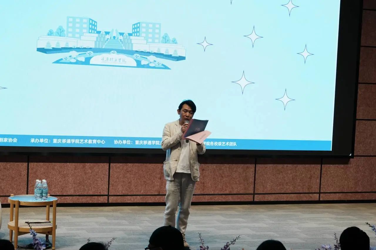 随后,重庆市戏剧家协会副主席赵虎代表主办方致辞。他高度肯定重庆高校在戏剧通识教育中的探索,越来越多高校将戏剧纳入通识课程体系,通过“戏剧+思政”“戏剧+非遗”等模式,构建起有地域特色、青春气息的校园戏剧生态。赵虎副主席呼吁高校“以戏铸魂”,将戏剧作为传承中华文化、培育时代新人的重要载体。