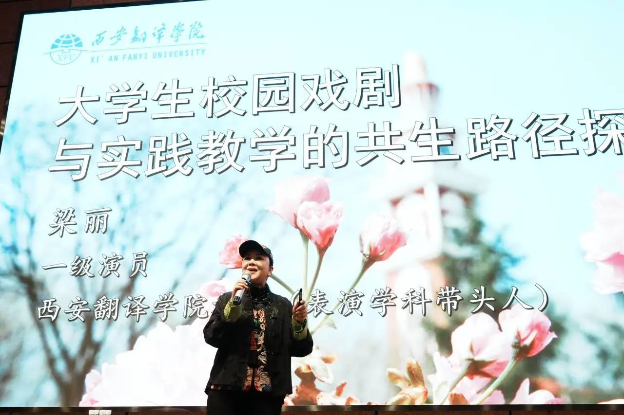 国家一级演员梁丽在《大学生校园戏剧与实践教学的共生路径探索》演讲中,作为经验丰富的老演员,她分享西安翻译学院的教学经历,在教学中不断为学生争取实战的经历,让戏剧扎根在学生,不断枝繁叶茂。