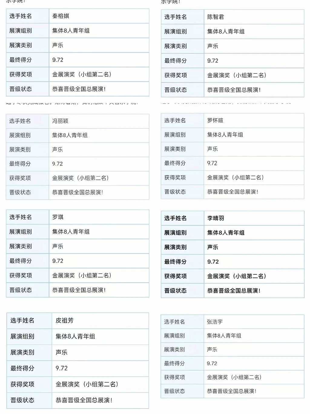 在声乐集体8人比赛专场中,我校的秦榕娸、陈智君、冯丽颖、罗怀暄、李晴羽、皮祖芳、张浩宇、罗琪,8位同学合作的西班牙语小合唱斩获金奖