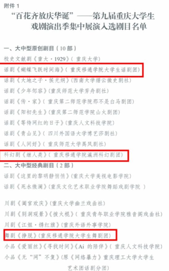 由市委宣传部、市教委、市文化旅游委、市文联主办,市剧协承办的“百花齐放庆华诞”第九届重庆戏剧演出季校内公演环节已经结束,经过专家评审,我校大型原创话剧《蝴蝶飞跃时间海》、原创舞剧《挣脱》、原创科幻剧《继人类》三部作品入围。三部作品将于11月上旬进行集中展演,为观众们送上一场艺术盛宴。每一部作品都是创作者心血的凝萃,每一次演出都是师生们汗与泪的挥洒,祝福每一部入围的作品在舞台上尽情的绽放!