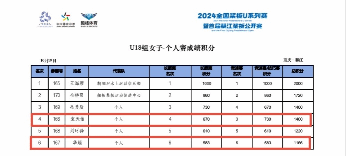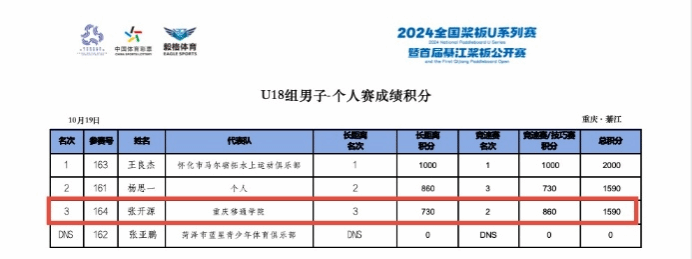 张开源选手获得U18男子组第三、袁天怡选手获得U18女子组第六名、华娟获得U18女子组第六名、何佳选手获得公开女子组第八名。