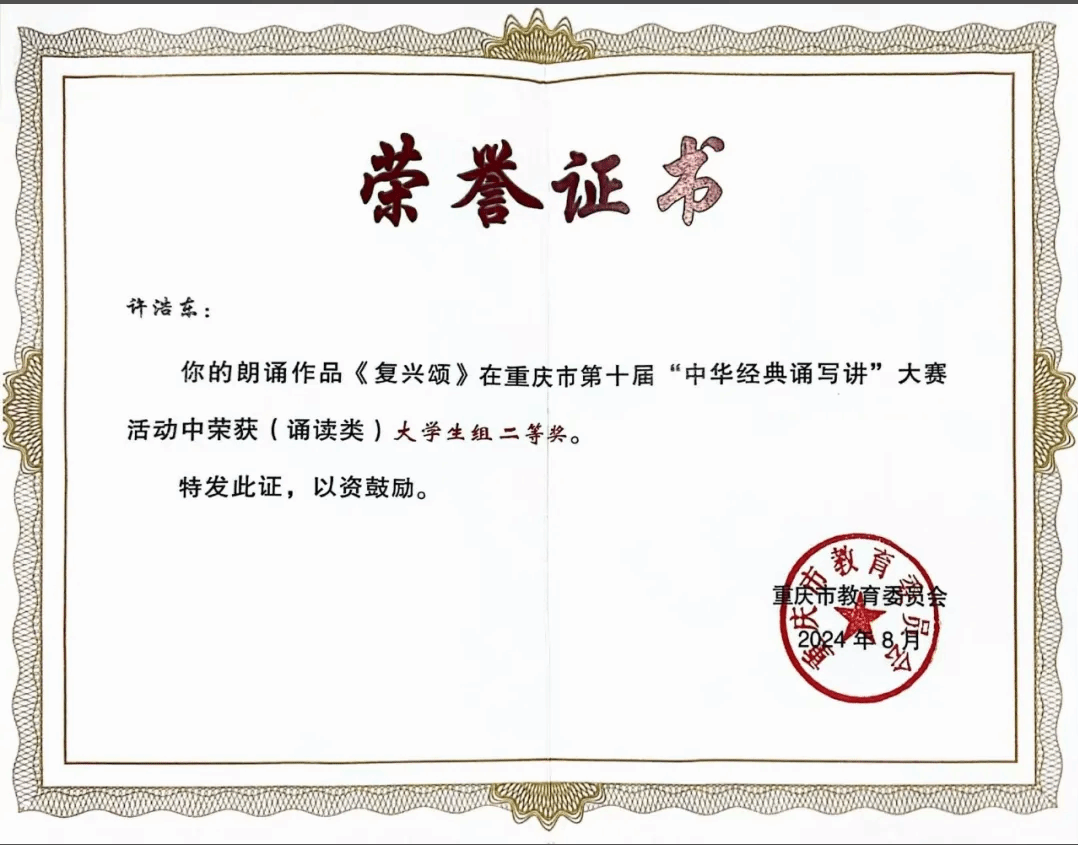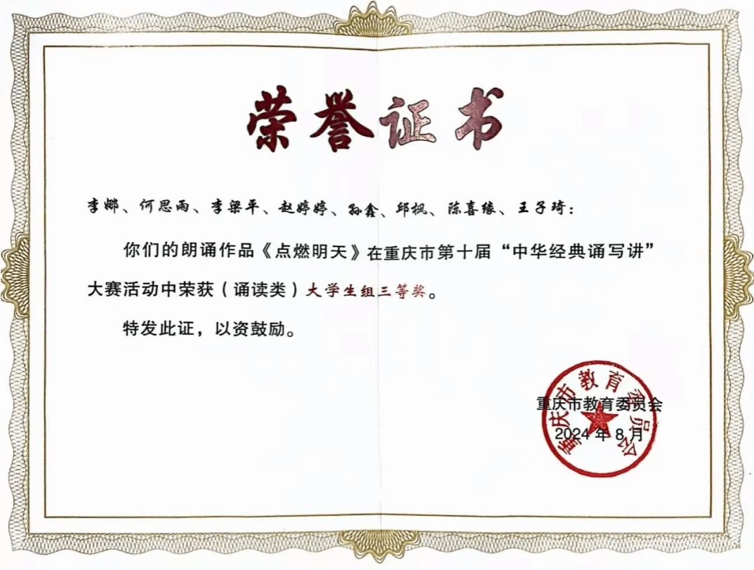 近期,由重庆市教育委员会、重庆市语言文字工作委员会共同主办的重庆市第十届“中华经典诵写讲”大赛活动朗诵比赛中,在艺术教育中心佟晓雅老师的指导下,我校学生许浩东朗诵作品《复兴颂》荣获大学生组二等奖、李娜、何思雨、李梁平、赵婷婷、孙鑫、邱枫、陈喜缘、王子琦朗诵作品《点燃明天》荣获大学生组三等奖。在整个比赛过程中,参赛作品选取了具有社会影响力和典范价值的经典朗诵作品,发挥了艺术实践教育对于学生精神引领的辐射带动作用,展现我校学生青春洋溢、向上向善的青春正能量的同时,更是我校艺术教育成果的收获与体现。未来,我校将继续践行特色育人模式,不断创新与探索,培养出更多优秀的“非科班”艺术人才,收获更多艺术硕果。