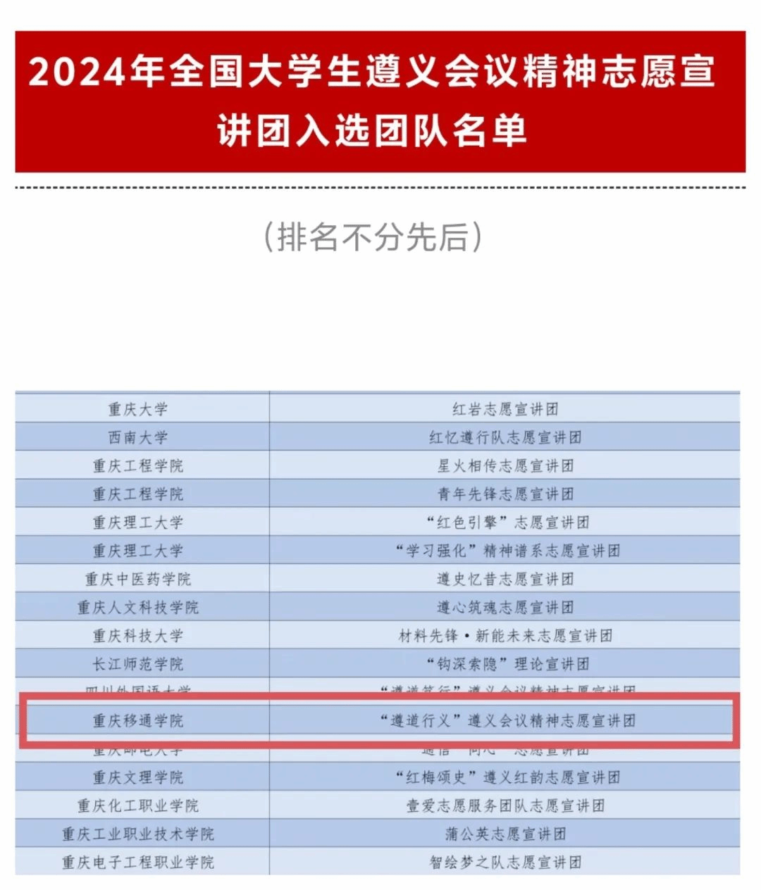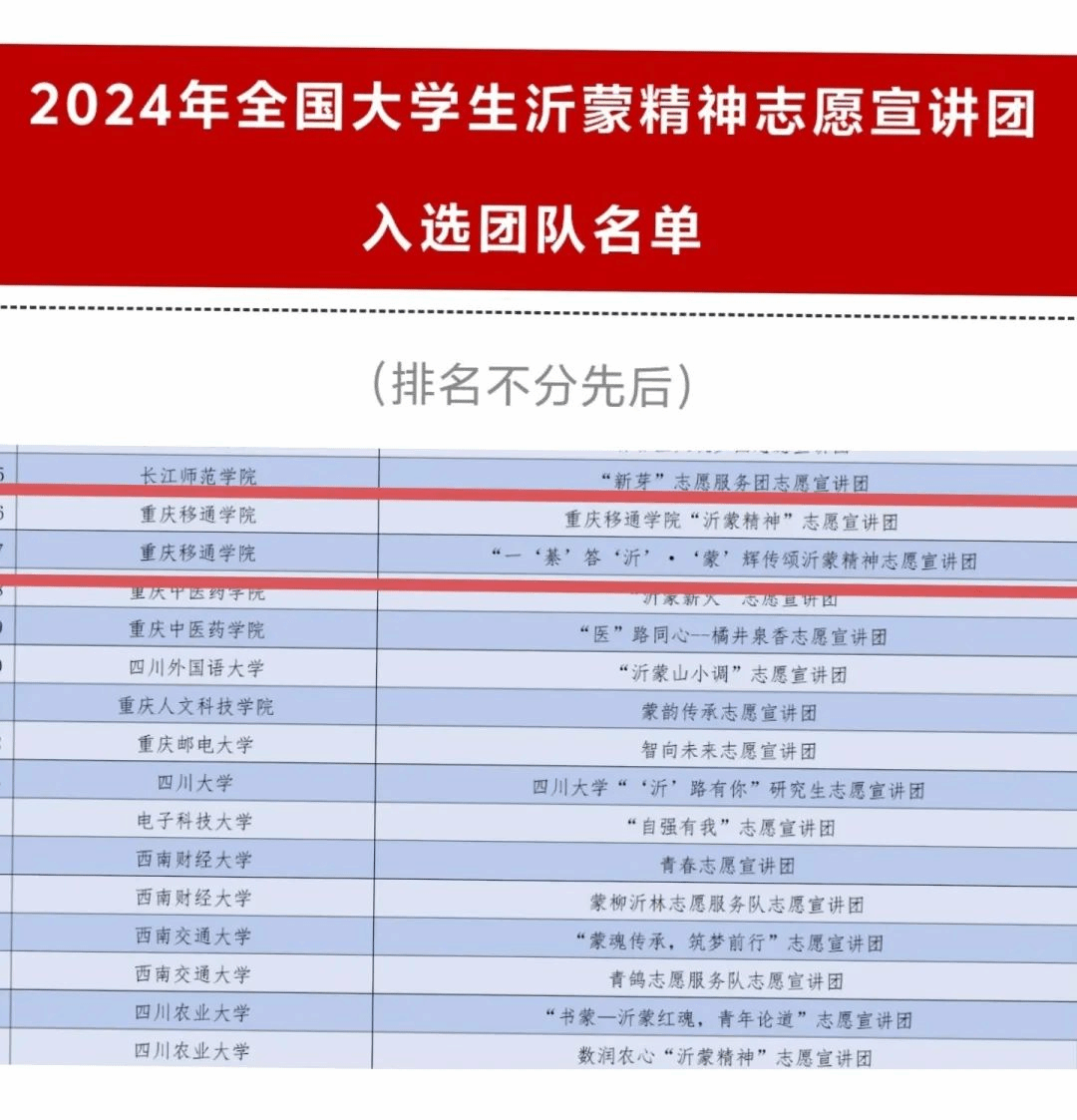 由团中央青年志愿者行动指导中心等单位联合发布了《关于遴选2024年全国大学生沂蒙精神志愿宣讲团的公告》和《关于遴选2024年全国大学生遵义会议精神志愿宣讲团的公告》,重庆移通学院校青联“沂蒙精神”青年宣讲团,大健康管理学院一“綦”“沂”·“蒙”辉传颂沂蒙精神宣讲团和“遵道行义”遵义会议精神志愿服务宣讲团成功入选!
