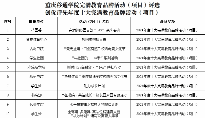 为进一步加强完满教育活动质量提升,不断做好“完满教育质量建设”和“基层组织活力提升”两大主题工程,完满教育委员会组织开展完满教育品牌活动(项目)评选工作,12月18日,完满教育委员会办公室组织开展2024年度十大品牌活动(项目)终选答辩工作。由双校区完满教育职能部门负责人及骨干教师代表,校院两级完满观察团代表共同组成评审团,对参评项目答辩进行打分。现将2024年度十大完满教育品牌活动(项目)进行公示。