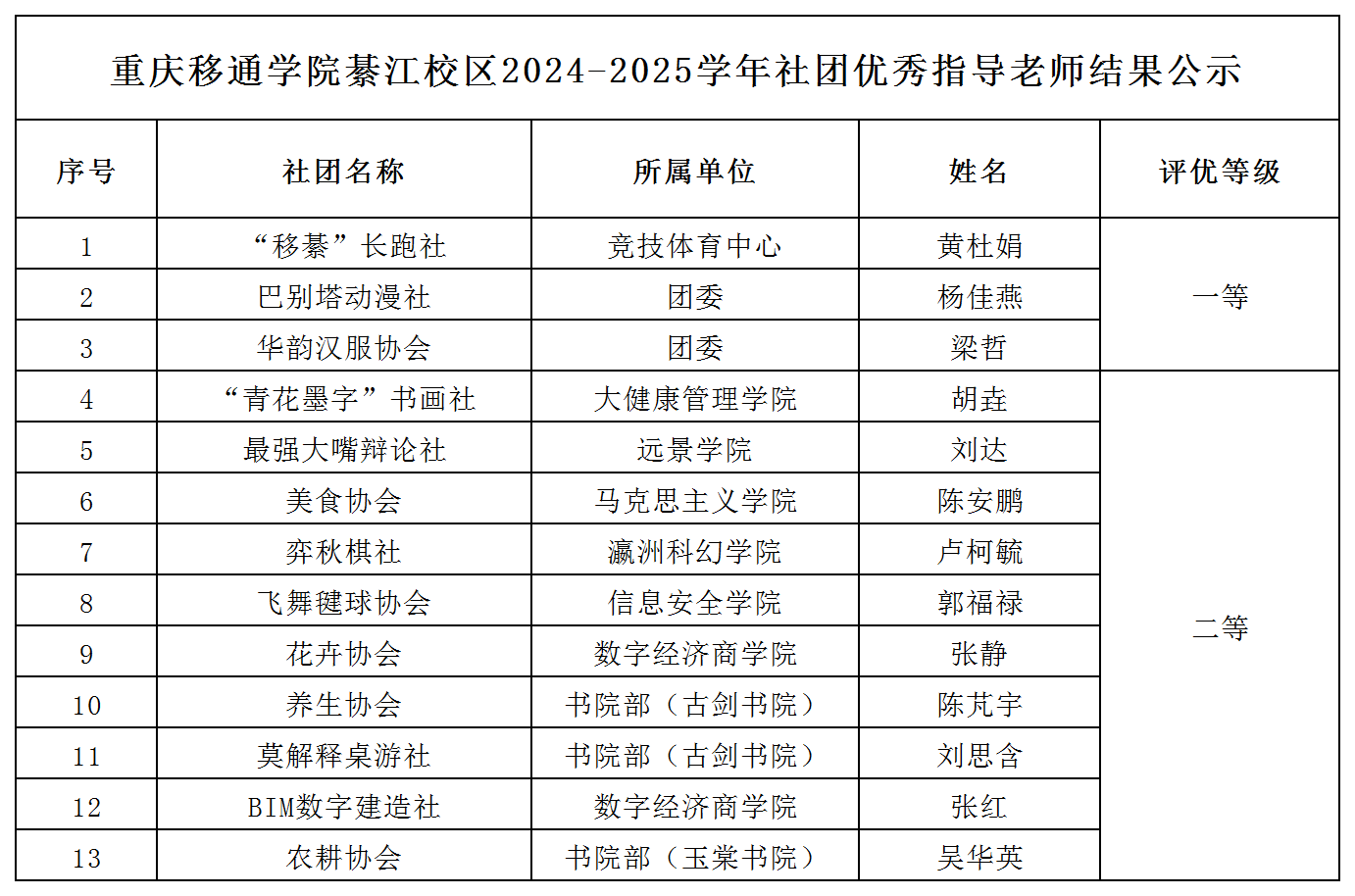 公示期为期3天,公示期间如有异议,请联系校团委社团发展中心(綦江校区)蒋莉老师,联系电话:023-48299520。