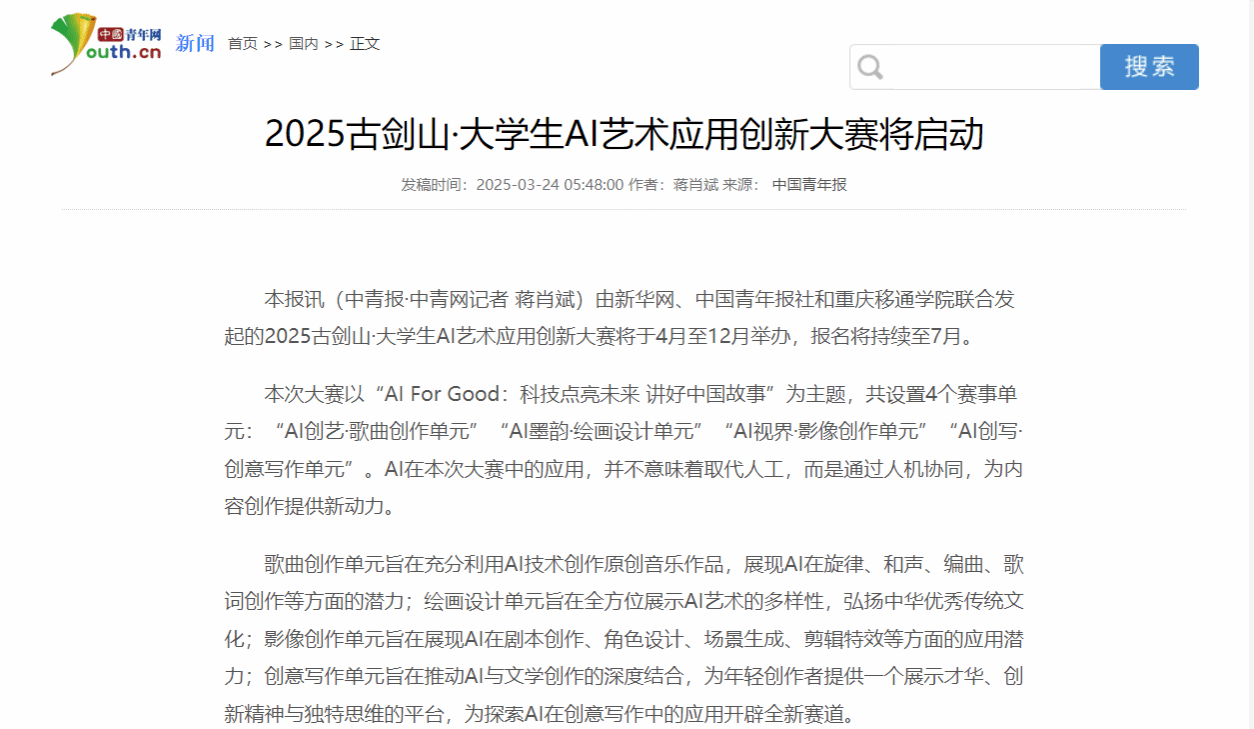 中国青年网:2025古剑山·大学生AI艺术应用创新大赛将启动