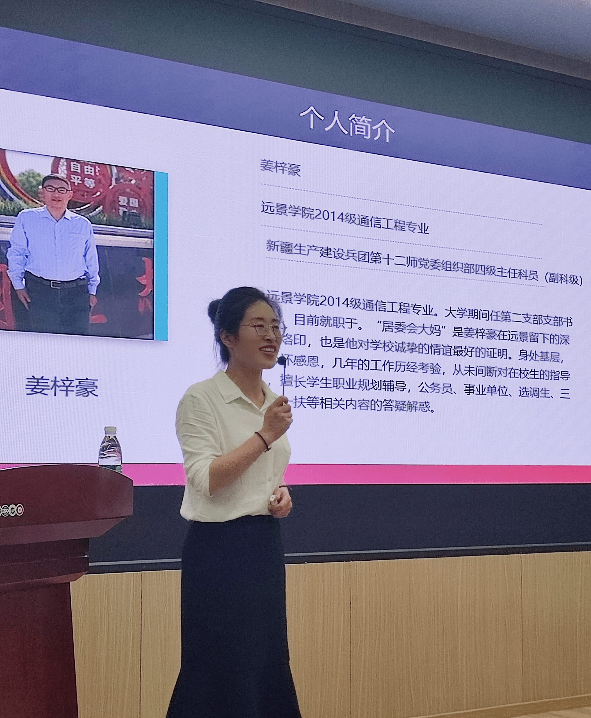 活动伊始,远景学院学工办主任郭淼老师介绍了本次活动的背景及意义,同时她讲到,经过前期调研学生需求,郭老师发现很多学生对于公考的了解比较浅显和片面,所以特别邀请在新疆生产建设兵团第十二师市委组织部工作了4年的姜梓豪校友为同学们分享他的考公经历、职场感悟等。