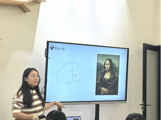 紧接着,许老师通过分析西方经典艺术作品《蒙娜丽莎的微笑》以及传统中国水墨画的构图引入“黄金分割”的概念,并结合视频分析了黄金分割的数学原理,揭示了令人着迷的美学奥秘。在老师的引导下,学生转换思维,以数学维度去鉴赏这些艺术作品,真切体会到数学黄金比例在艺术创作过程中对塑造美感所具有的不可或缺的影响力。