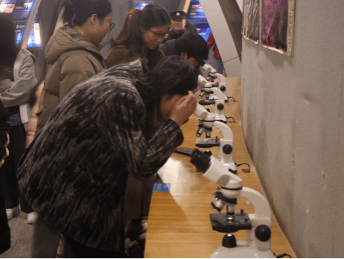 步入二楼地质展厅,同学们首先在木化石切片观察区通过显微镜细致地研究了古树化石细胞的结构。随后,李佳怡老师为同学们详细讲解了硅化木的形成过程,并阐述了綦江地区木化石资源丰富的原因及其所蕴含的古地理环境信息。李老师指出,当树木因泥石流、火山爆发等自然灾害被迅速掩埋后,若长期处于高湿度环境中,地下水中的硅化合物会逐渐渗入木材,替换掉其中的碳元素。一旦硅元素完成对碳元素的置换,这些树木便转化为硅化木。此外,李老师进一步说明,綦江地区的硅化木反映了该地区古生代时期的气候条件比现今更为炎热和潮湿。