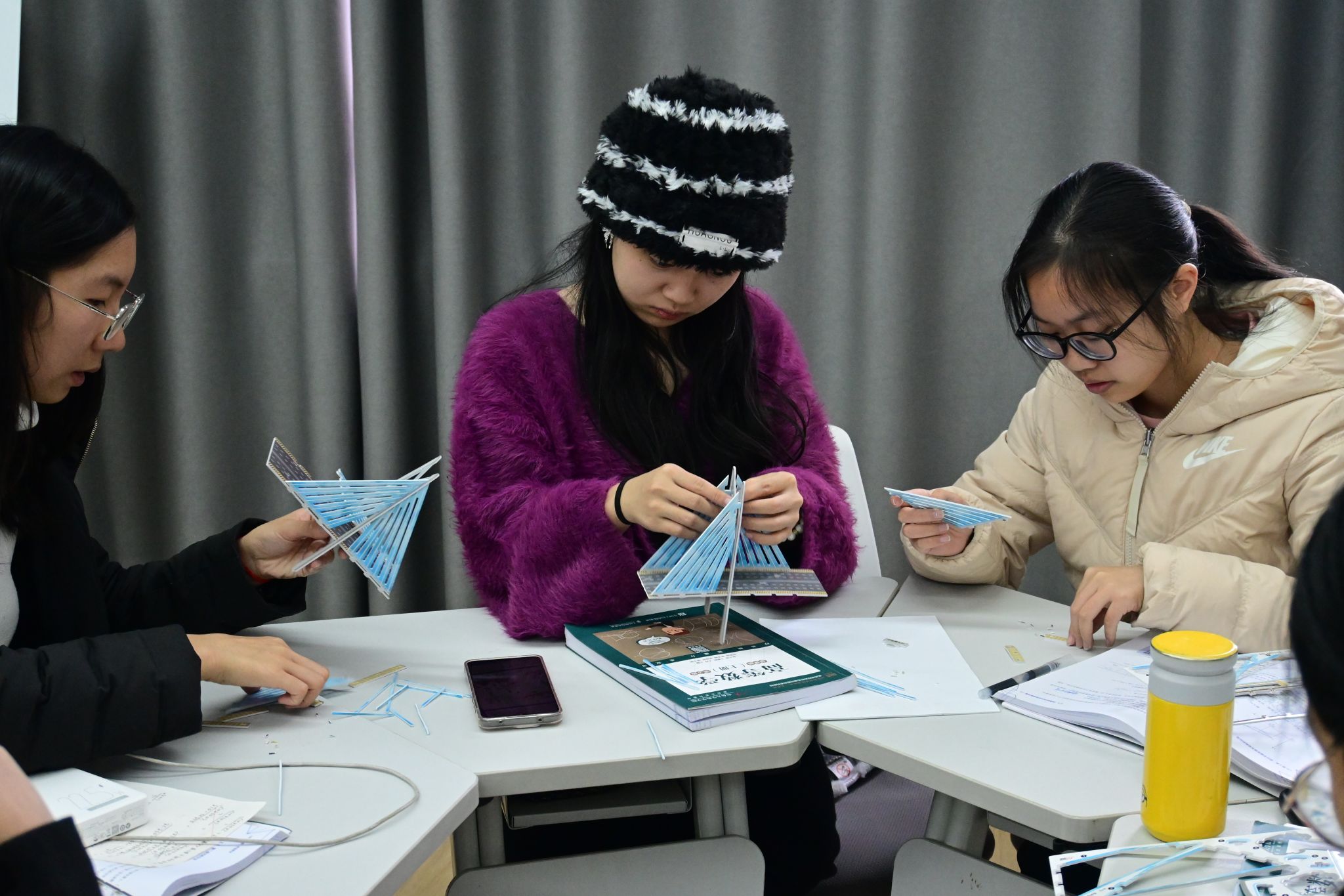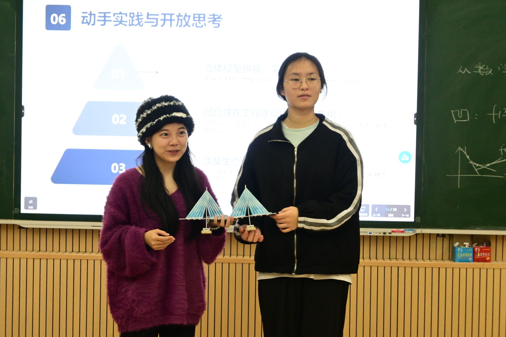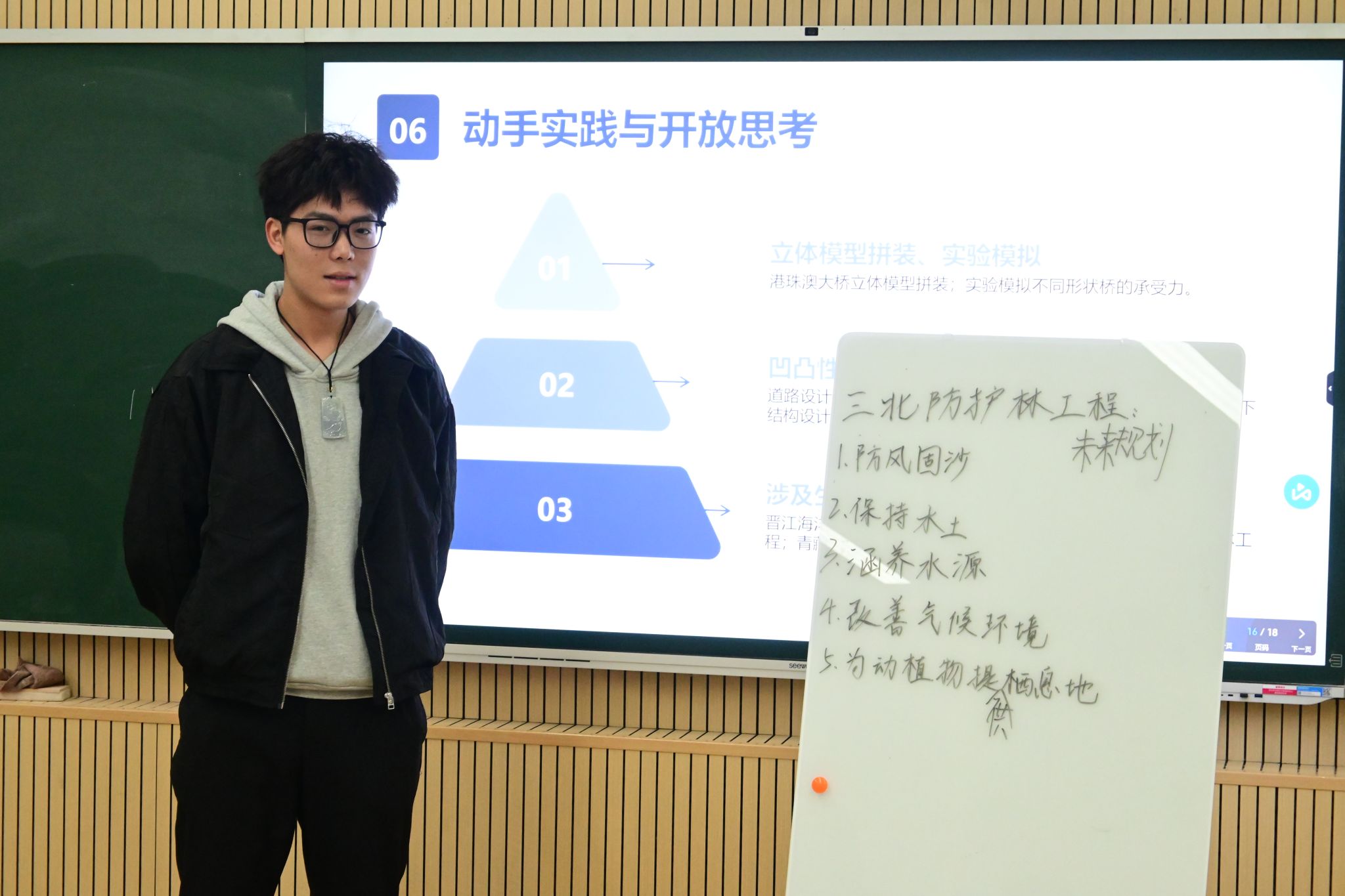 课程的最后环节,学生以小组为单位展开实践和讨论,进一步深化对跨学科知识的理解。有的小组实践拼装港珠澳大桥的立体模型,形象展现桥梁设计之美;有的小组模拟不同形状桥梁的承受力,探讨结构设计的优化;还有的小组分享了凹凸排水板在解决地面排水问题中的应用;甚至有小组讨论了三北防护林工程对生态保护的重大意义。这些丰富多彩的展示,不仅体现了学生的创新能力和实践精神,也深化了他们对跨学科应用的理解。
