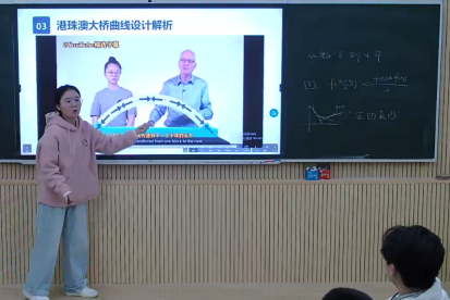 随后,曹老师从建筑稳定性、成本控制、行车安全和生态保护等多角度剖析了港珠澳大桥的曲线设计,并通过视频展示了为了保护中华白海豚以及适应自然环境所投入的巨大努力。这些设计不仅体现了严谨的数学思维,更蕴含了儒家“仁者爱人”的博大情怀,让学生深刻感受到数学与人文精神的融合。
