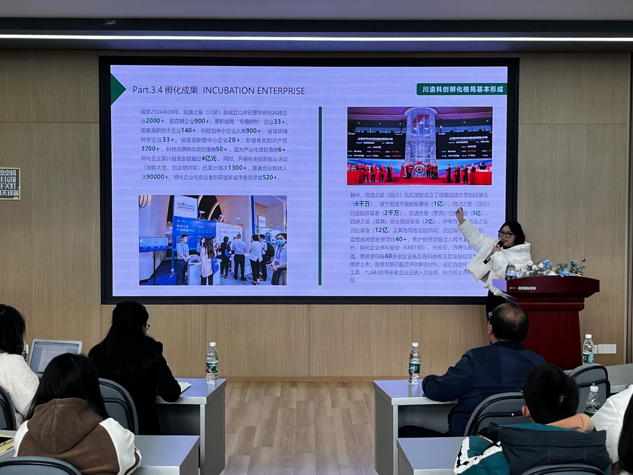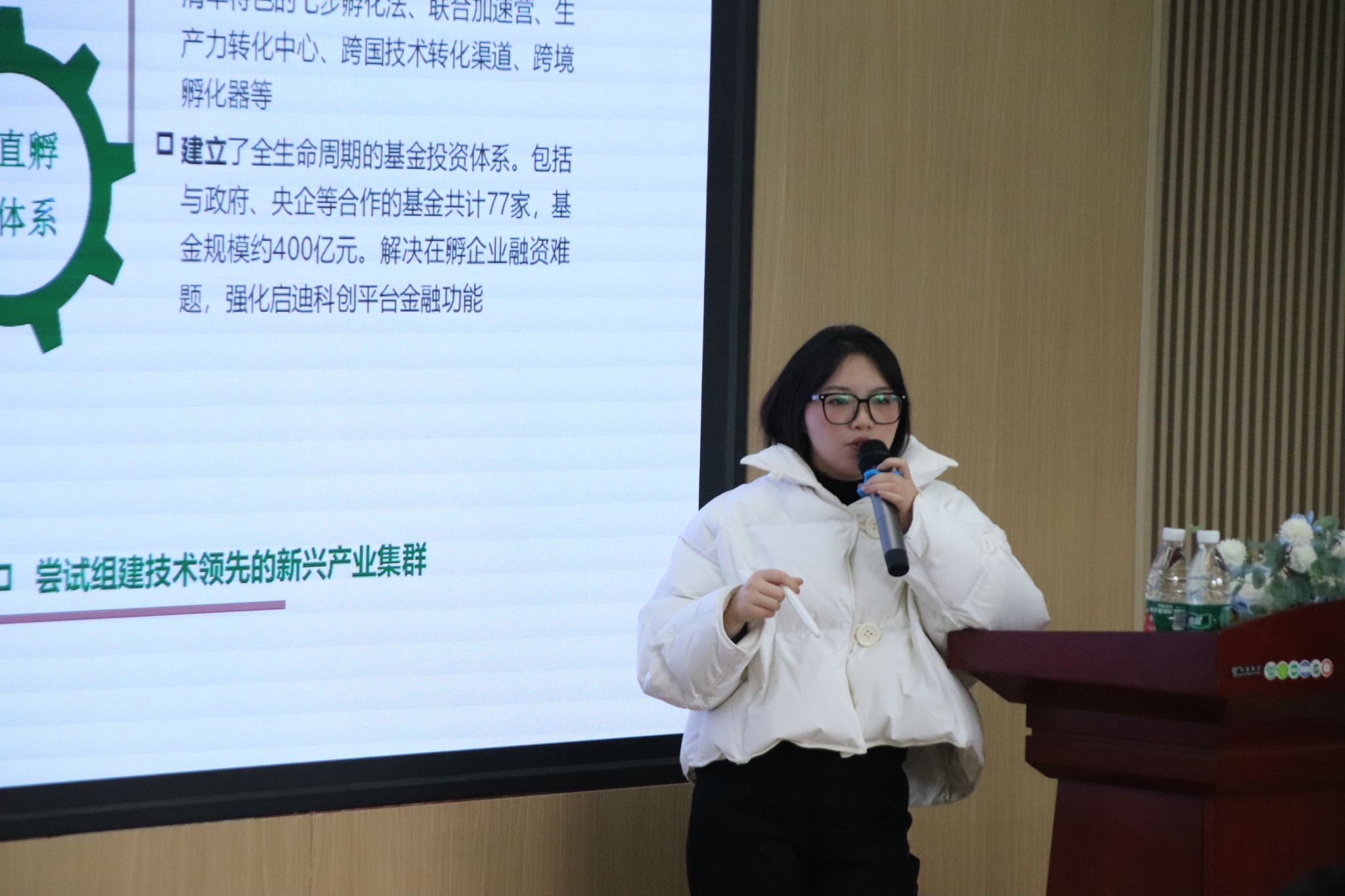 接着,陈相竹重点介绍了启迪之星在川渝地区的布局和发展情况,讲述自己毕业后反哺家乡“永川”的经历。启迪之星在成渝经济区布局了近20个创新节点,现已成为成渝经济区规模最大的创新孵化网络。她针对创新案例和地区的特色进行了深入分析,并以生动的方式向学生们进行讲解。其中,陈相竹对家乡永川区的启迪创新基地有着深刻的见解,提出永川作为以市域副中心城市以及全中国数一数二的职教基地、制造业基地,有着极大的创新前景。同时陈相竹正在努力寻求与高校合作的契机,并且希望利用这一平台能带领更多移通学子走上光明的职业道路。