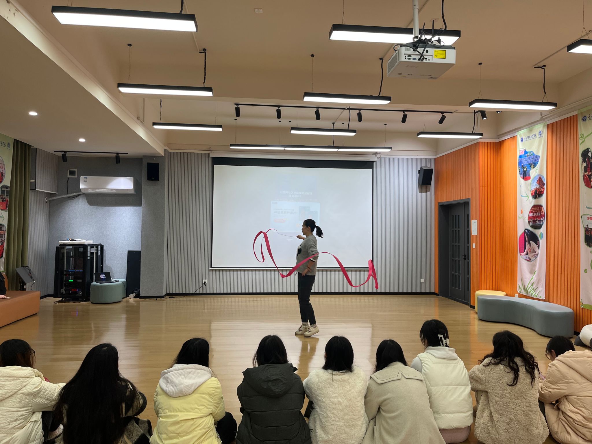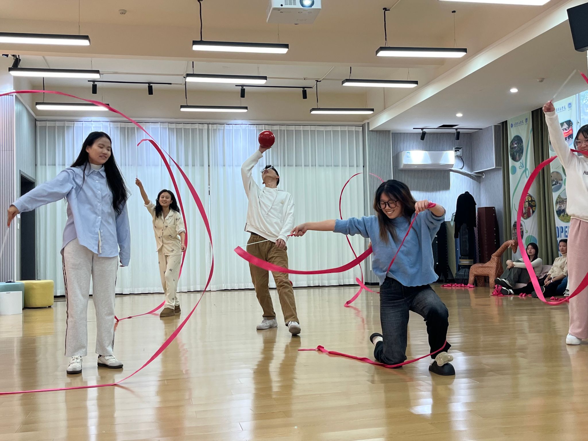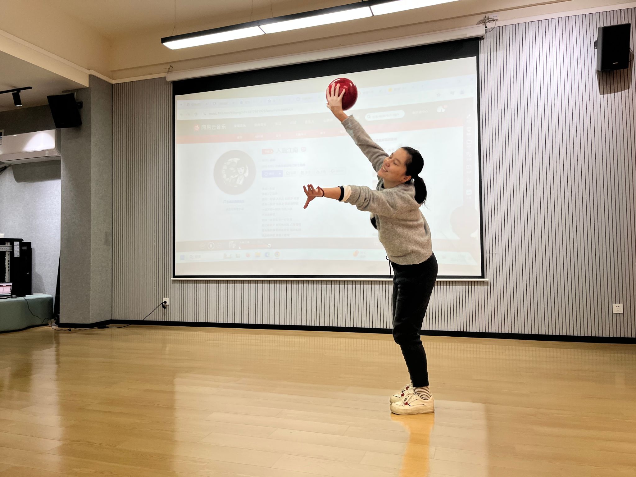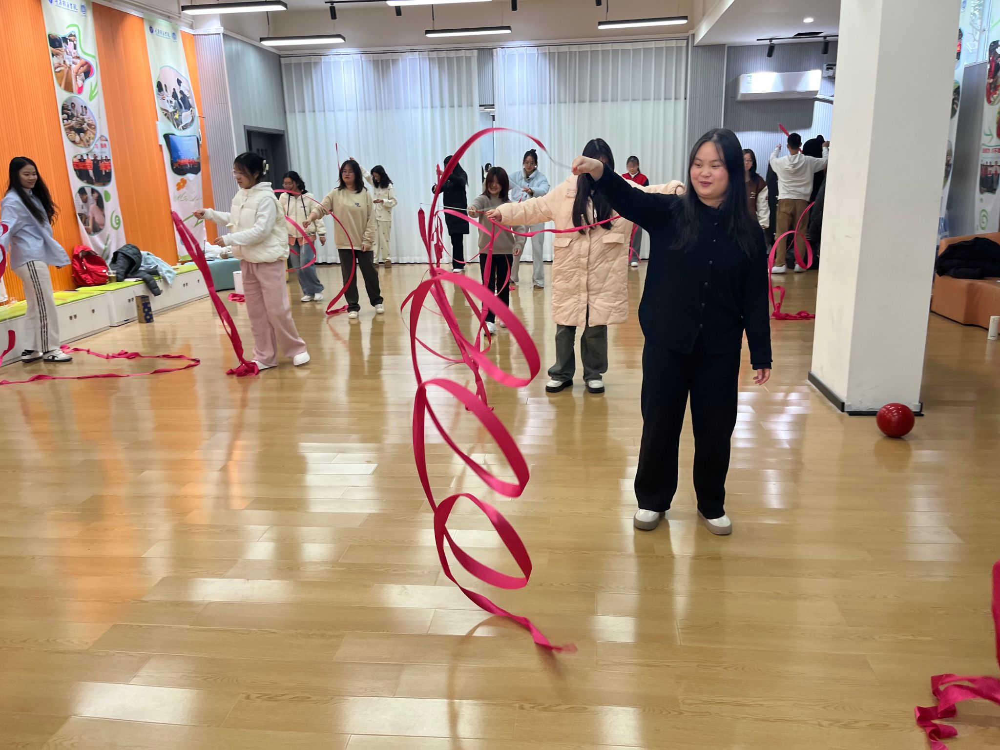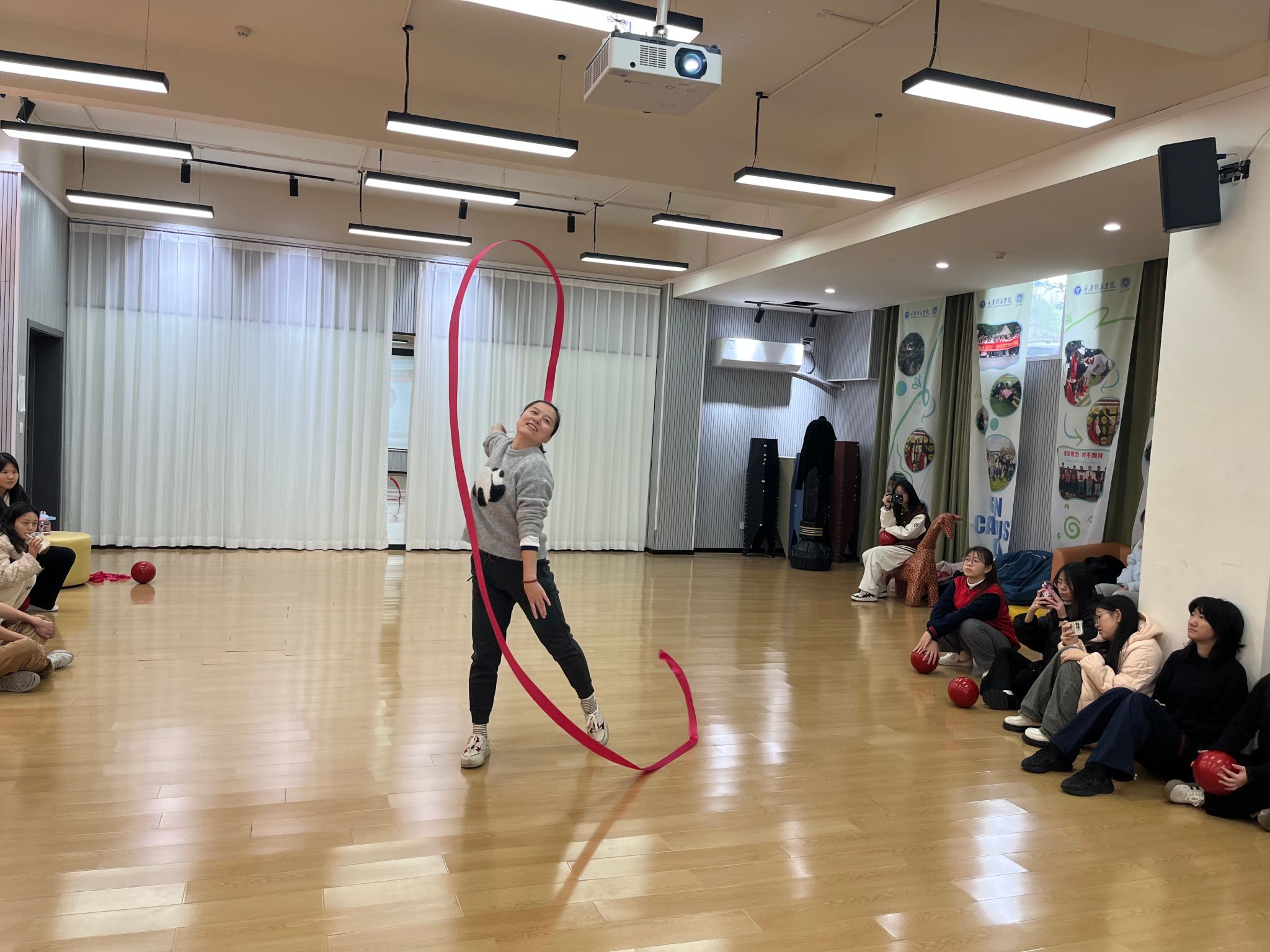 在课程的第二阶段,刘曼丽老师不仅详尽地讲解了体操彩带和体操球的基本技巧,还亲自示范,伴随着悠扬的旋律,献上了一段令人难忘的现场表演。她的每一个动作都流露出优雅与力量的完美结合,精湛的技艺和柔美的身姿深深打动了在场的每一位学生。这种美的展现,不仅激发了学生们的热情,也促使他们迫不及待地投身于花样练习之中,尝试着将所学技巧融入自己的动作之中。