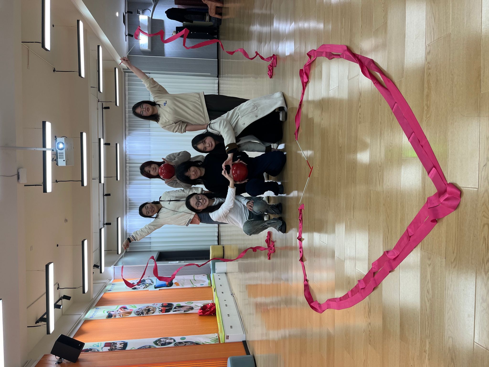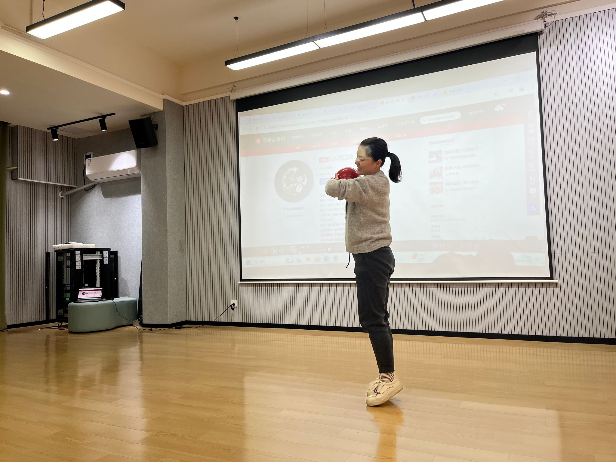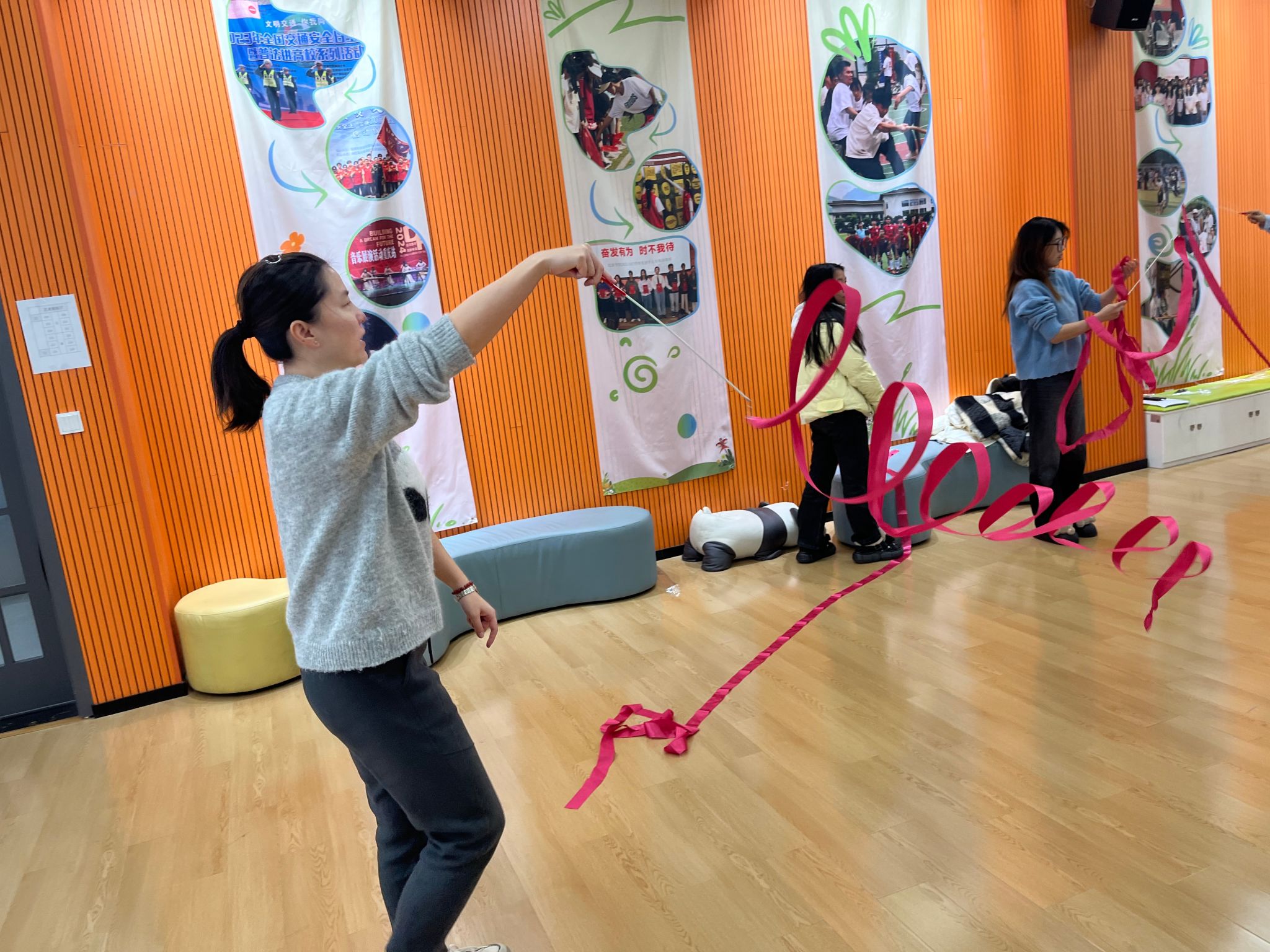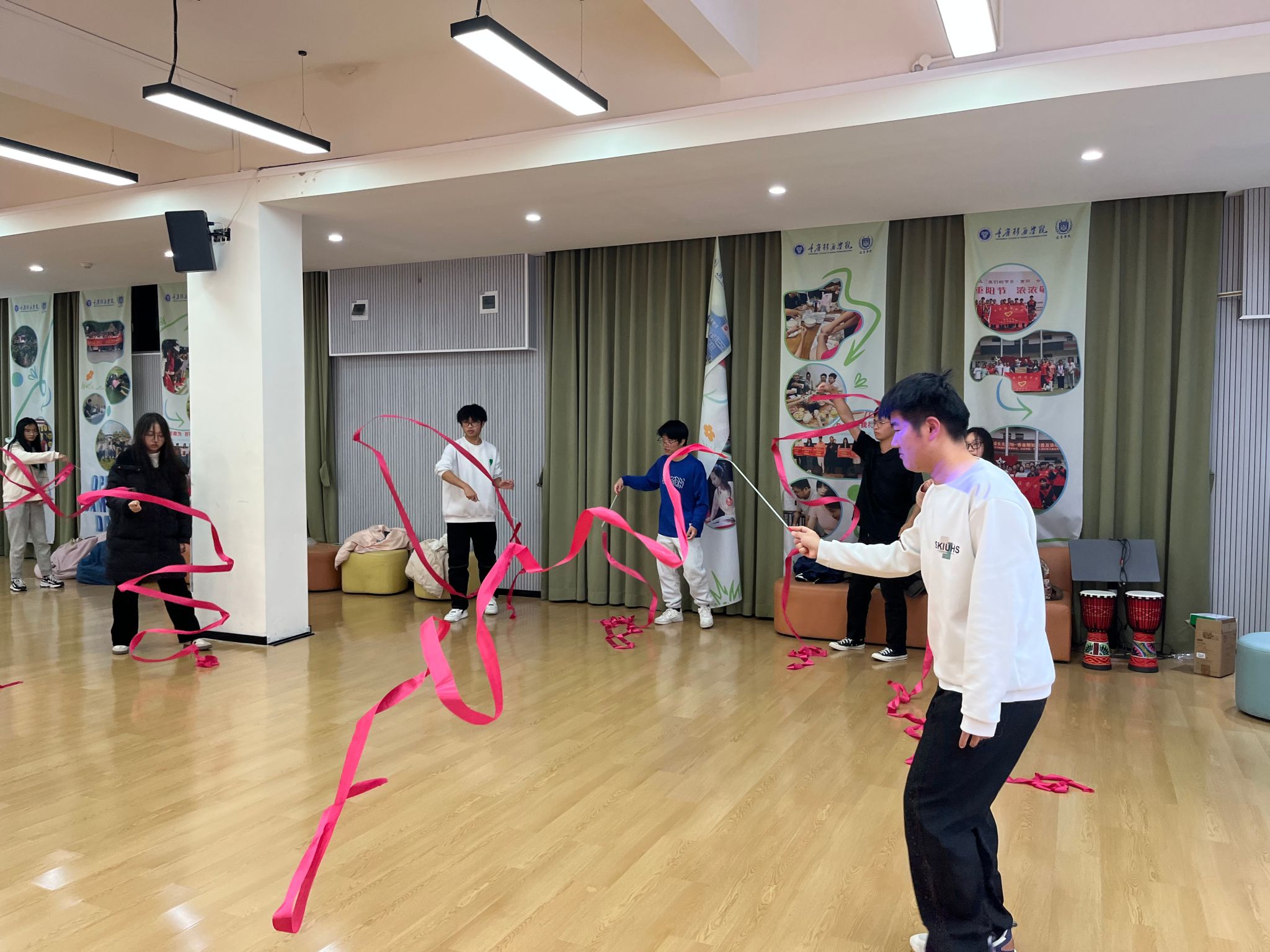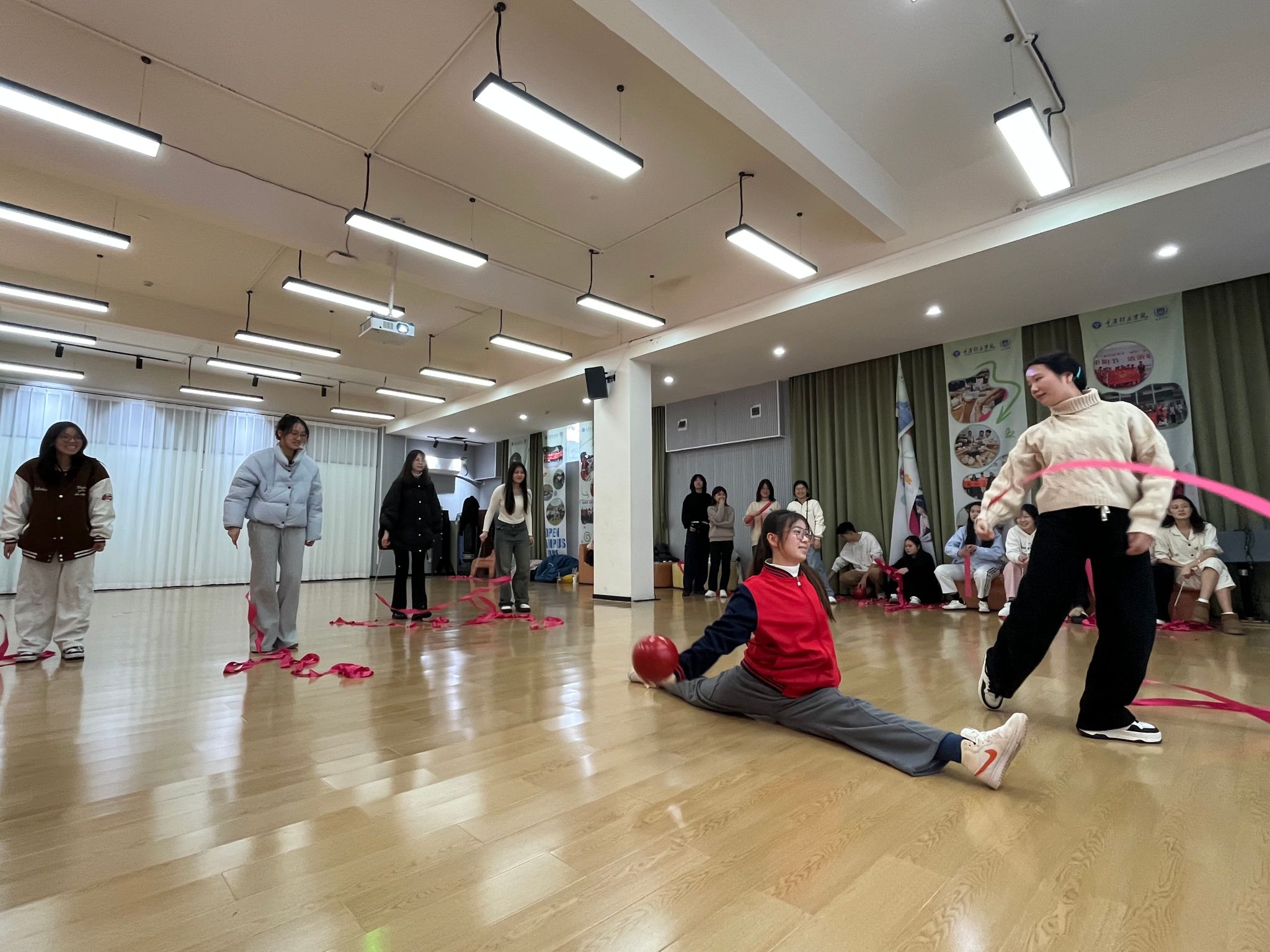 在课程的第二阶段,刘曼丽老师不仅详尽地讲解了体操彩带和体操球的基本技巧,还亲自示范,伴随着悠扬的旋律,献上了一段令人难忘的现场表演。她的每一个动作都流露出优雅与力量的完美结合,精湛的技艺和柔美的身姿深深打动了在场的每一位学生。这种美的展现,不仅激发了学生们的热情,也促使他们迫不及待地投身于花样练习之中,尝试着将所学技巧融入自己的动作之中。