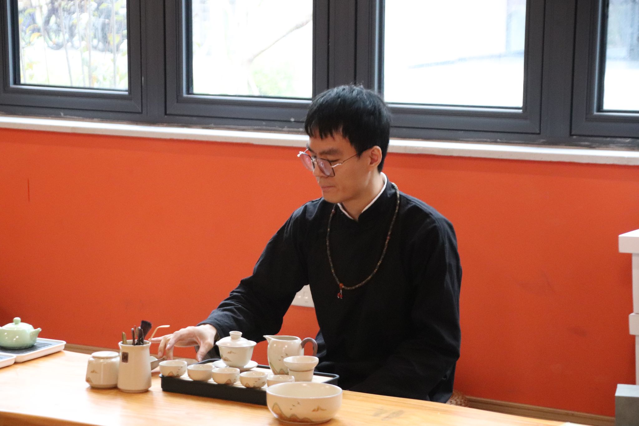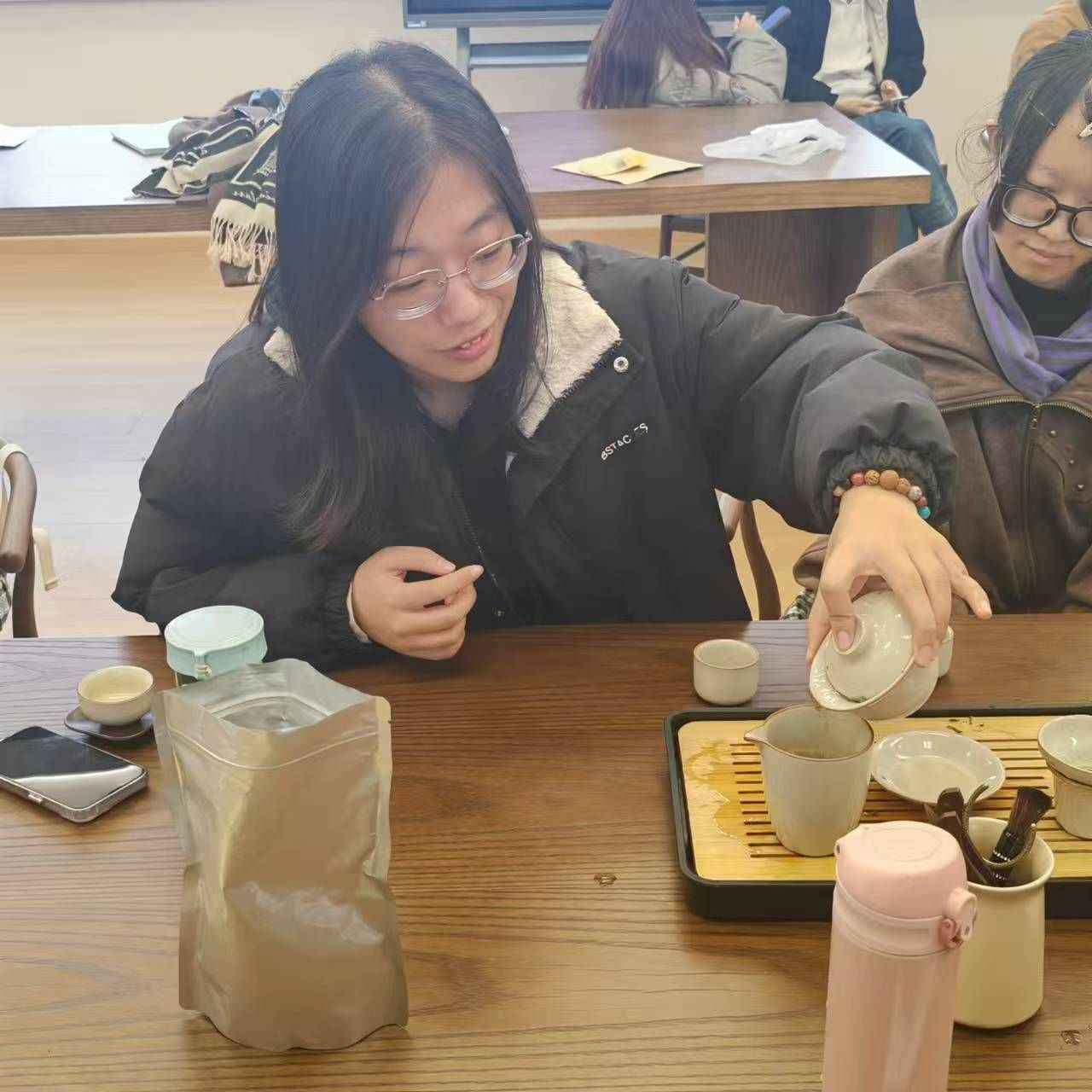 实践伊始,胡老师为同学们讲解茶具的历史发展、艺术特色与美学特质,然后为同学们进行示范,讲解诸多茶具的名称以及使用方法。随后,同学们开始着手尝试,体验泡茶的每一个细腻环节。红毛峰的醇厚、碧螺春的清新、白毫银针的甘冽,在同学们的巧手中逐一绽放,茶香四溢,沁人心脾。正如唐代诗人卢仝所云:“一碗喉吻润,两碗破孤闷;三碗搜枯肠,唯有文字五千卷;四碗发轻汗,平生不平事,尽向毛孔散;五碗肌骨清,六碗通仙灵;七碗吃不得也,唯觉两腋习习清风生。”此刻,茶的韵味与诗意在同学们的心中悄然绽放。
