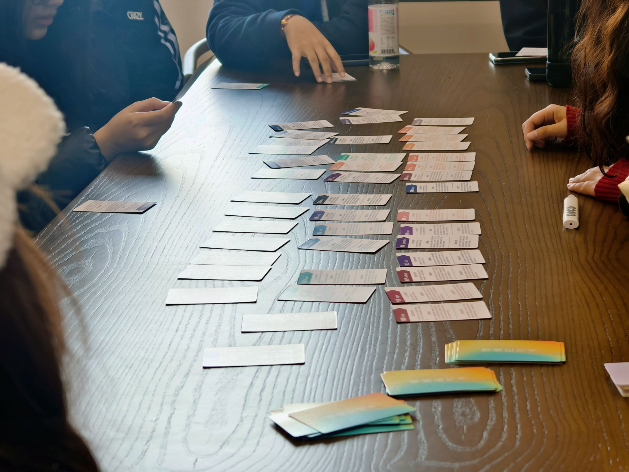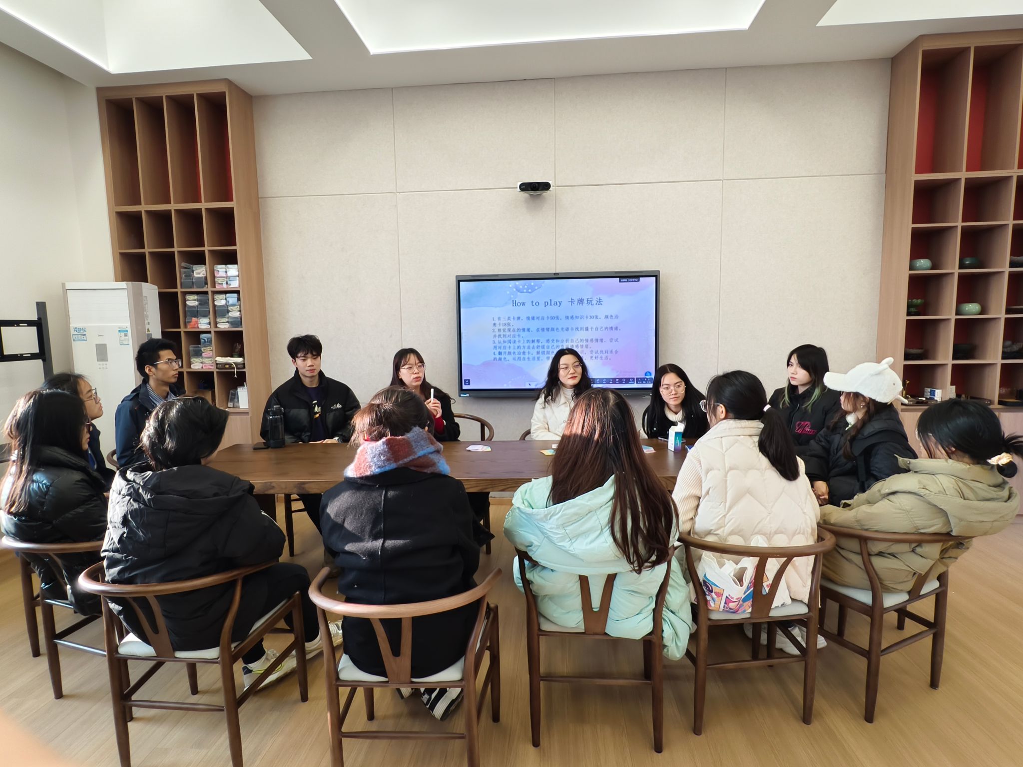 随后,杨红老师带领大家开启桌游之旅,详细介绍了玩法。此次桌游包含三类卡牌,其中情绪对应卡 50 张,能精准对应各种情绪;情感知识卡 30 张,承载着丰富的情绪相关知识;颜色治愈卡 18 张,蕴藏着颜色与情绪调节的冷知识。在正式游戏环节,参与者纷纷静下心来,在杨红老师的引导下“你们现在的心情是怎么样的呢?”“大家围坐按照自己现在的内心感受选出属于自己的情绪卡吧。”活动现场大家纷纷沉静下来,开始与自己的内心对话,深入感受当下自己内心的情绪,在情绪颜色光谱卡中挑选出那张最符合当下心情的情绪卡。