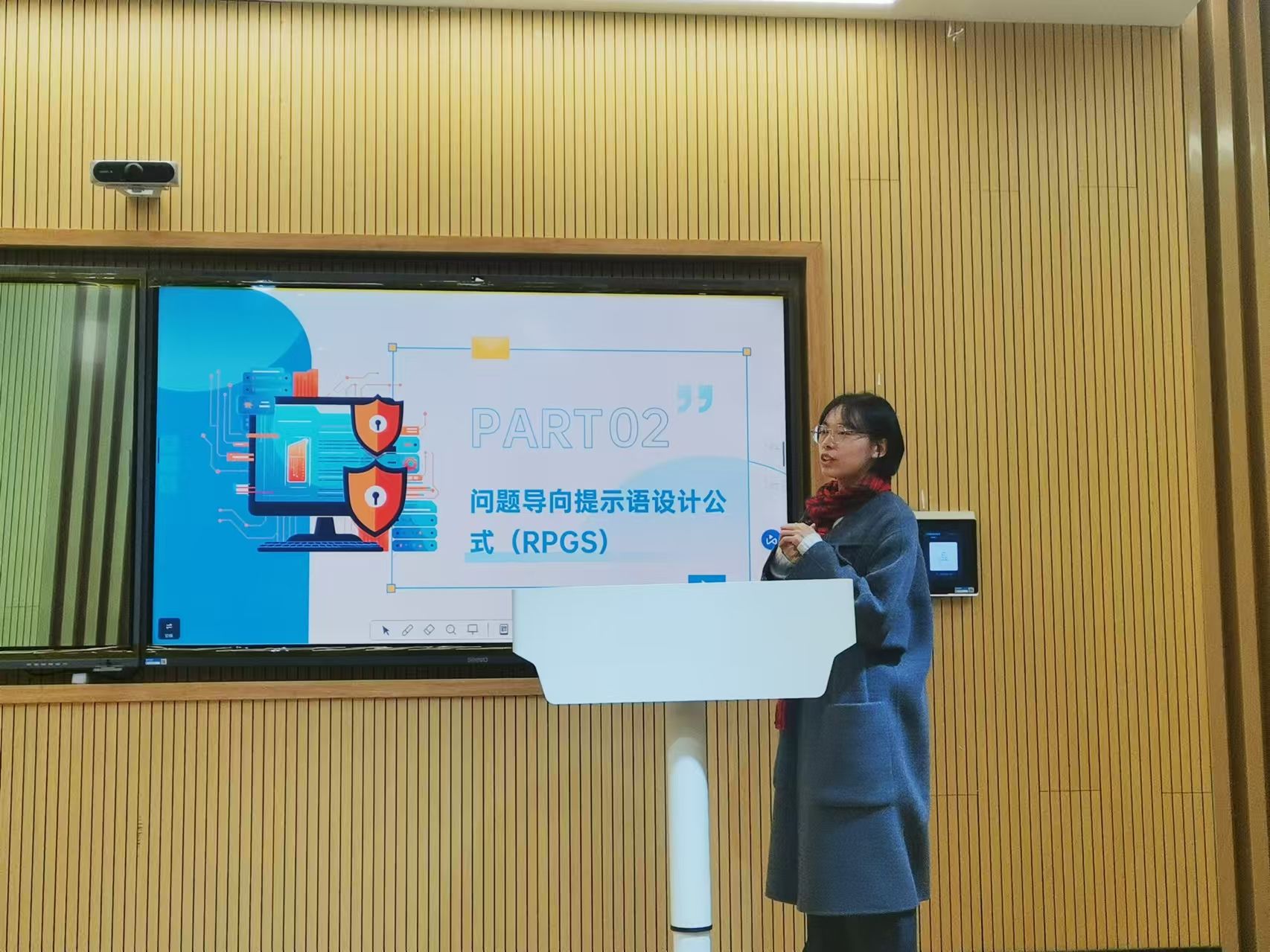 随后,邓锦莹老师分享了她和黎美茜老师参加“AI大模型与创意技术在教育及资源开发的跨界融合实操的工作坊”的培训收获。邓老师指出,在当今科技发展如此迅速的时代背景下,我们需要拥抱AI、掌握AI、运用AI。在分享中,她着重介绍了何为“问题导向提示语设计公式(RPGS)”。她提出,问题导向提示语设计公式即“角色(Role)+问题(Problem)+目标(Goal)+方案(Solution)”。邓老师进一步介绍到,RPGS通过明确关键问题,设计精炼提示语,帮助我们高效组织思维,优化工作流程。结合人工智能,我们可以将RPGS应用于教学资源的智能筛选、课程内容的个性化推荐以及学生学习进度的智能评估等。