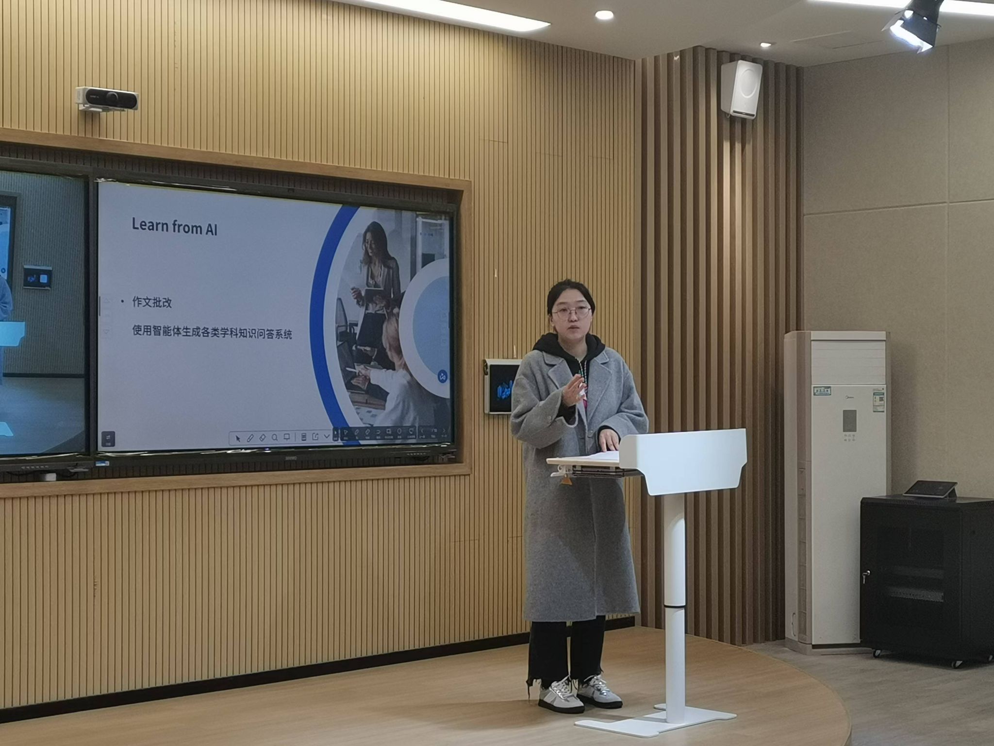 首先,朱建霖老师分享了她参加“人工智能赋能课程改革暨智慧课程建设研讨会”后的收获与感想。她提出,随着人工智能技术的快速发展,其在教育领域的应用日益广泛,但如何在享受技术带来的便利的同时,培养学生的自主学习能力,让课堂更“智能”,成为当前教育者面临的重要课题。朱老师强调,通过引入智能教学系统,我们可以实现对学生学习进度的精准追踪,为他们提供个性化的学习资源和路径规划。同时,利用AI辅助的在线互动平台,可以打破时空限制,促进师生之间的深度交流与讨论。朱老师还进一步指出,由于人工智能能辅助我们分析学生的学习数据,从而及时发现潜在问题,调整教学策略,它还能帮助我们进行更高效的课程设计与评估,确保教学内容既科学又实用。