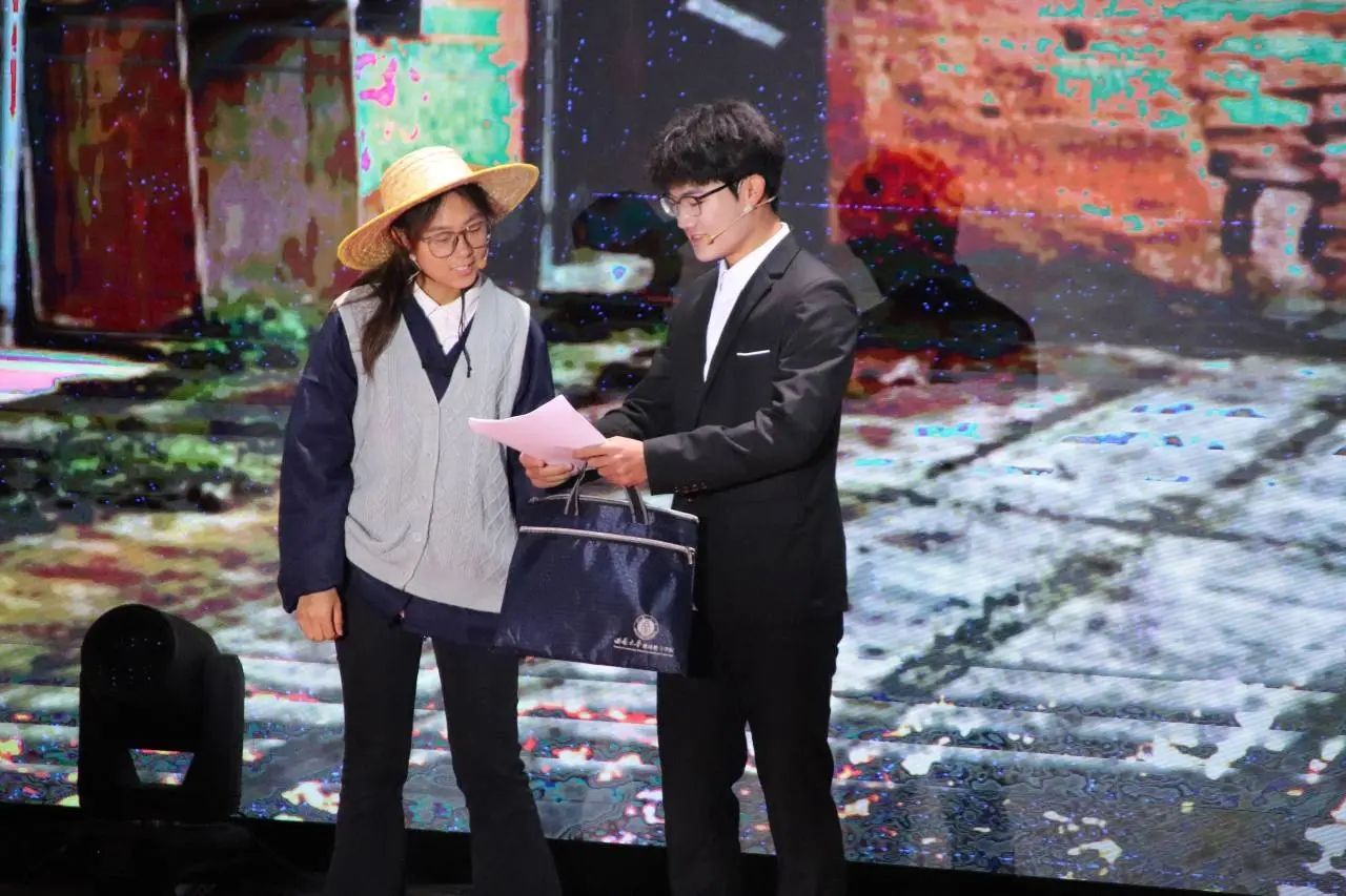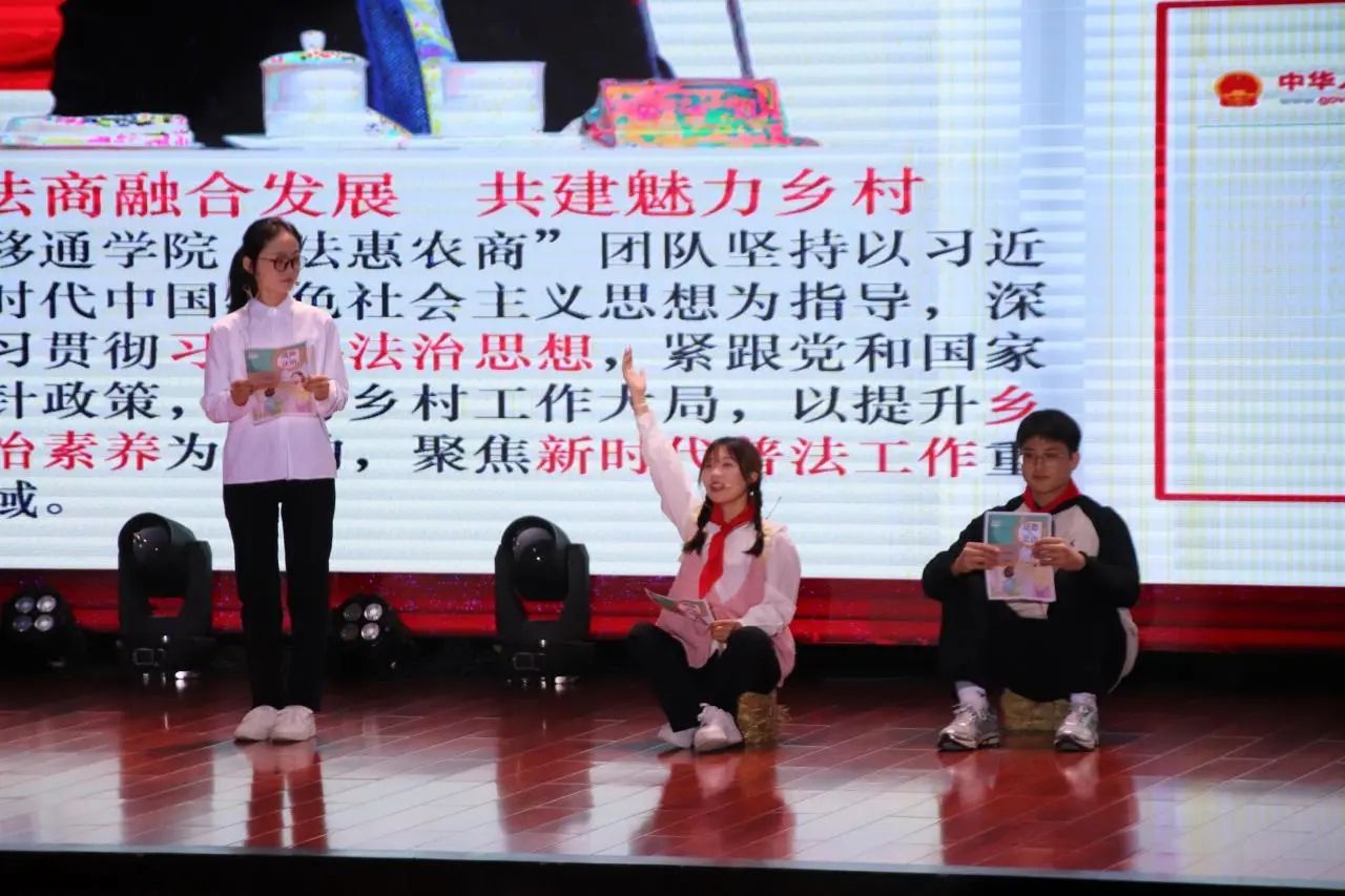 在现场的情景剧演绎环节,“法惠农商”项目团队以曾经走访贵州省遵义市播州区花茂村的故事为背景,在舞台上再现了团队成员在当地开展志愿服务的点滴经历。通过表演,他们将法治课堂、反诈宣传、非遗保护、跨境电商等内容融入其中,生动书写了中国乡村故事,展示了乡村法治建设的智慧与力量。“法惠农商”项目以法治精神振兴乡村之路,以如磐初心凝聚志愿之力,与法“綦”行,知行“合”一。