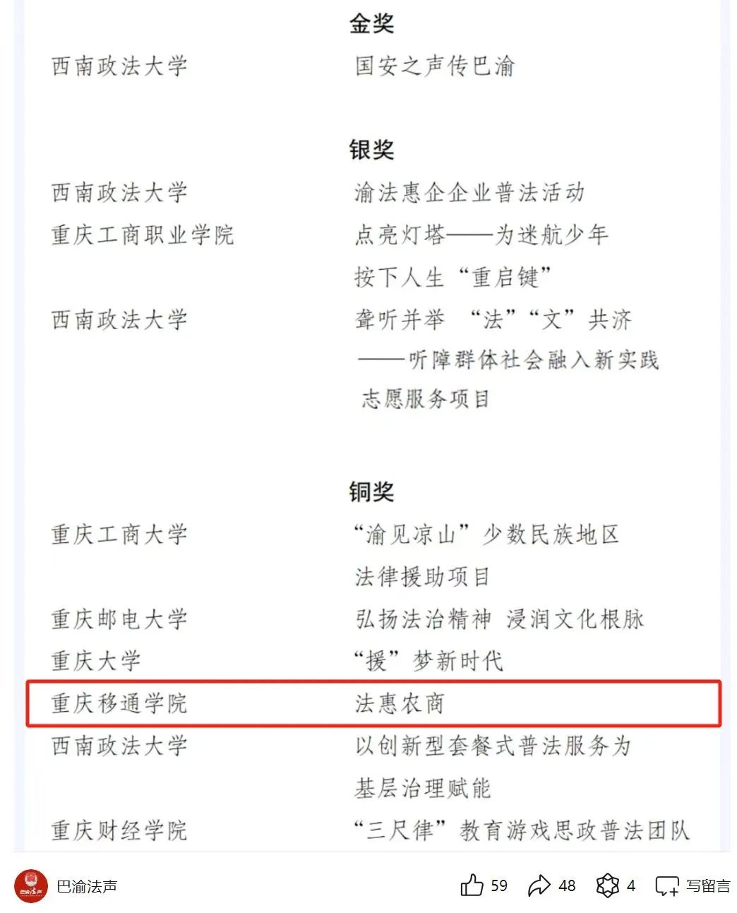 2024年11月21日,由重庆市司法局、重庆市教委、共青团重庆市委、重庆市普法办联合主办的首届重庆市大学生普法志愿服务大赛决赛在重庆工商职业学院成功举办。远景学院“星火燎原”弱势群体权益法治保障志愿服务专项支队的“法惠农商”项目团队亮相决赛现场,并荣获大赛铜奖。