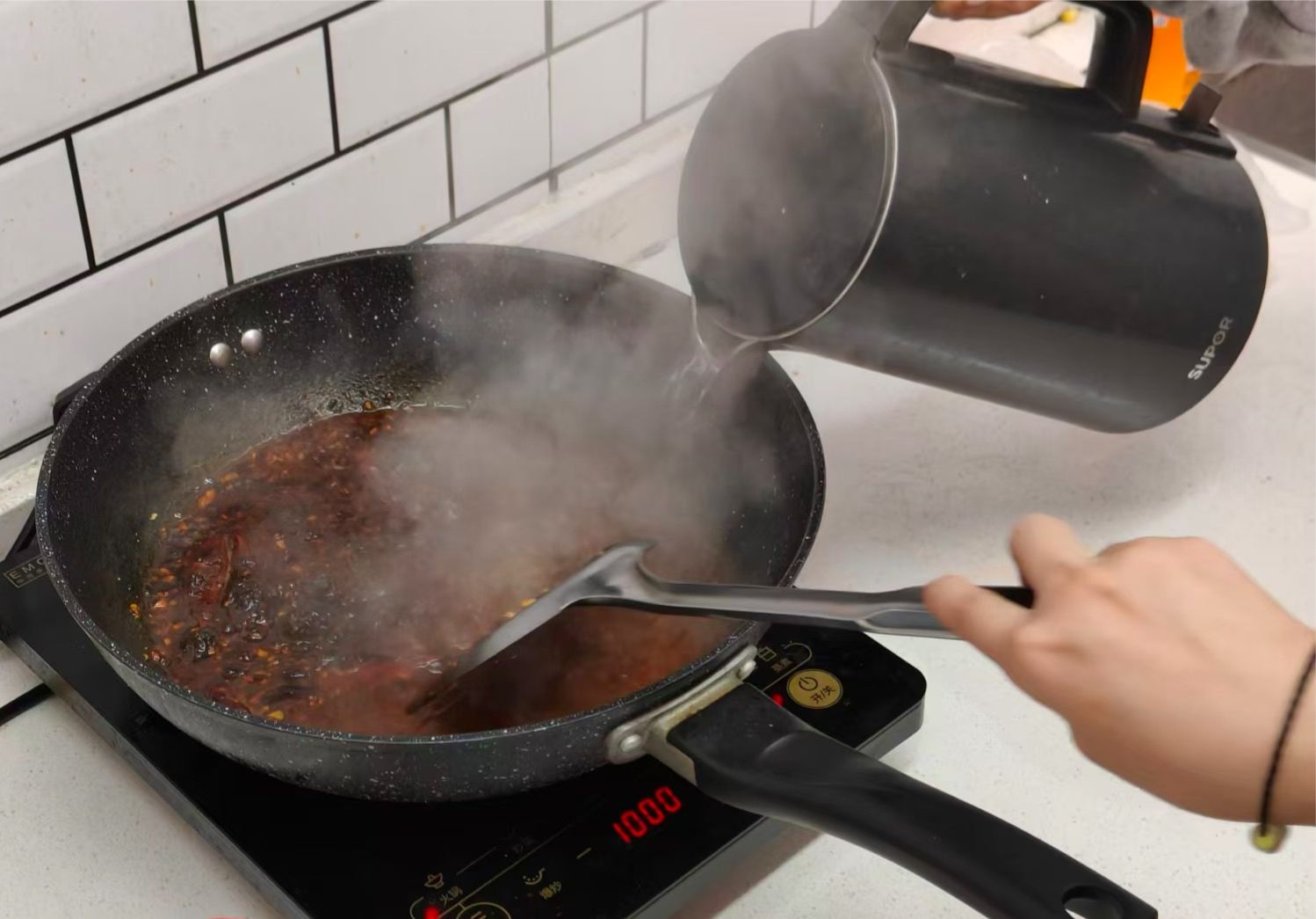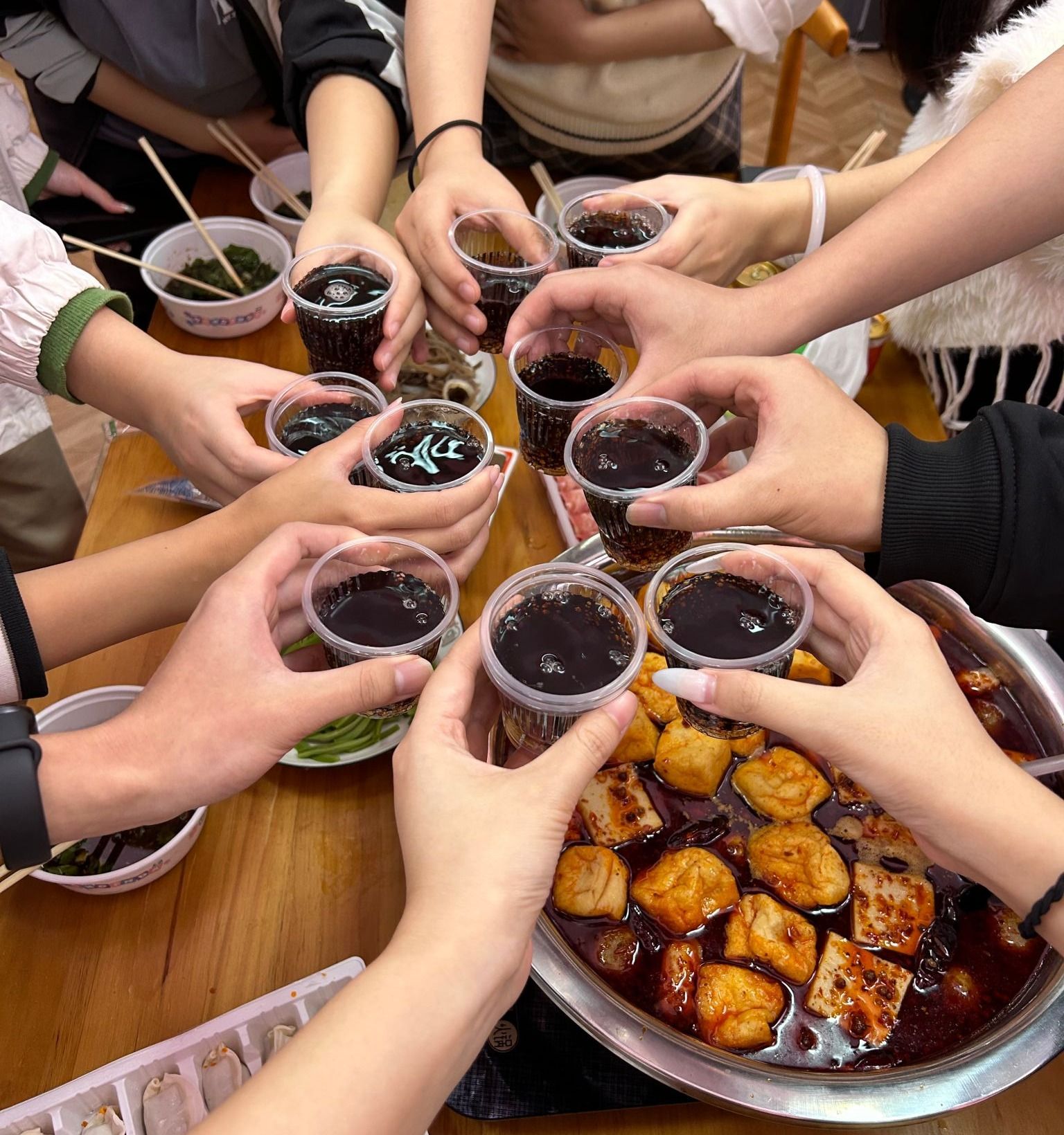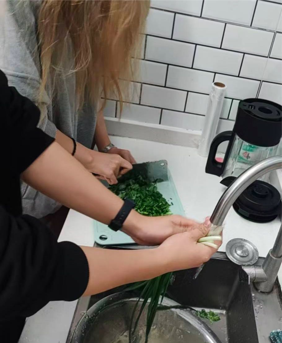活动伊始,师生们齐心协力投入到了食材准备工作中。大家各司其职,有的同学负责清洗各类蔬菜,指尖划过菜叶,水珠飞溅,像是奏响了一曲欢快的前奏;有的同学细心切配大蒜,葱等调料,为大家的油碟做着准备;有的同学在热气腾腾的电磁炉前,调配火锅底料。厨房内欢声笑语不断,即便外界寒冷,这里却洋溢着一股暖流。