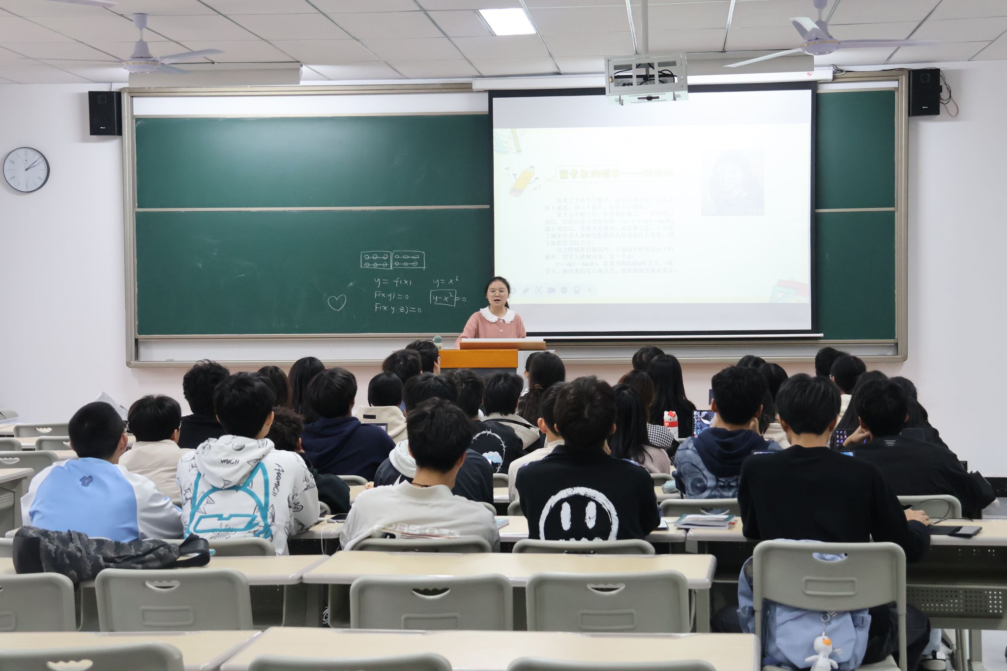 活动伊始,曹沙沙老师从“笛卡尔的情书——心形线”和“蒙娜丽莎——阿基米德螺线”引入,开启了一场奇幻数学之旅。她将深奥的隐函数概念与人们耳熟能详的艺术作品相联系,带领学生们走进隐函数的奇妙世界。随后,她结合生活实例,罗列了隐函数的广泛应用:马鞍面、四叶玫瑰线、单叶双曲面、行星运行轨道、电磁场中的磁力线、经济学中劳动力与生产函数关系、交通流量模型等,让学生意识到数学不仅存在于课堂中,更广泛应用于生活和科学研究中。