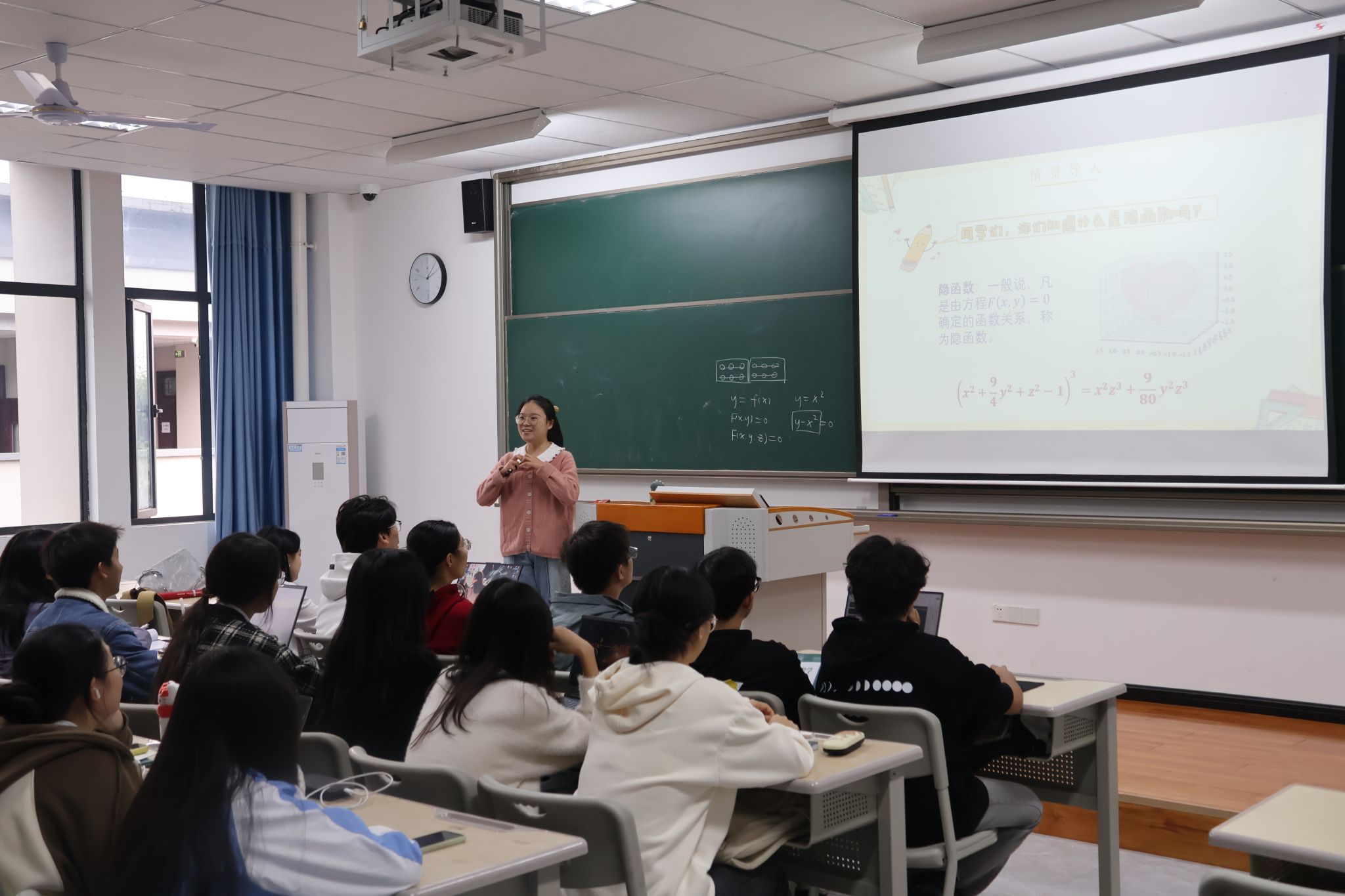 为帮助学生深入理解数学中的隐函数概念,并将理论知识与实际生活相结合,2024年11月9日下午,綦江校区远景学院《高等数学》课程师生在智者楼202教室举办了一场主题为“探秘隐函数:从理论到实践的数学之旅”的特别课程实践活动。本次课程实践由曹沙沙老师主持,并邀请陈春花、许燚珂老师进入课堂进行指导,让学生体验隐函数在多领域中的应用,并拓展学生的数学视野。