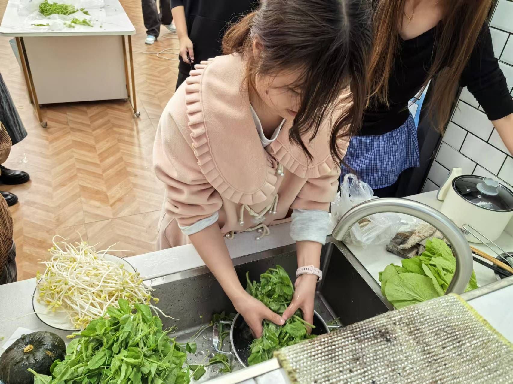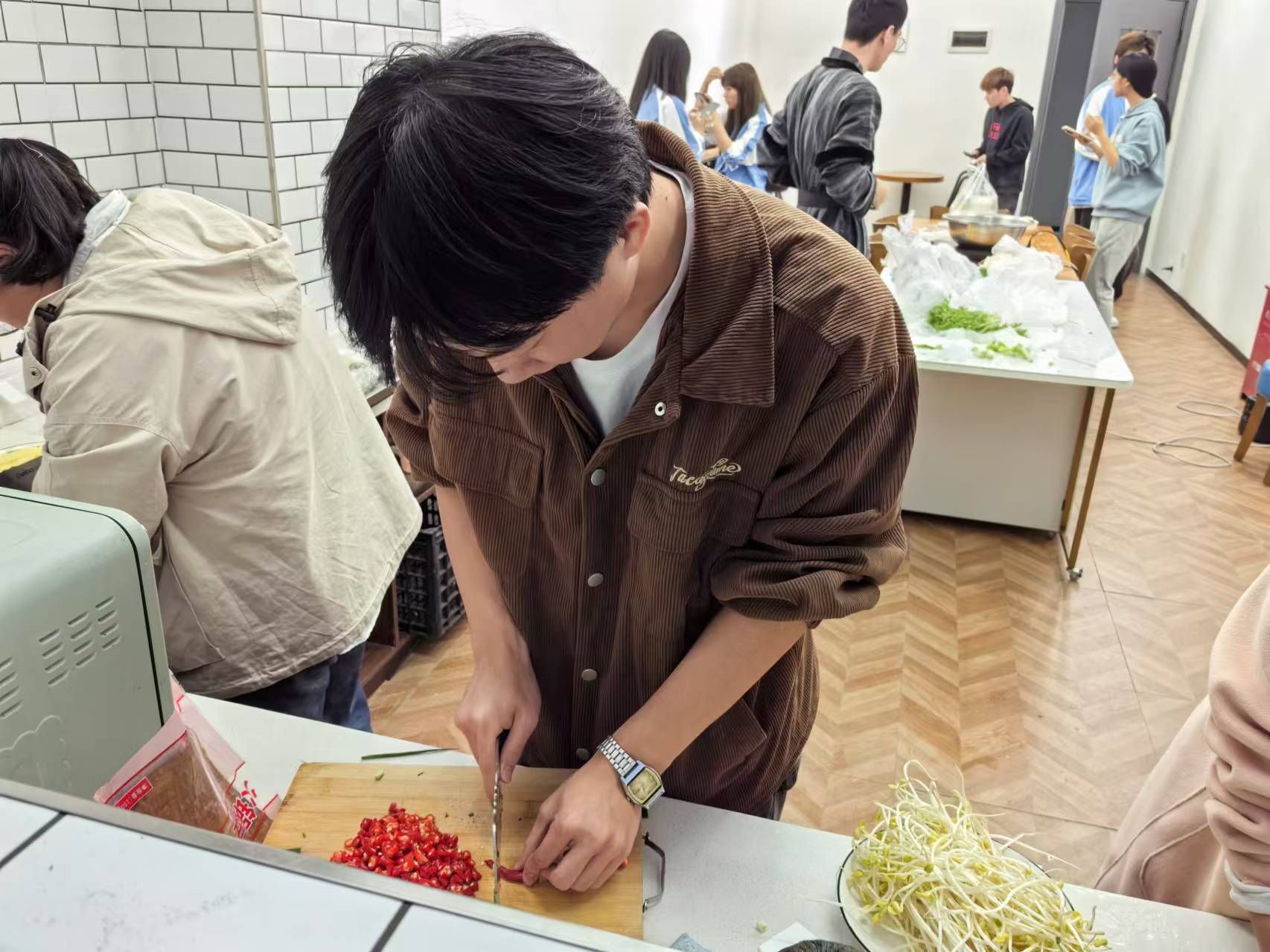 在食材准备中同学们各自分工明确,有的同学准备火锅蘸料,有的同学在清洗食材,有的同学负责切菜,每个人都在这个过程分享彼此的故事,欢声笑语于火锅一样充满热情与温馨。