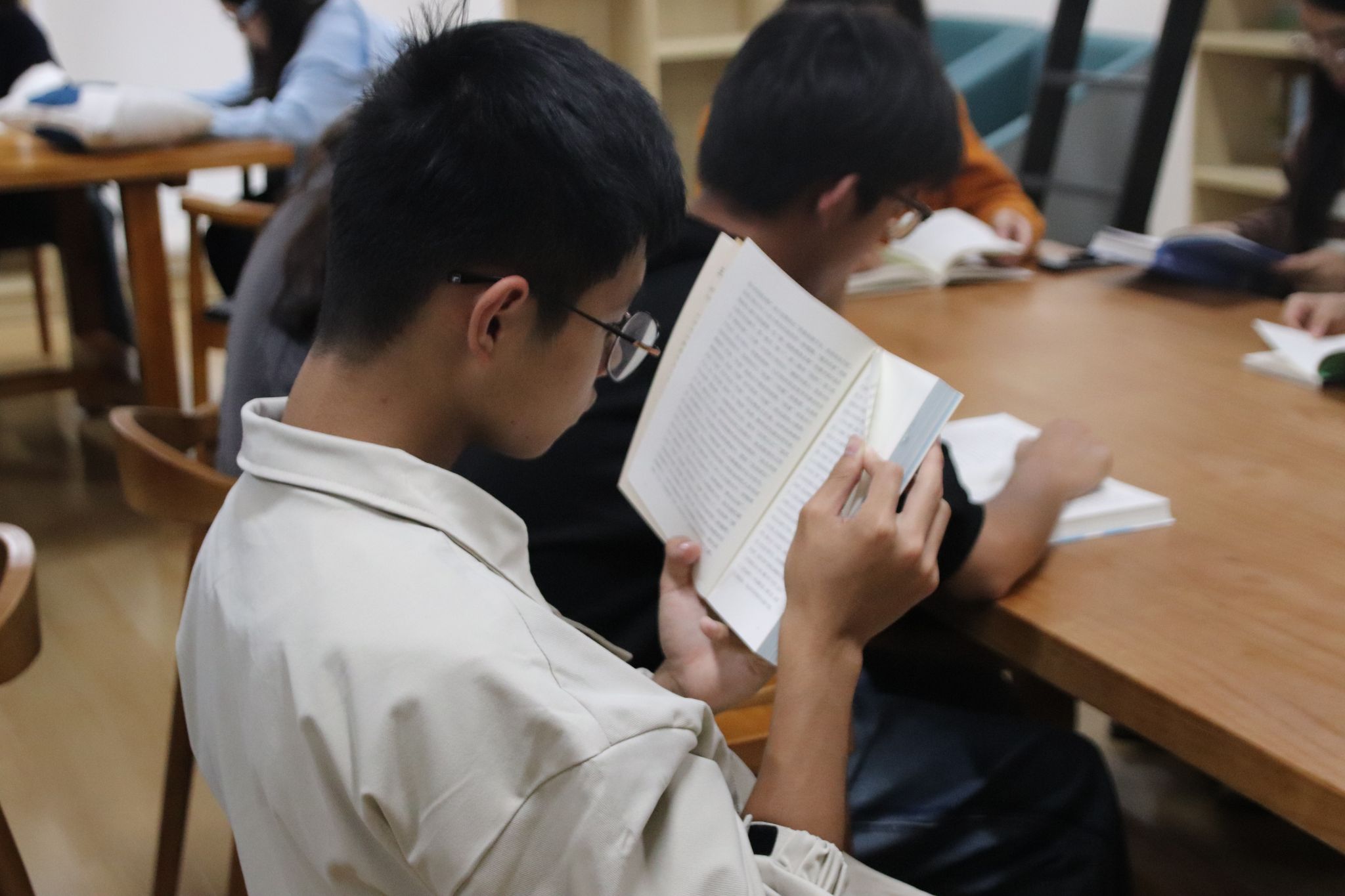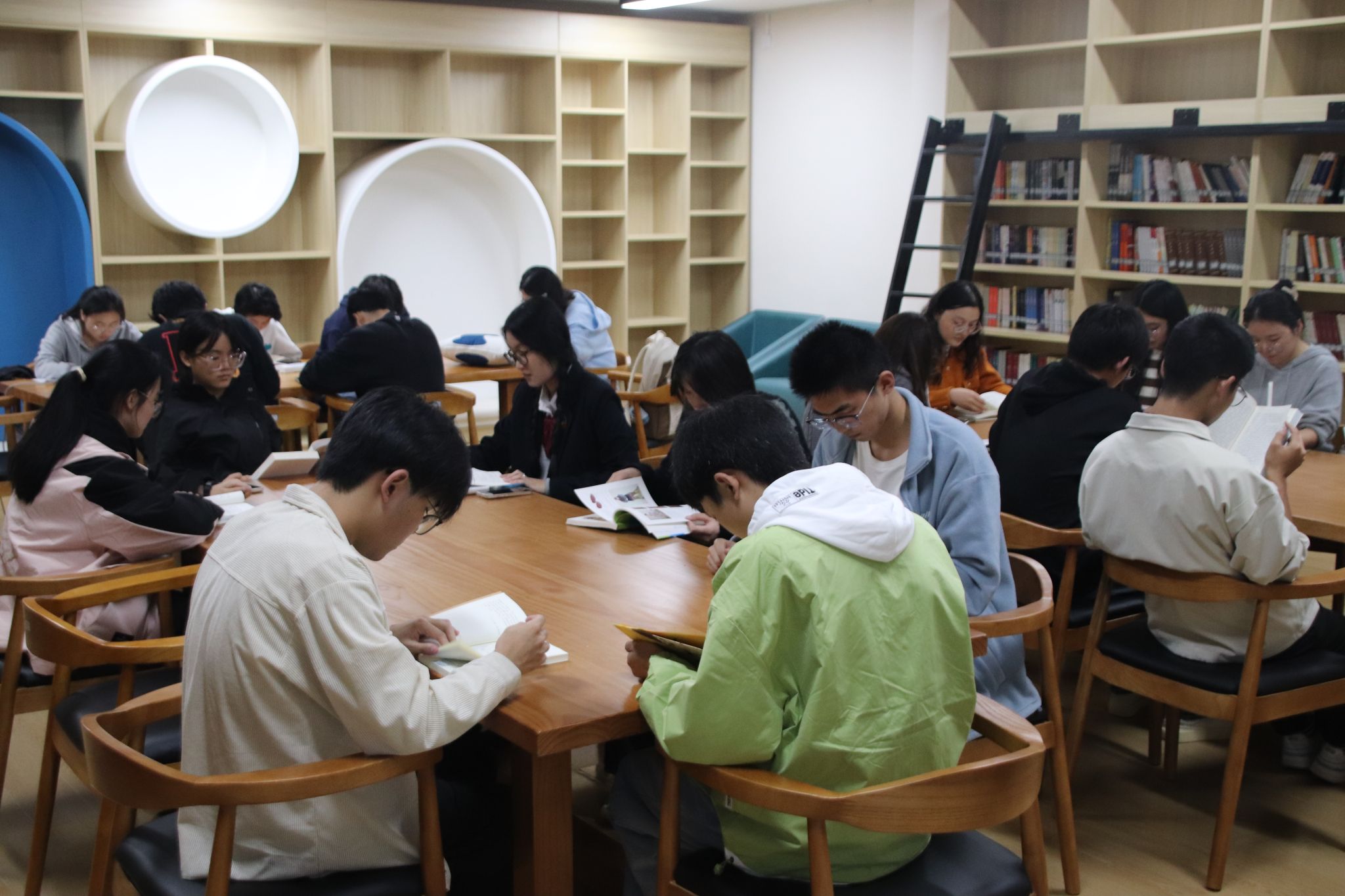 分享会在许燚珂老师的致辞中开启。许老师向在场的学生们介绍了活动流程,并激励学生们投入阅读,感受书籍带来的精神力量。在老师的引导下,学生们走向书架,挑选有兴趣的书籍,从引人入胜的小说到思维严密的数理知识,书籍种类涵盖广泛,每一本都是通向新世界的窗口。在温暖的灯光下,学生们逐渐沉浸于书中的世界里,他们的思维随着书中的情节跌宕起伏,仿佛与时间的流逝隔绝。在图书室里,只有思想在自由飞翔,只有知识在悄然传递。