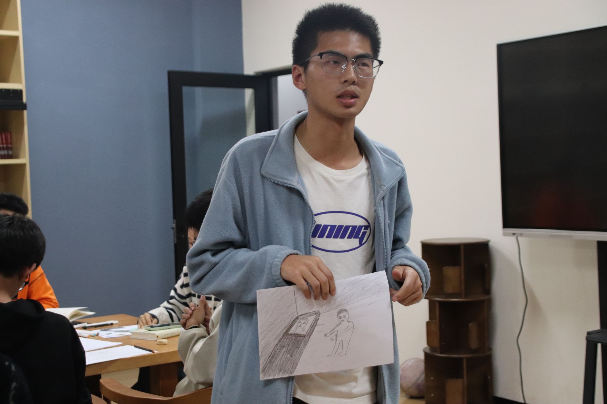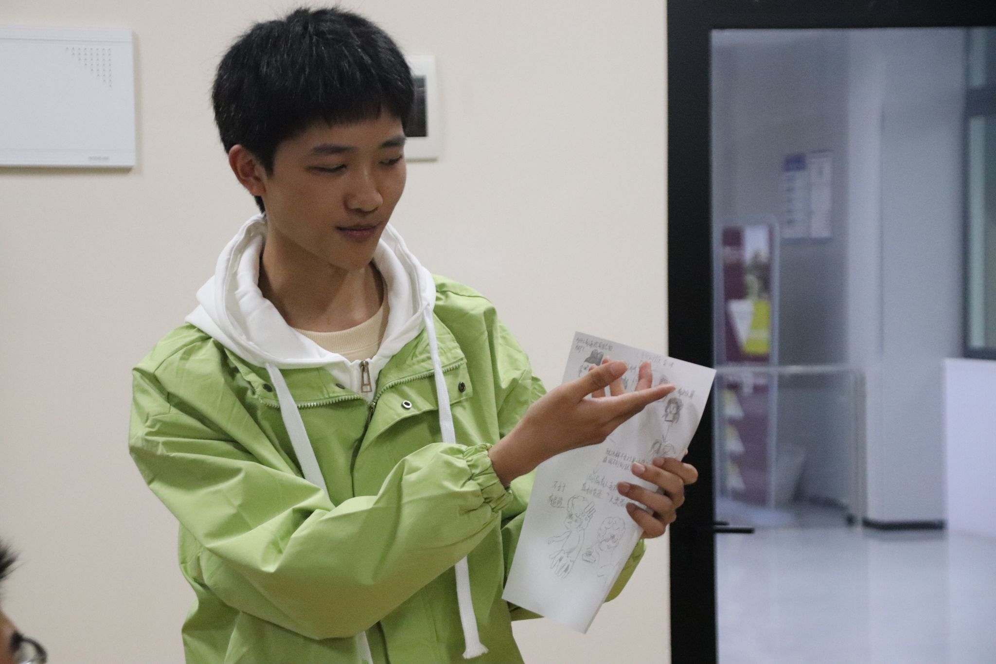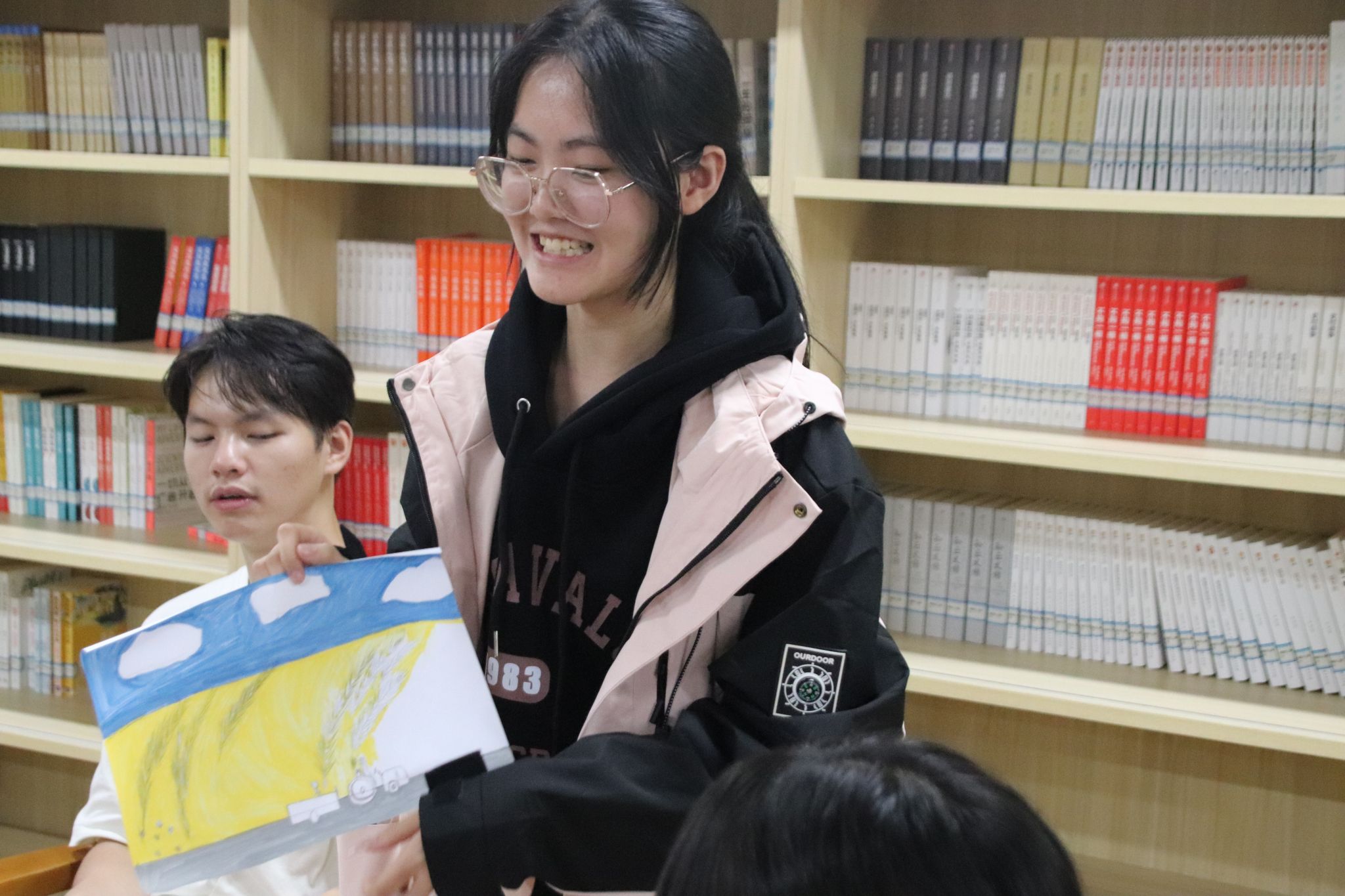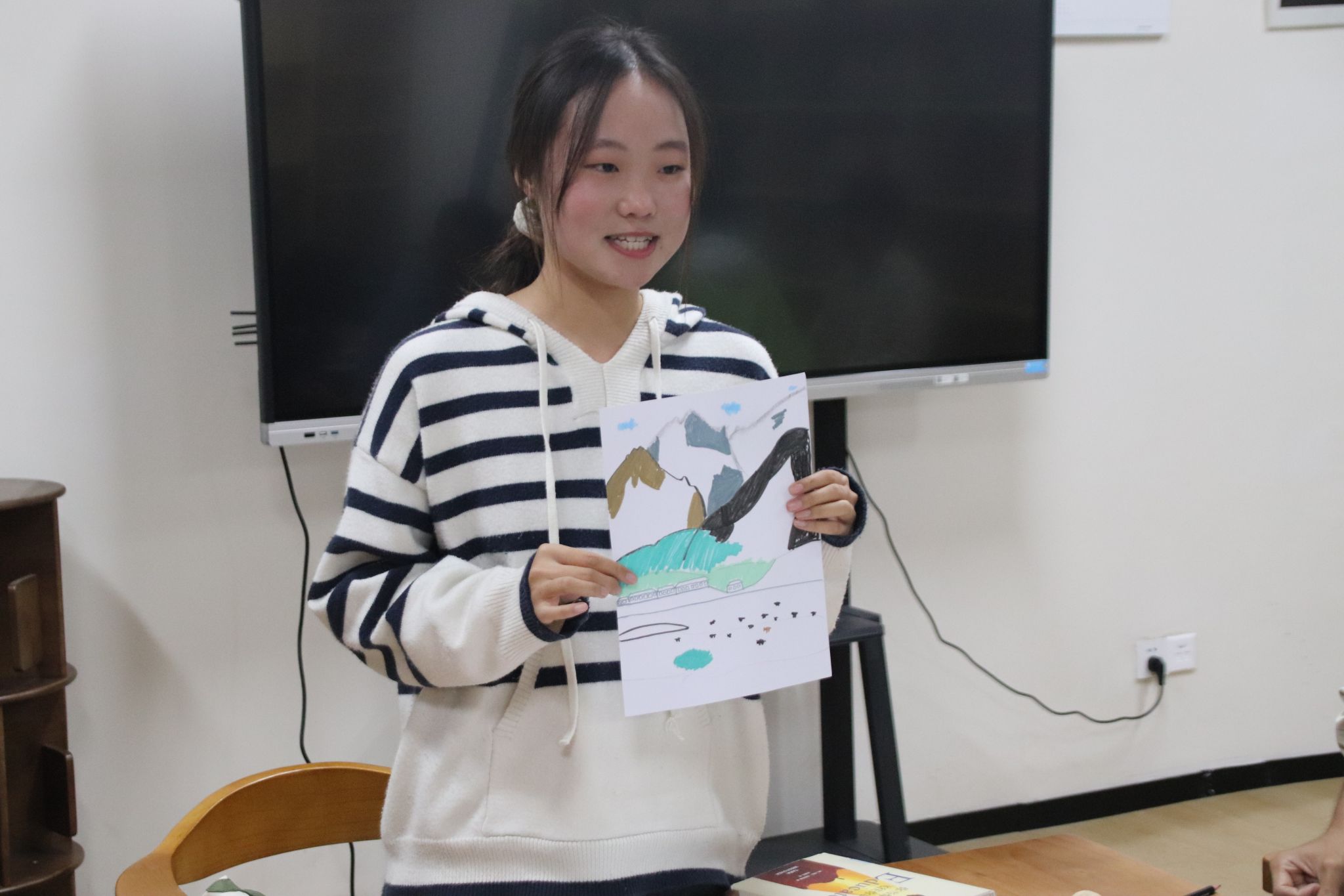 绘画环节结束后,学生们依次展示自己的作品。他们结合手中的图书,讲述自己画中所表达的内容,分享着书中的精华与自己的感悟。这些分享不仅展现了学生们对阅读内容的理解,更是让学生们通过表达自我、思考自我的方式,锻炼学生们的表达能力以及批判性思维。