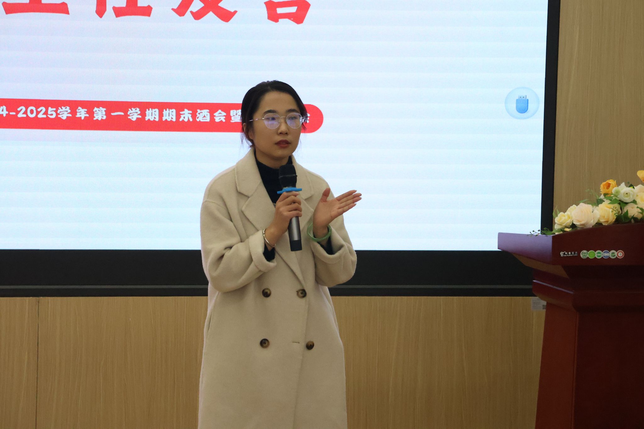 接着学工办主任游荟平老师最后进行总结发言。游老师对各部门本学期付出的努力给予肯定,同时也客观指出工作中存在的问题,如部门间沟通协作不够顺畅、个别项目执行细节不到位等,并针对这些问题提出了具体的改进建议,强调未来各部门要提升工作效率与质量,保障学院各项工作扎实推进。同时,她也强调身为学生干部在工作中要领悟到“收获与值得”两个词,强调每次活动都要有收获,有所成长。不要害怕辛苦,不要畏惧困难,只有经历磨炼,梦想才会开出花。