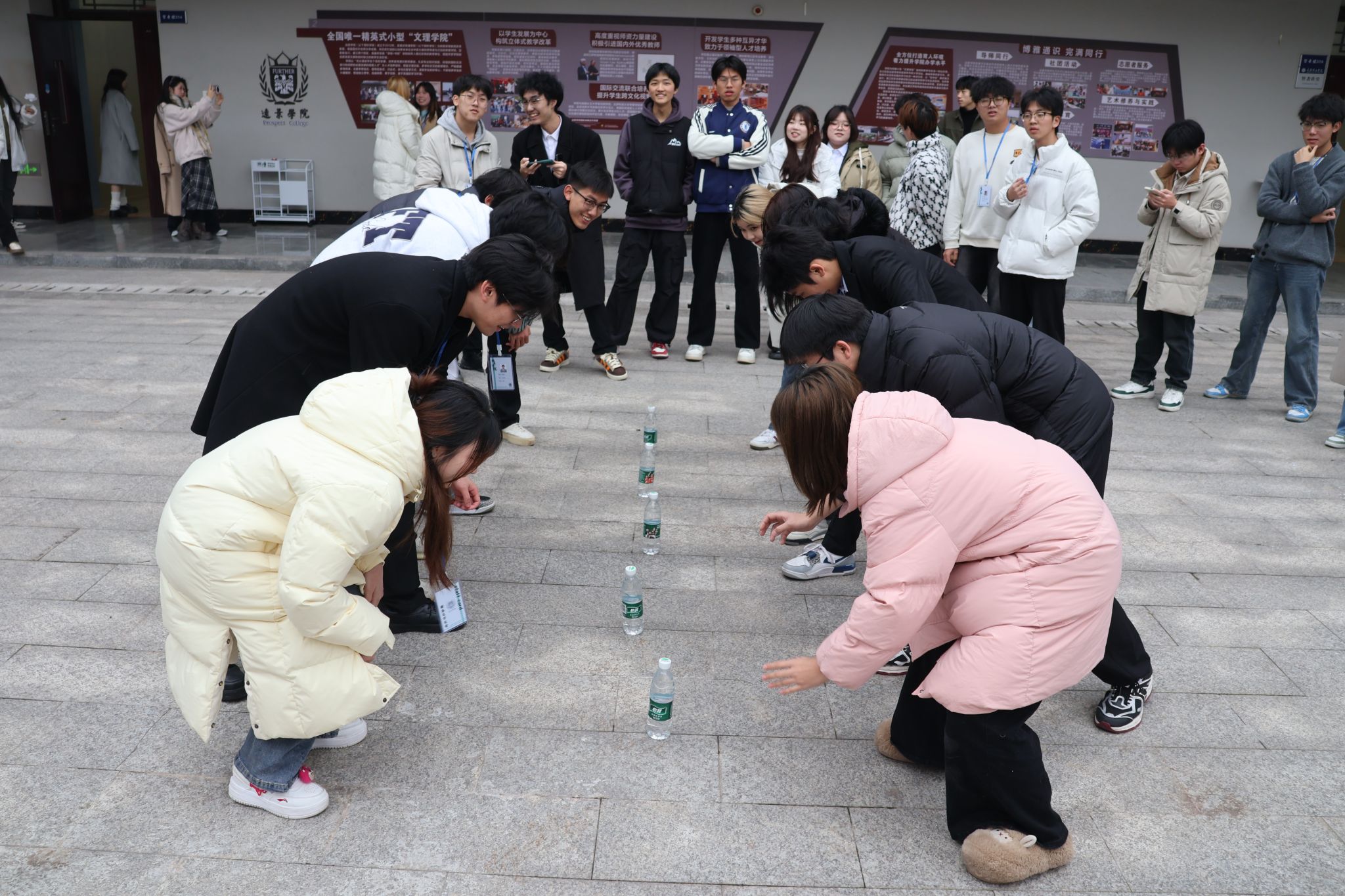在最后的互动游戏环节吸引众多师生参与。现场师生分为两队,在主持人引导下,依次开展 “七手八脚”“抢水瓶”“击鼓传花” 等游戏,这些游戏考验参与者反应速度与团队协作能力,活动中师生们积极配合,欢声笑语不断,有效增进了师生间的交流与团队凝聚力。
