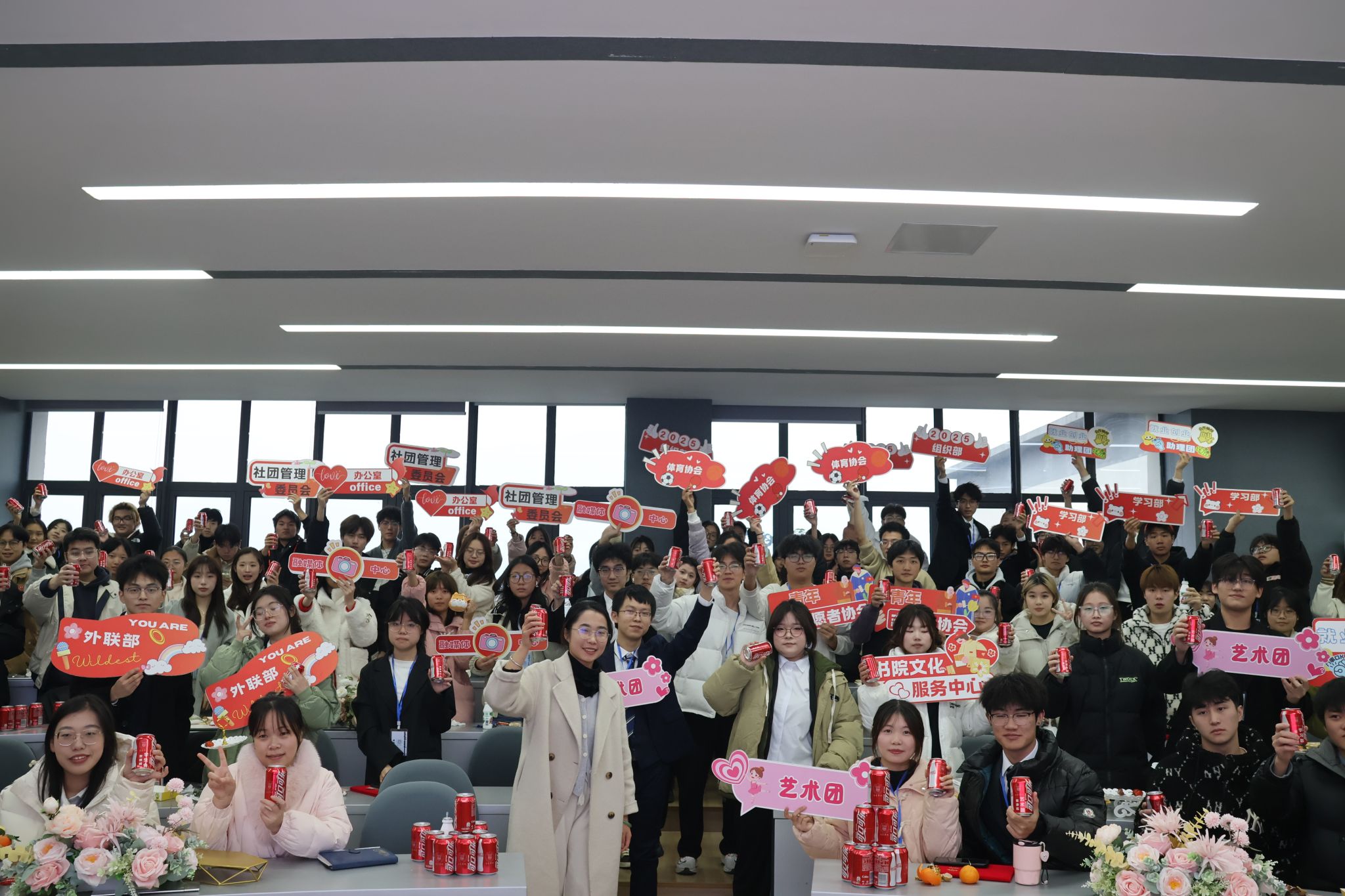 游荟平老师提议举杯,瞬间点燃了全场的热情。所有干部干事以及老师们纷纷响应,一同举起为他们定制的专属可乐,游荟平老师满怀真挚地说道:“同学们,希望未来,无论风雨如何,你们都能如这可乐般,活力满满、激情四溢,继续为梦想奔涌向前,让我们共同为当下干杯,为明日举杯!” 语毕,大家带着对未来的憧憬与坚定,清脆碰杯,一饮而尽,欢声笑语交织回荡,将现场的氛围推向了新的高潮。