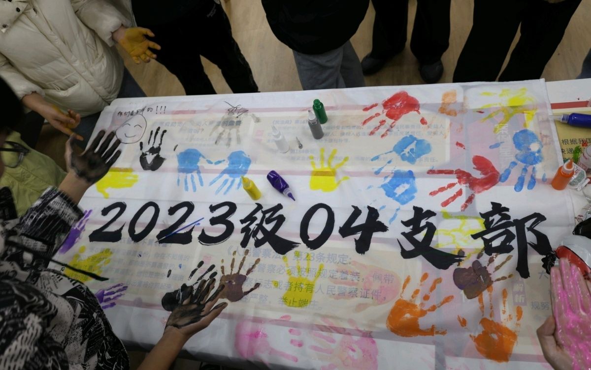 最后,“凝聚时刻——班旗制作”成为了本次活动最具温情与力量的画面。同学们纷纷将自己的手印留在班旗上,每一个手印都是一份承诺,象征着他们将紧密团结在一起,以自律为帆,在未来的学习和生活海洋中破浪前行。随着相机快门声的响起,同学们手持班旗,与老师们一起留下了这一珍贵的合影,照片中的笑容定格了此刻的美好,也预示着他们在自律之路上即将开启崭新的征程。