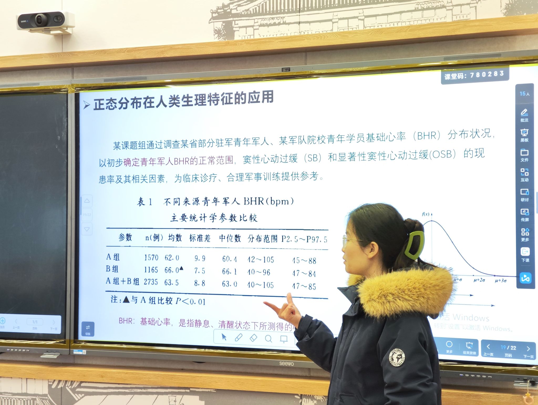 随后,朱凤玲老师接过话题,从生命科学的角度探讨了正态分布的广泛应用。她以心率为例,生动形象地解释了心率的正态分布情况及其正常范围的计算方法,让学生们对正态分布有了更加直观的认识。同时,朱老师还结合一项对青年军人的心率调查结果,说明了在某些特殊情况下,心率的正常范围可能会有所不同,进一步加深了学生们对正态分布应用的理解。