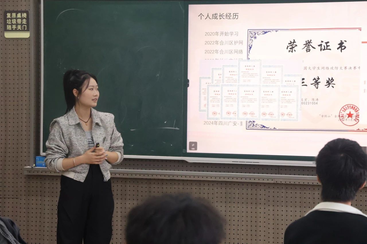 随后,活动邀请了网络与信息管理中心“綦剑网盾”网络攻防战队的指导老师游雯婷,以及优秀选手陈涛和蒋沛杭上台进行分享。陈涛和蒋沛杭首先回顾了他们的参赛准备、比赛过程以及所获得的成长与收获。他们详细讲解了团队组建、相关知识和技能的学习方法,以及训练的经验,分享了比赛中遇到的挑战、应对策略和团队协作的经历。此外,他们还谈到了加入“綦剑网盾”网络攻防战队的动机,以及战队为他们提供的支持与帮助。
