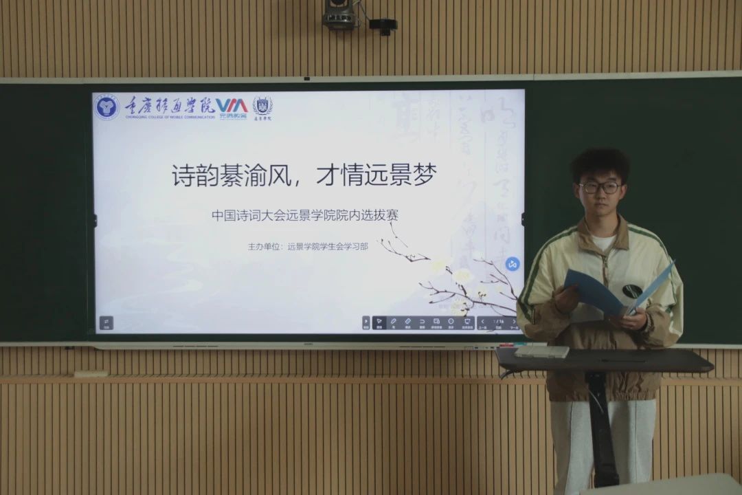 对花持酒的舞姿,踏雪寻梅的笛声,星月当空的凝望,古刹空山的啼鸣……这些经典场景铸就了溢满华彩的诗词世界。为弘扬诗词文化,领略诗词魅力,提高学子文学素养,“诗韵綦渝风,才情远景梦”中国诗词大会远景学院校内选拔赛于2024年10月9日在智者楼306完满举行,本次诗词选拔赛成功邀请了曹沙沙、胡挽澜、孟凡升、陈春花老师担任评委。
