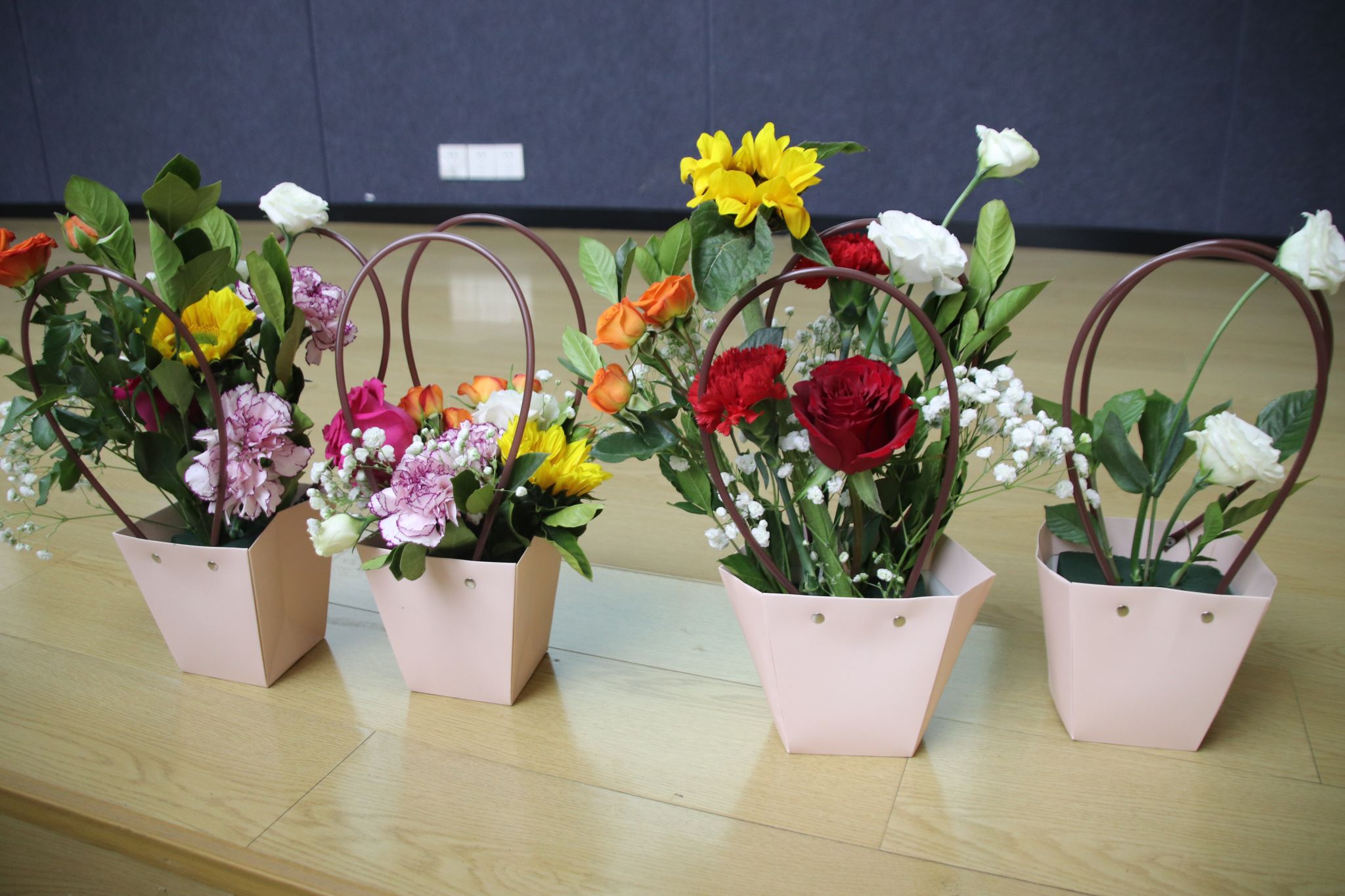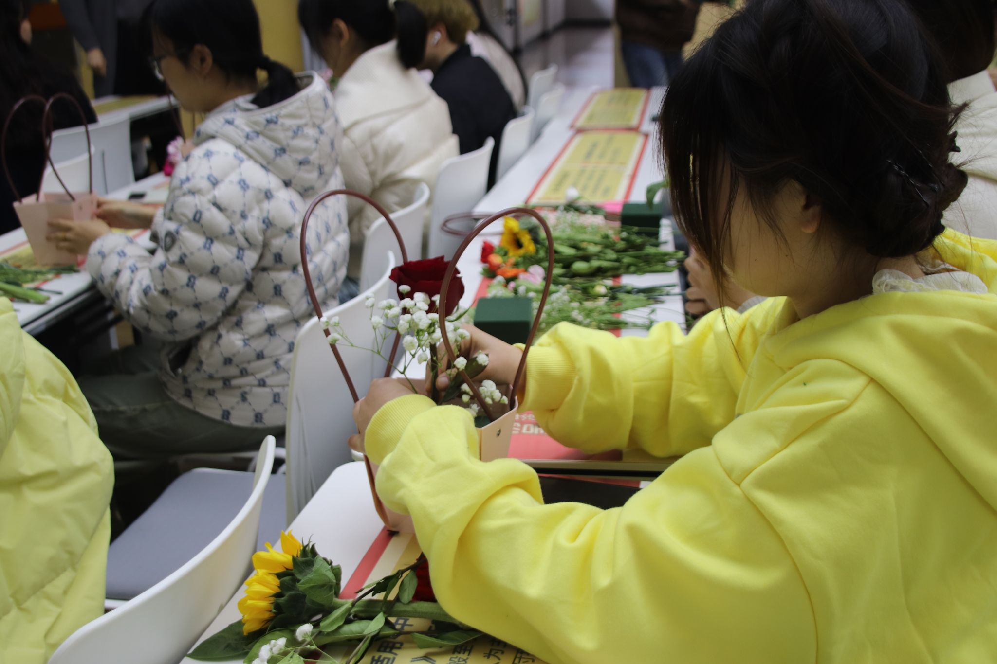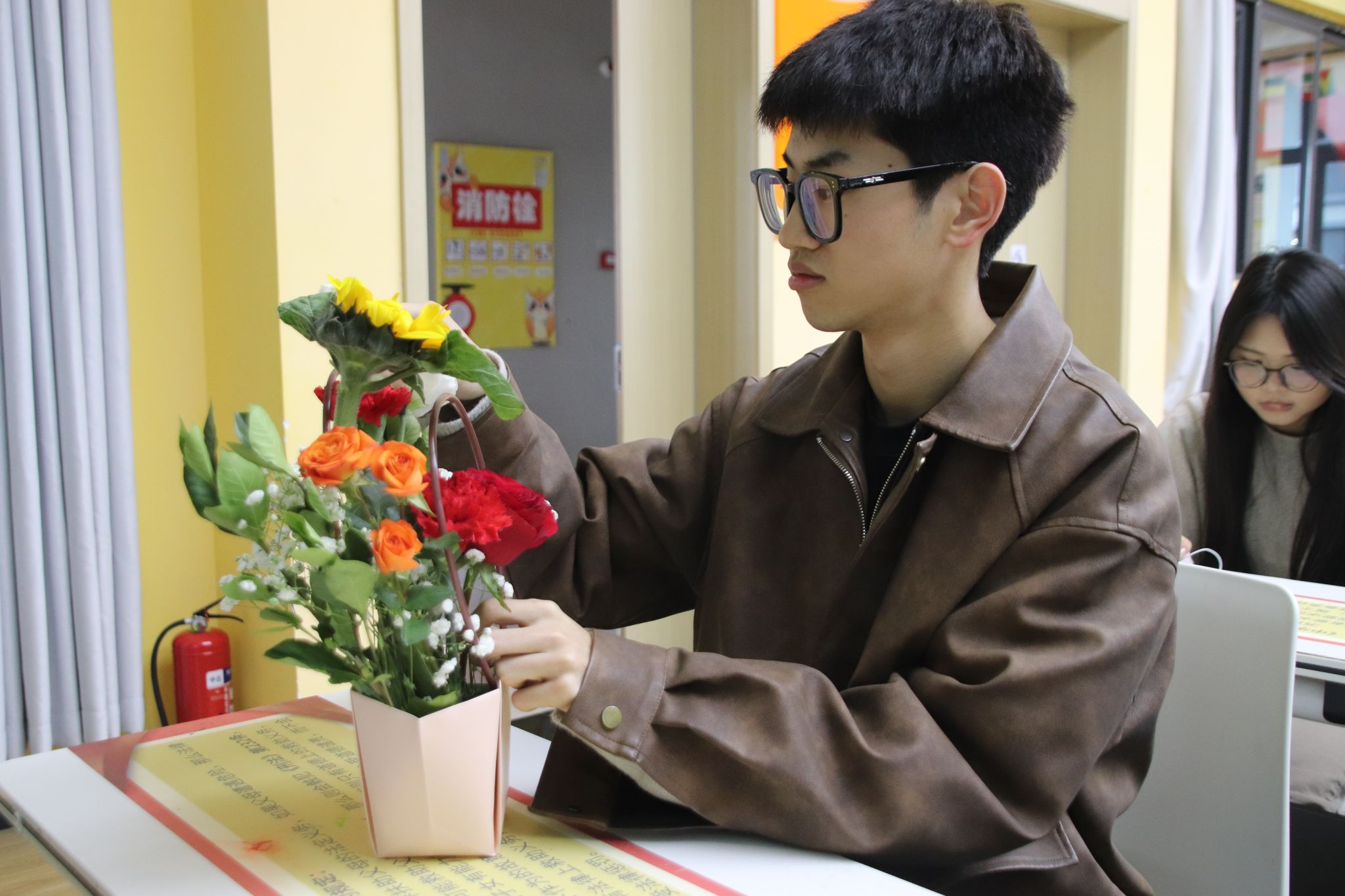 活动尾声,参与者们将亲手创作的插花作品化作一份份饱含心意的节日礼物。有的参与者将花礼赠予师长,以花叶寄情,感念教诲之恩;有的赠予好友,借花色传递祝福,共叙同窗之谊;亦有参与者选择将作品留予自己,以花语对话内心,致敬成长路上的每一份坚韧与温柔。一束束错落有致的插花,不仅是技艺的凝结,更承载着对“女神节”的独特诠释——无论赠予他人或悦纳自我,皆是女性力量与生命美学的礼赞。正如参与活动的徐梦所言:“每一枝花的姿态都独一无二,正如每个女性都有属于自己的光芒。这份亲手制作的礼物,让我更懂得欣赏自己与他人的美好。”