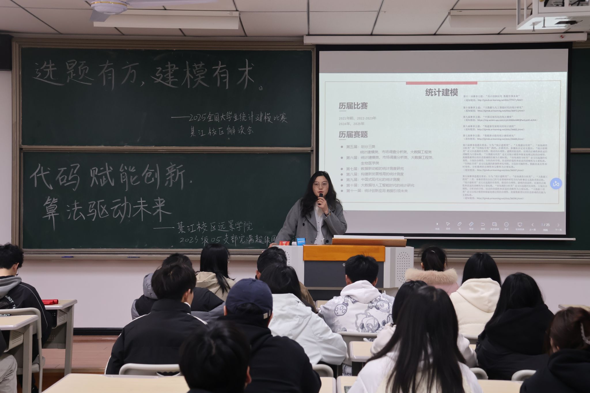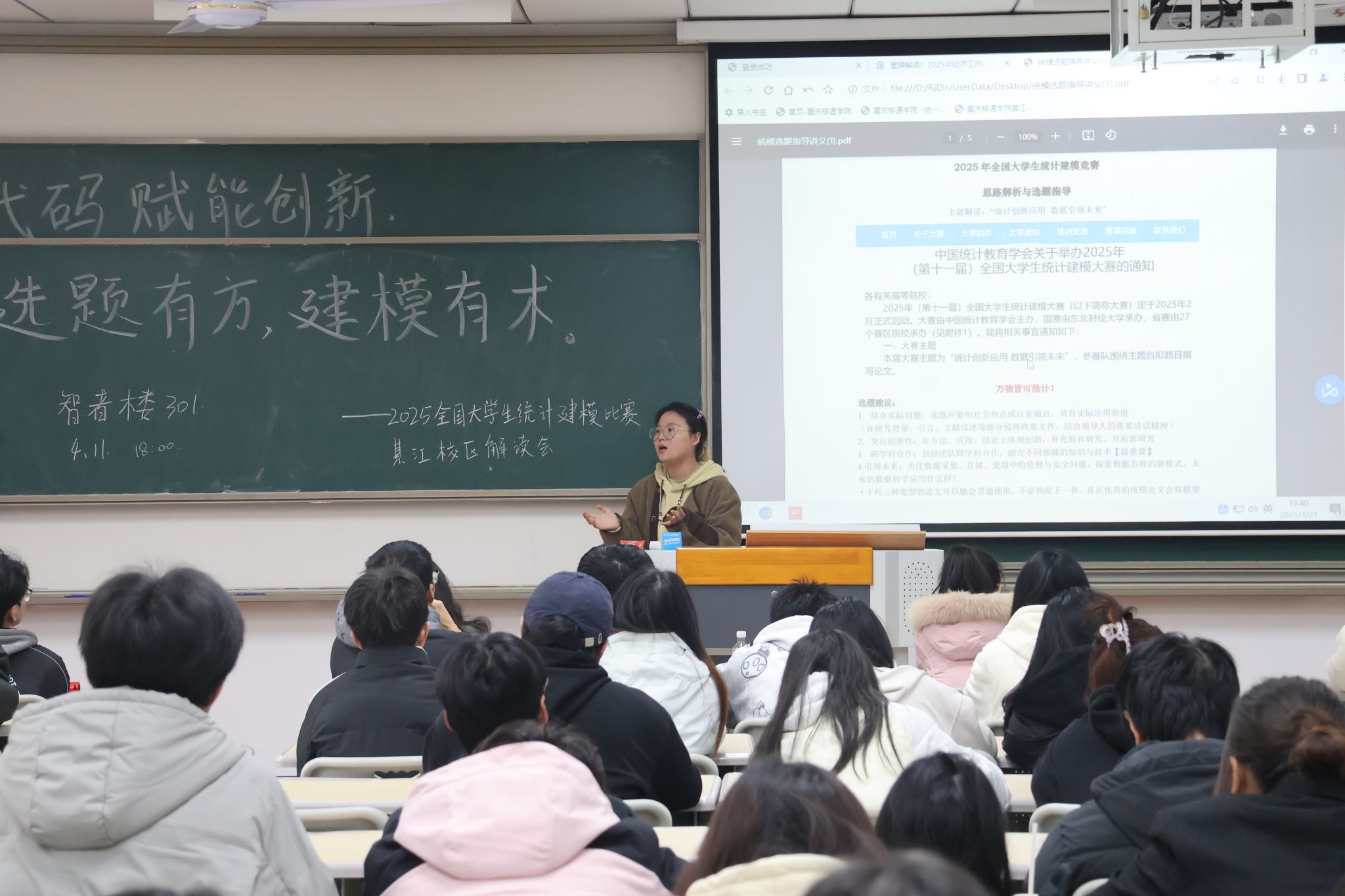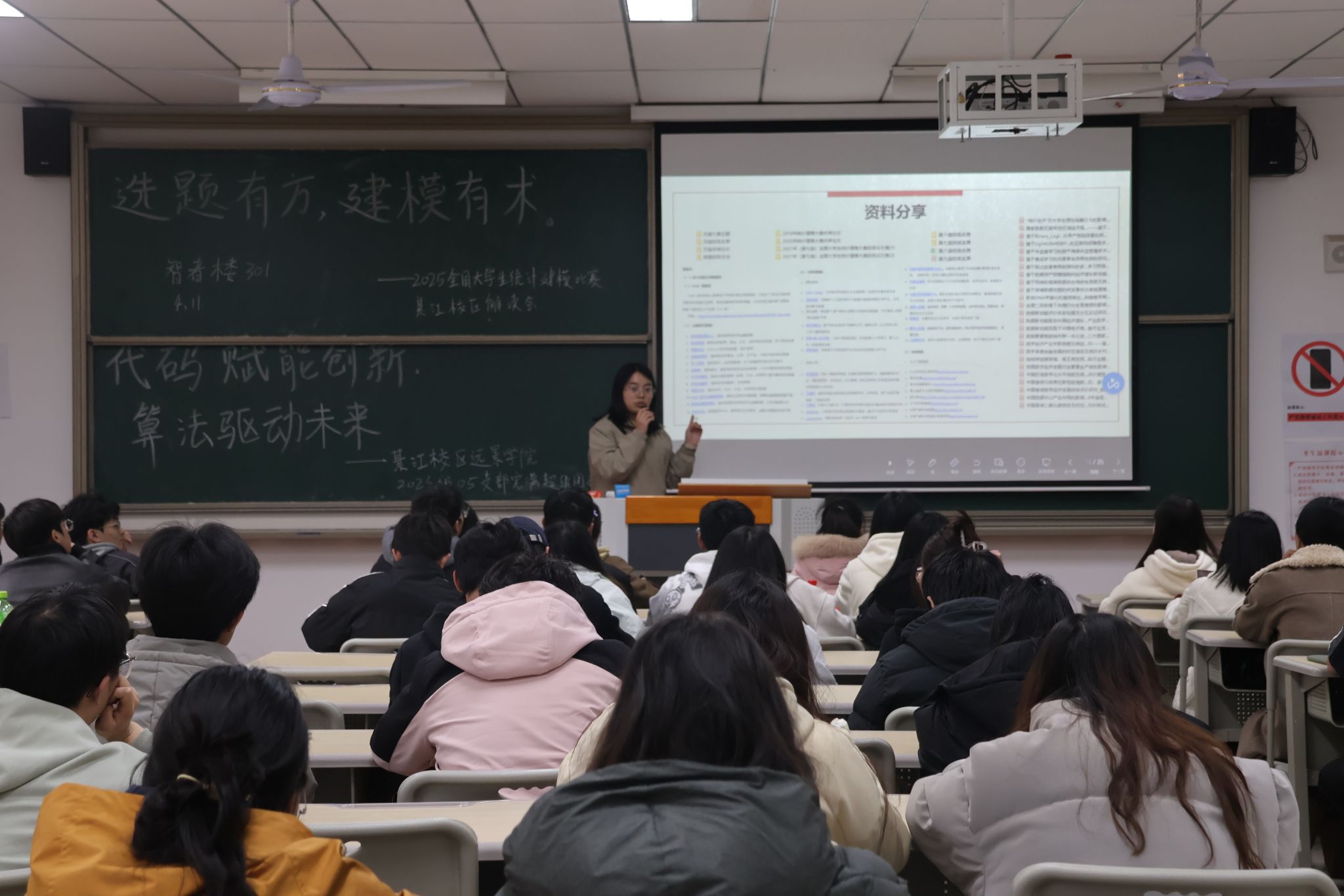 活动伊始,陈春花老师围绕“统计创新应用,数据引领未来”的大赛主题,结合历届赛题强调代码在统计建模中的核心价值。她提到,以前的赛题里,代码能高效处理数据、构建复杂模型。同时,陈老师逐一强调了选题、数据处理、建模、论文撰写等比赛流程的注意事项,为同学们参与建模比赛打下了良好基础。