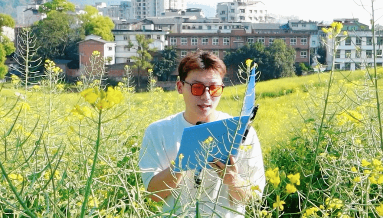 学生们依次步入花田中央的 “诗歌圆坛”,以 “春” 为母题展开多元诠释。黄圣晶选择了谷川俊太郎的《春天的早晨》。她被诗中那股自由的气息所打动,“油菜花突然摇晃的时候,我知道风是从哪边来的,但我不说,因为那是风的自由”。在她看来,这句诗仿佛赋予了风生命,让它有了自己的意志和方向,这种对自由的尊重与向往,正是春天带给人的最珍贵的礼物,她想通过朗诵,与大家分享这种对自由的感悟。传翔捷朗诵了秦观的《行香子》,他被词中那绚丽的春光所吸引,“桃花红,李花白,菜花黄”,在他眼中,这些色彩不仅仅是自然的呈现,更是春天生命力的象征,他希望通过朗诵,将这春日的生机传递给每一个人。