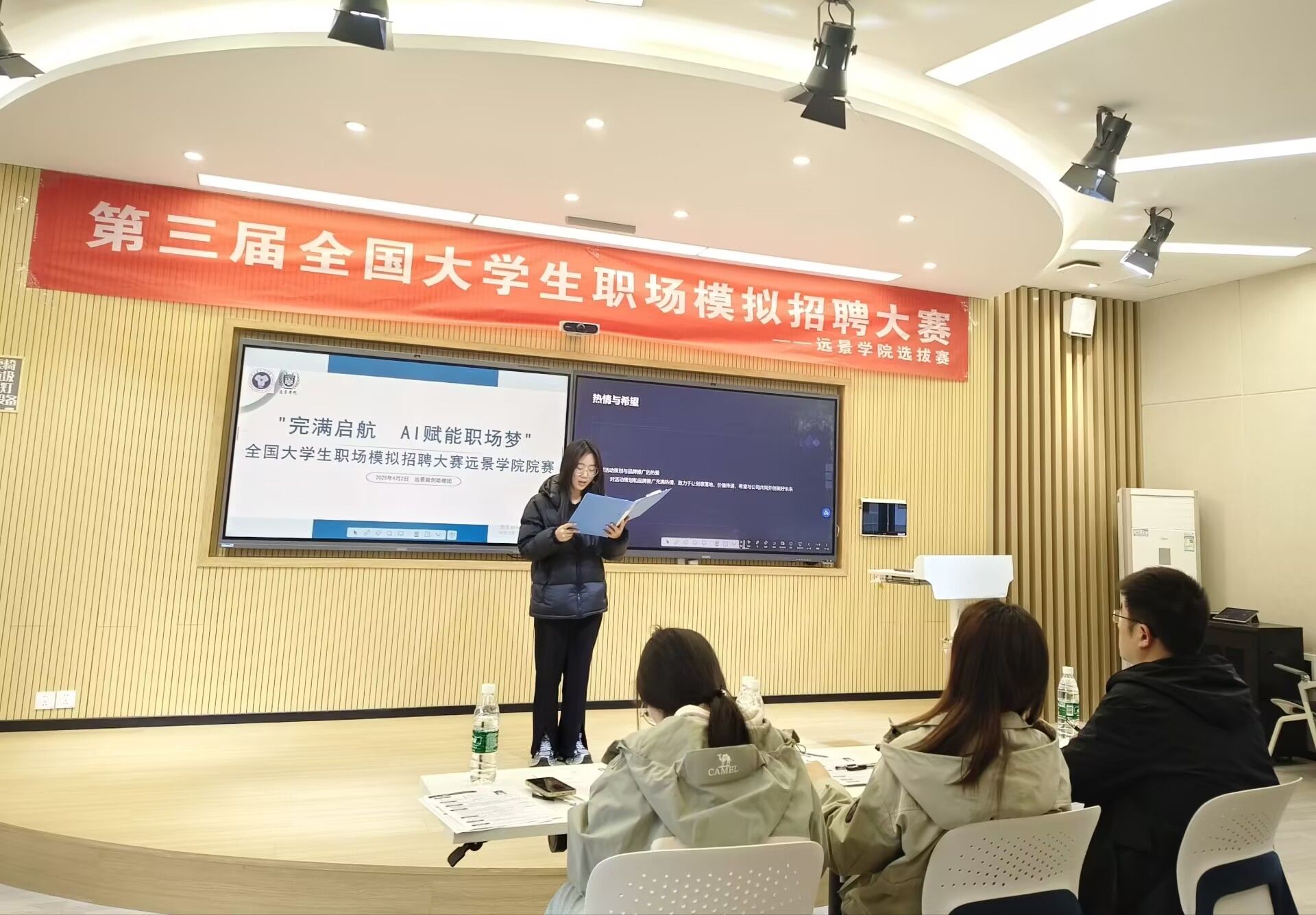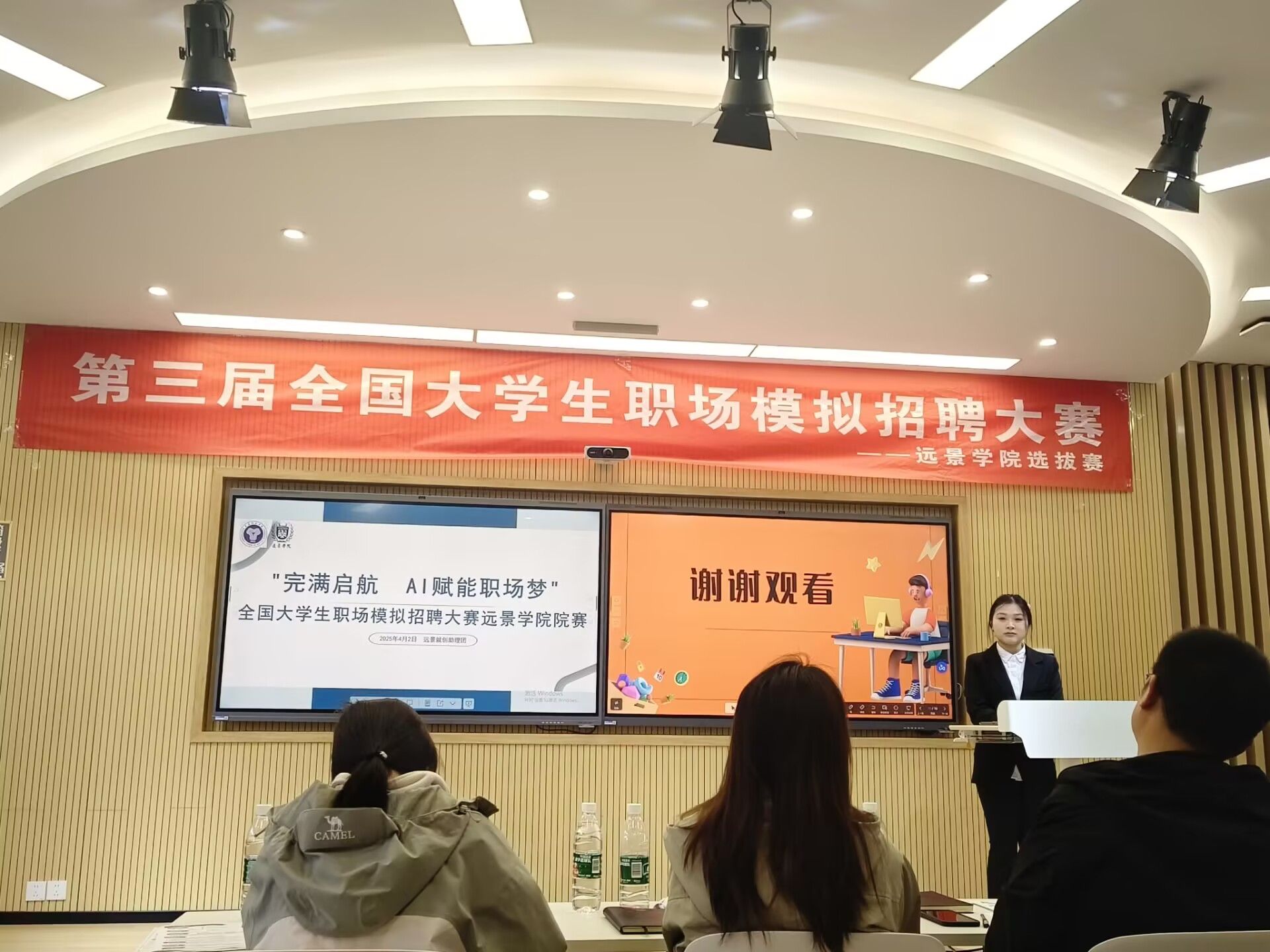 为提升大学生职业素养和就业能力,推动高校毕业生高质量充分就业。远景学院于4月2日在智者楼404举办第三届全国大学生职场模拟招聘大赛院内选拔赛,通过全真模拟求职场景,为参赛学生提供简历优化、面试技巧及职业规划指导。本次活动邀请到具有丰富企业经验的通识教育部教师毛致远和远景学院教师易兰,以及远景就创指导老师万虹岑担任评委。