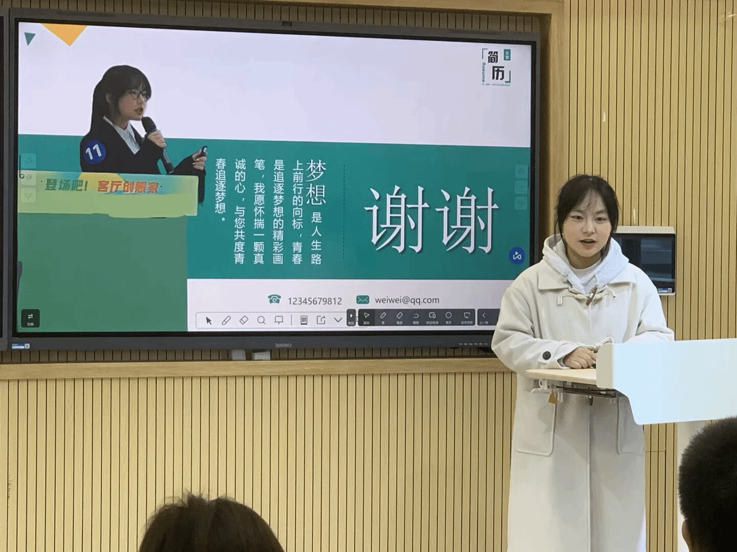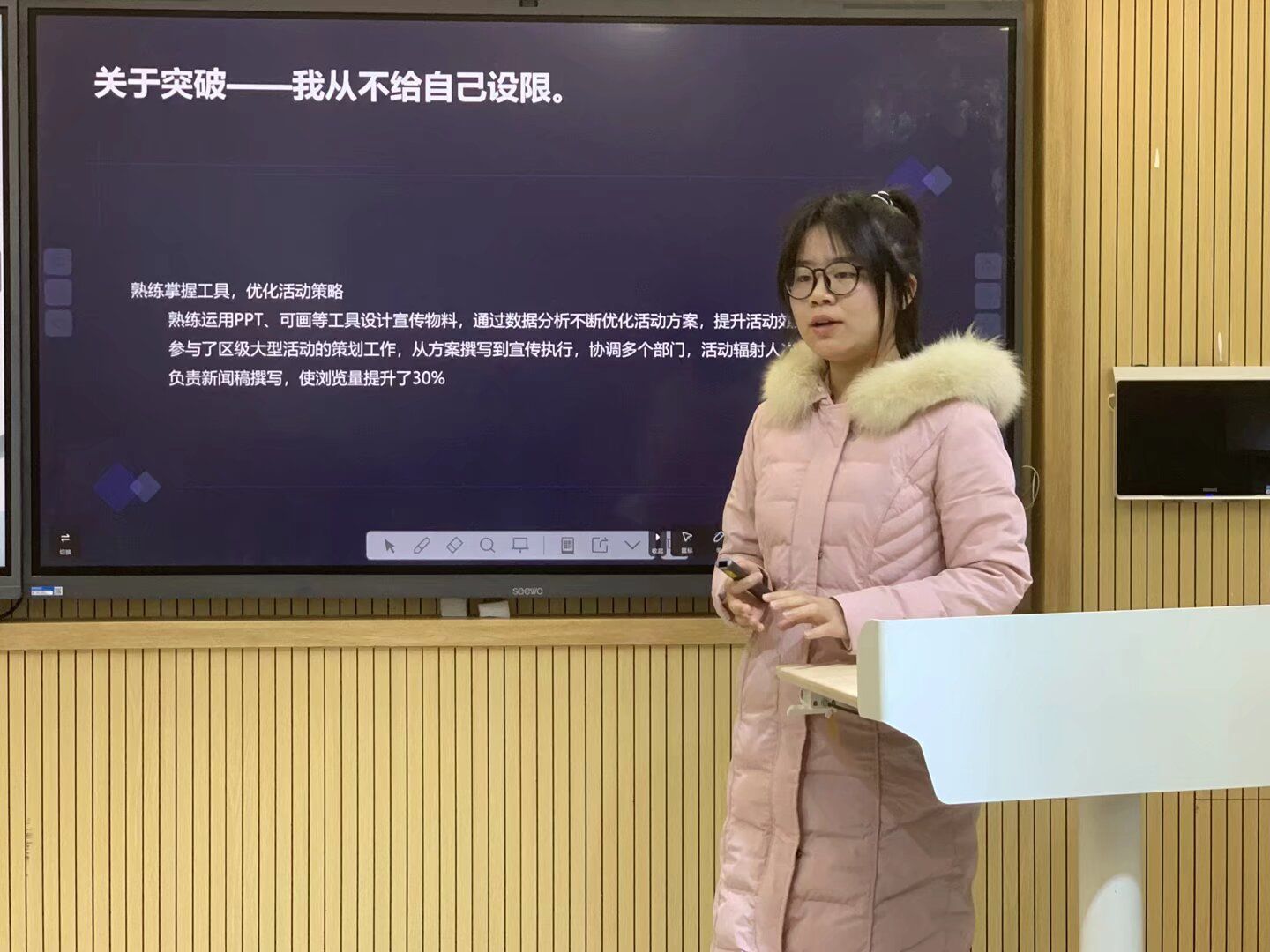 比赛分为“自我介绍”与“评委问答”两大板块。在4分钟的自我展示中,参赛者围绕专业背景、实习经历、技能优势及职业目标进行阐述。选手谷志云凭借养老院志愿服务经历与校园宣传经验,结合养老机构活动策划与运营实习生的岗位需求,展现了快速反应与组织协调能力;张骁玥则聚焦产品经理岗位,通过丰富的实习履历与行业证书积累,自信展示其项目管理与市场洞察能力;廖容通过介绍展现出了数据处理能力与高效的执行力;陈涛以“突破、专业、抗压”为核心,突出活动策划与品牌推广领域的实践能力;王世秀以新东方运营管培生为求职目标,紧扣企业价值观与岗位职责,强调人岗匹配的职业规划。