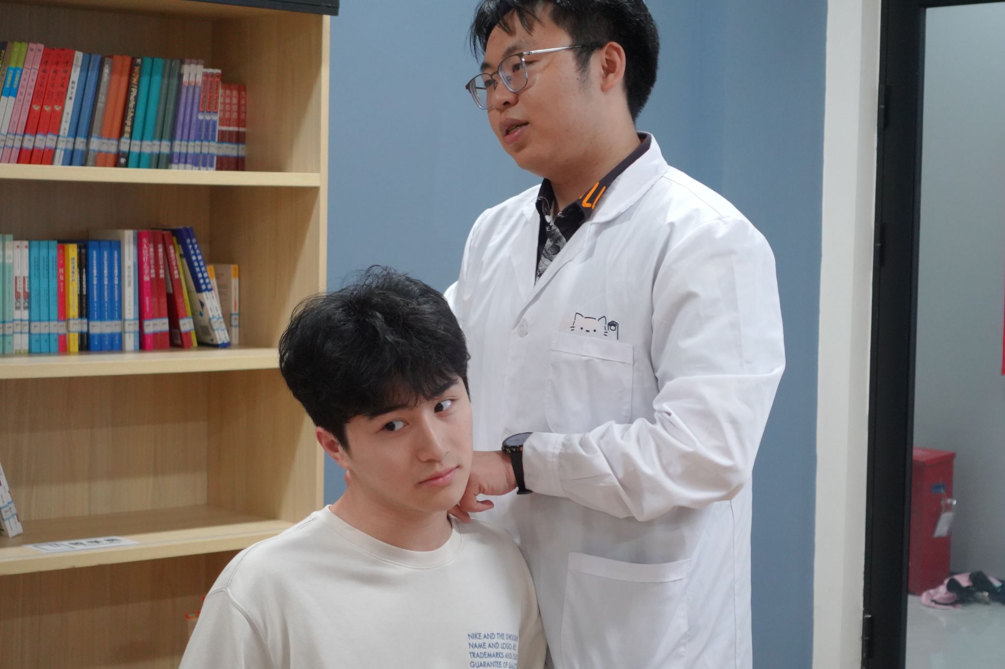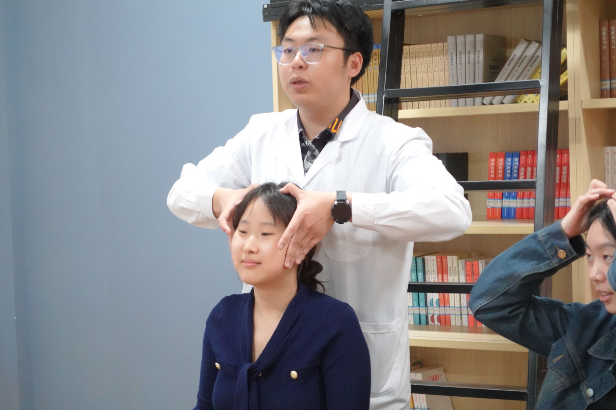 理论讲解后,活动进入“沉浸式中医体验”环节。在推拿体验区,张帅指导师生分组练习肩颈推拿,通过揉捏、滚法交替施术,帮助久坐伏案的师生缓解肌肉紧张。他耐心演示风池穴、合谷穴的定位技巧,并提醒:“推拿力度需轻柔而持续,以微热感为佳。”在把脉区,张帅通过脉象为参与者分析体质特征,给出个性化建议:“脉象弦细者,需疏解压力,多做深呼吸;脉象滑数者,宜清淡饮食,避免熬夜。”一位参与把脉的同学感慨:“脉象竟如此精准!中医的智慧让人叹服。”同学们则互相按压合谷穴、足三里穴,交流心得,现场洋溢着对中医文化的浓厚兴趣。