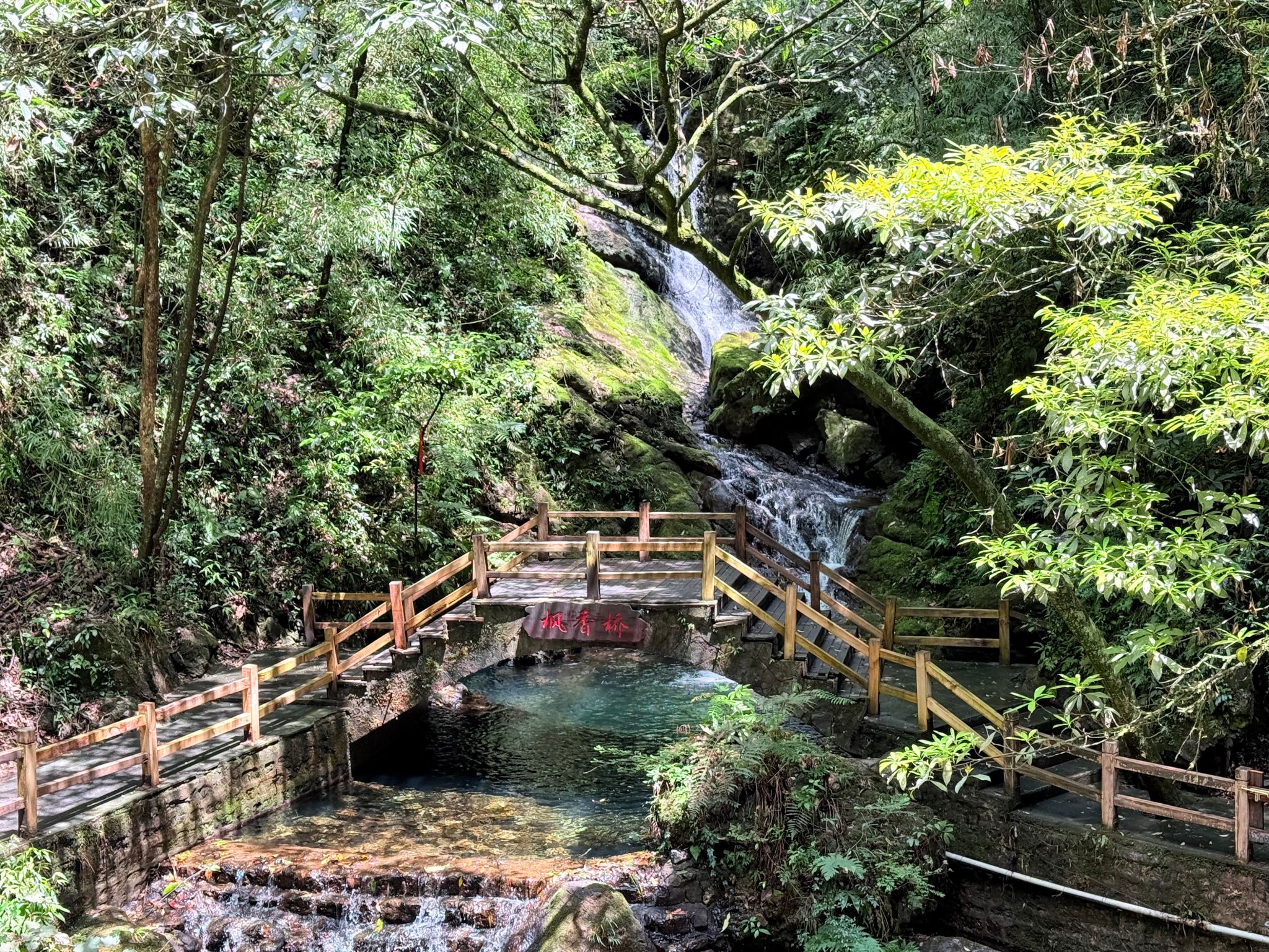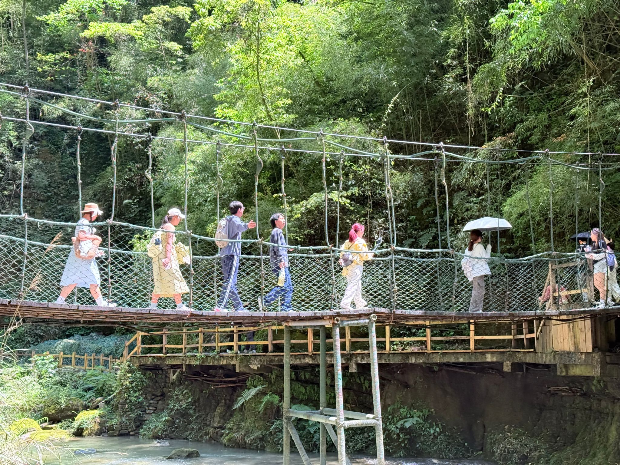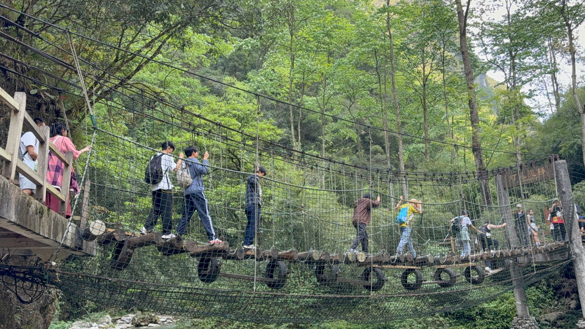 行至核心景区,飞龙瀑如白练垂空,水雾弥漫处彩虹隐现;鲤鱼峡两岸绝壁欲合,仅容一线天光;而最令人称奇的,莫过于横跨深涧的晃桥——行走其上,桥身轻摇,溪声轰鸣,既惊险又刺激。
