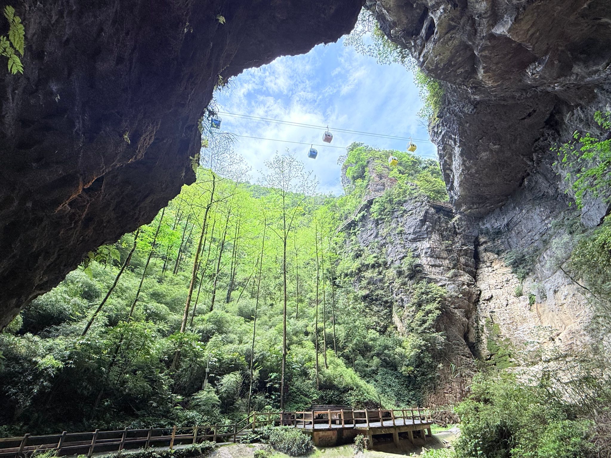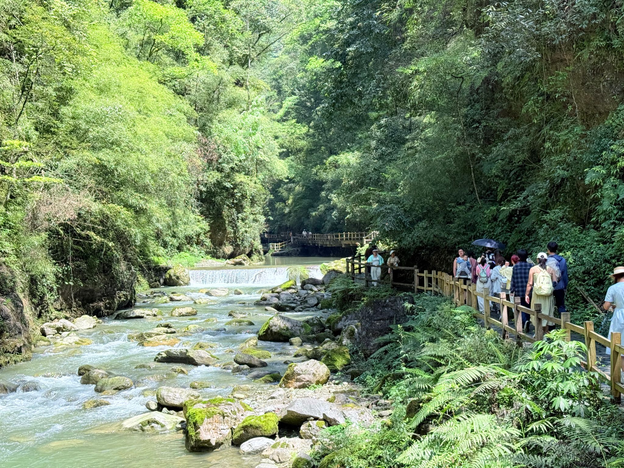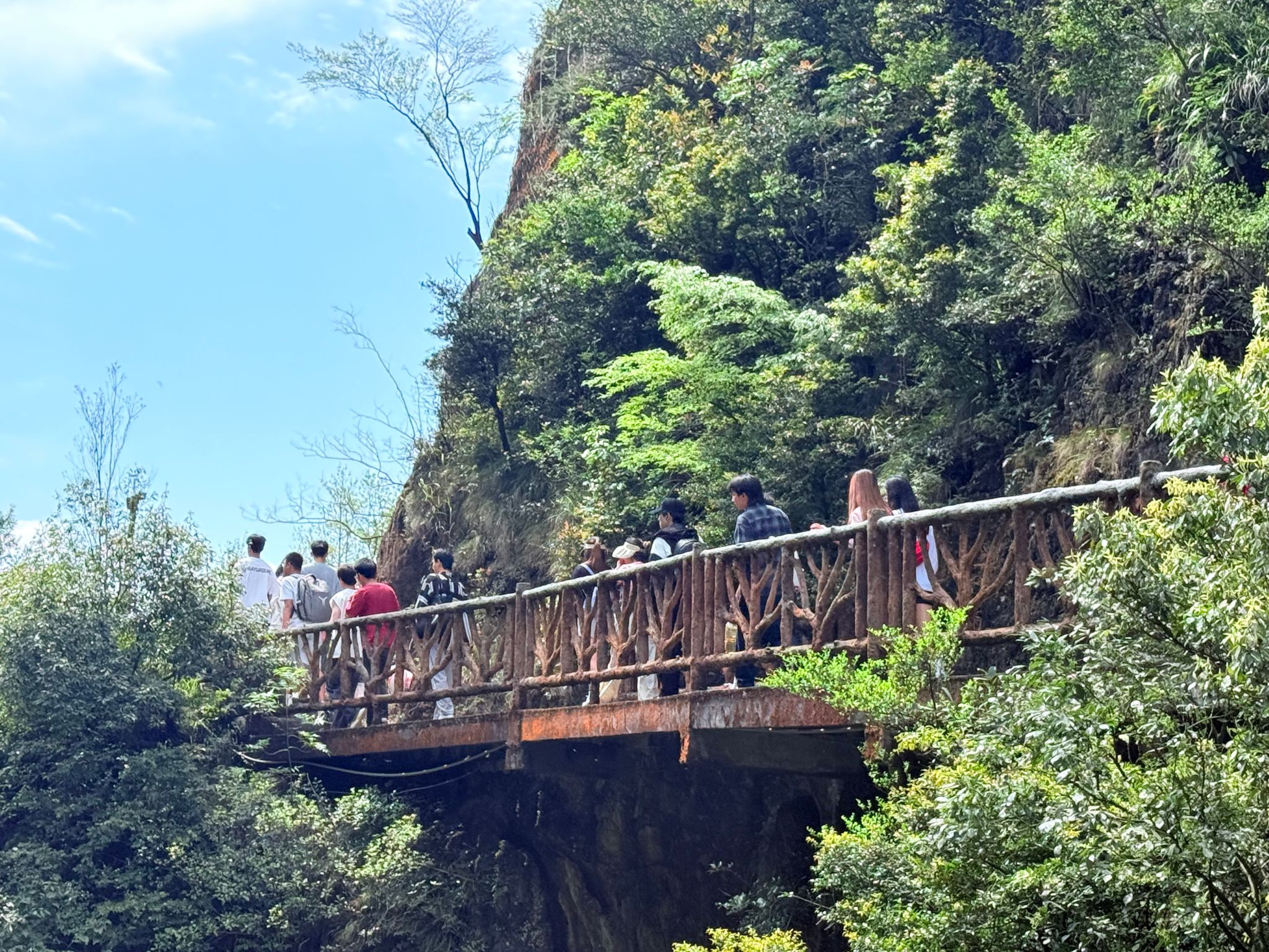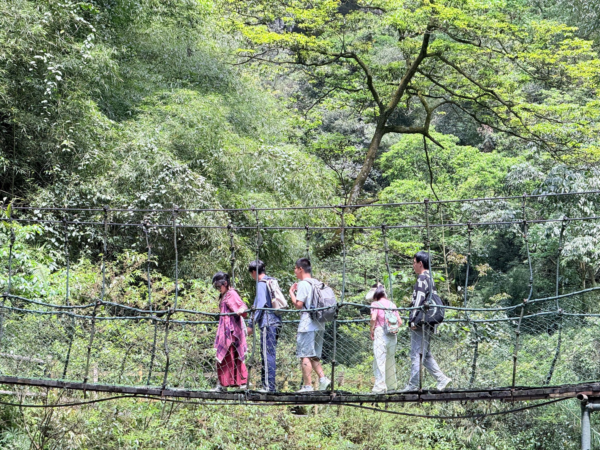 行至核心景区,飞龙瀑如白练垂空,水雾弥漫处彩虹隐现;鲤鱼峡两岸绝壁欲合,仅容一线天光;而最令人称奇的,莫过于横跨深涧的晃桥——行走其上,桥身轻摇,溪声轰鸣,既惊险又刺激。