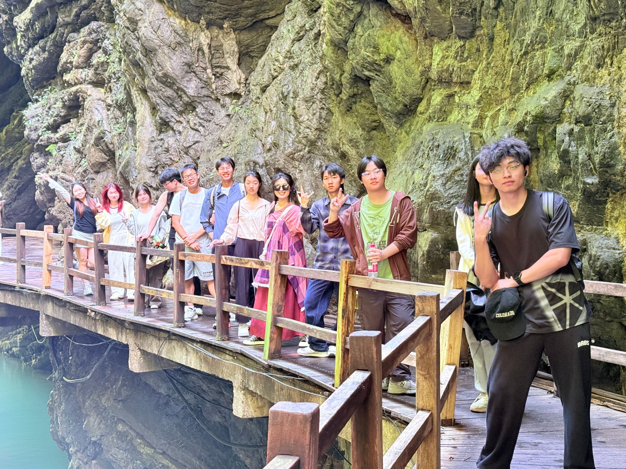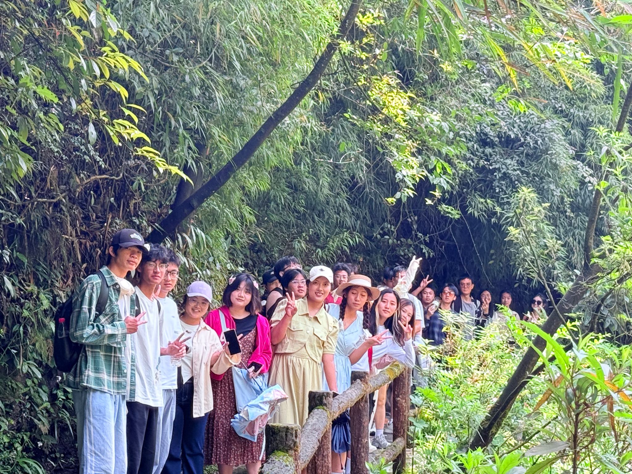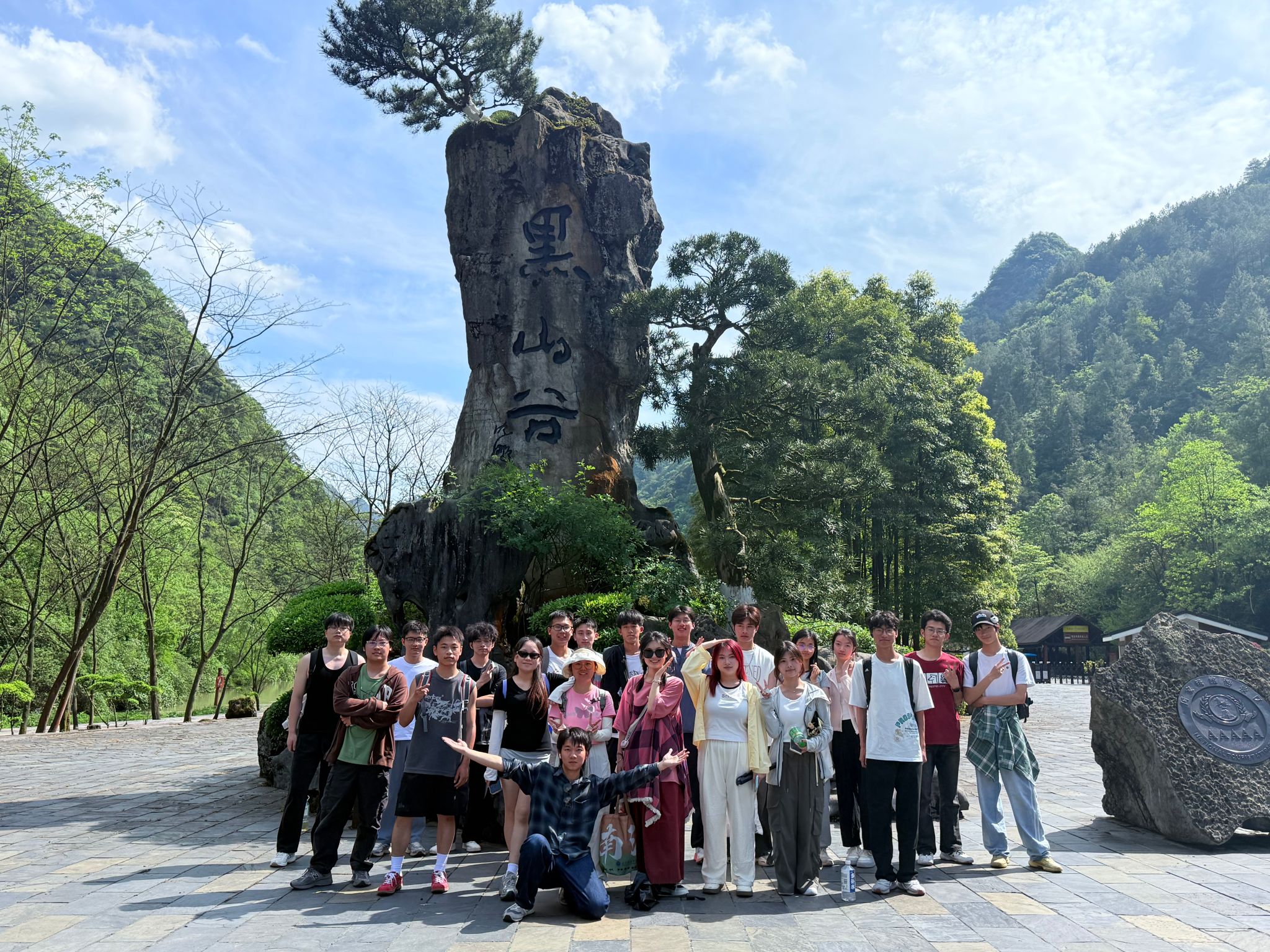 正午阳光穿透云层,师生们一进入景区,便为眼前的春色所陶醉。虽错过晨雾缭绕的仙境,却邂逅了春光最明媚的黑山谷。沿着悬空栈道徐行,但见新绿满谷:山樱花零星点缀林间,野杜鹃灼灼如火,蕨类植物在石缝中舒展身姿。清新的空气中弥漫着草木的芬芳,大家沿着蜿蜒的栈道前行,时而驻足观赏奇石飞瀑,拍照纪念,时而俯身细嗅野花芬芳,闲话家常,完全沉浸在轻松愉悦的氛围中。