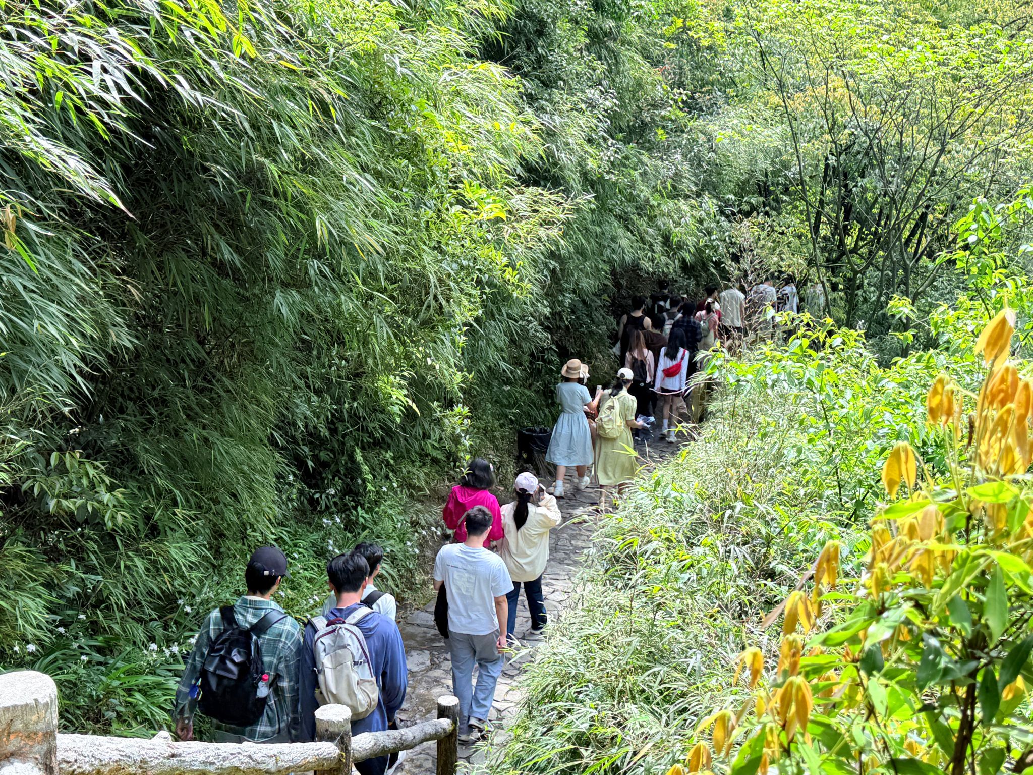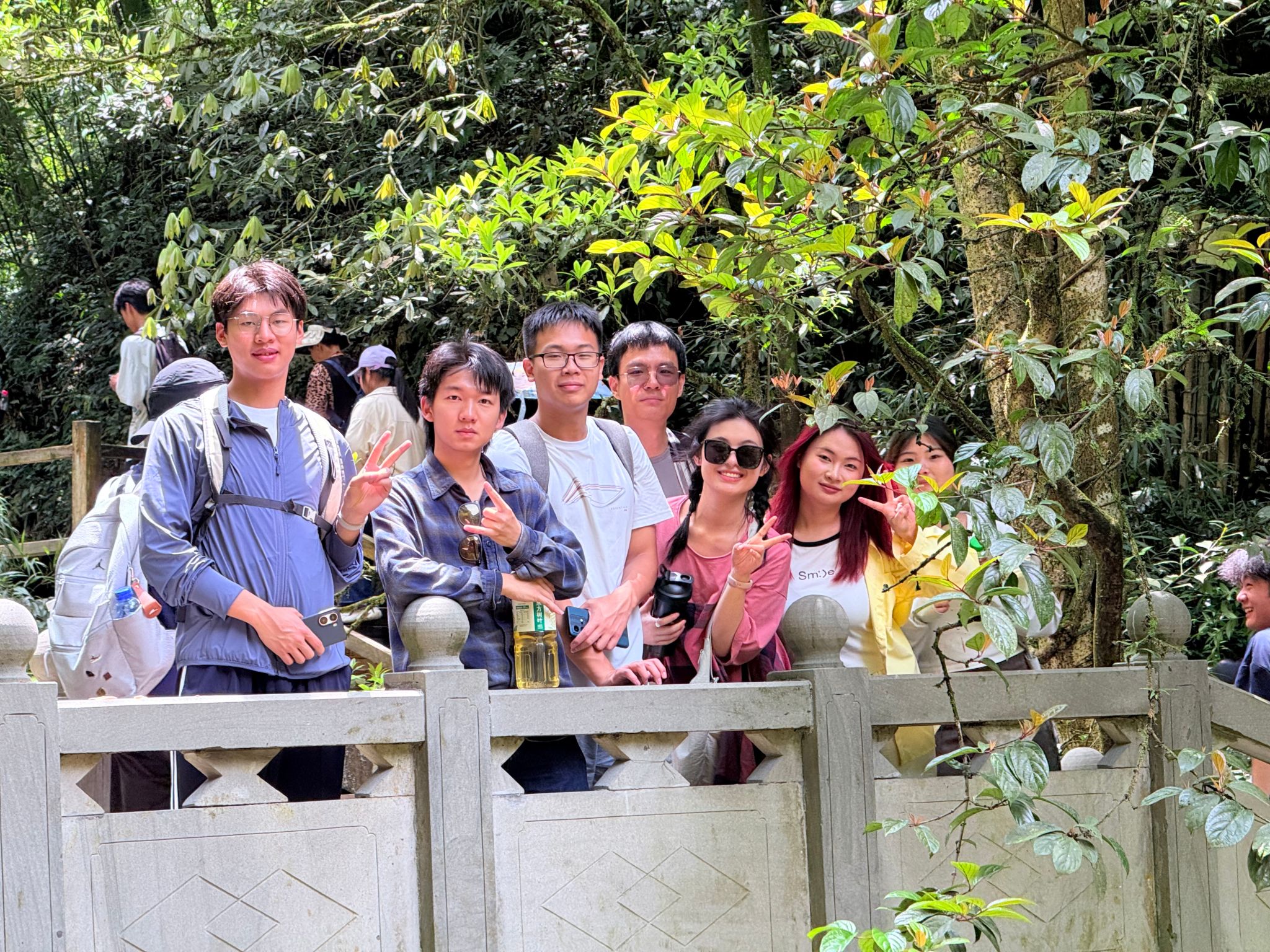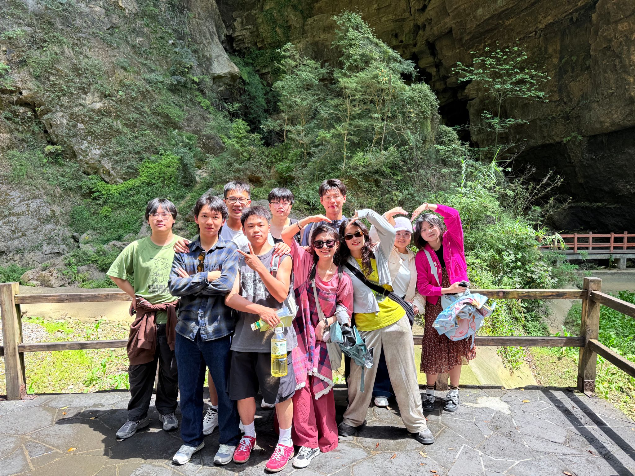 正午阳光穿透云层,师生们一进入景区,便为眼前的春色所陶醉。虽错过晨雾缭绕的仙境,却邂逅了春光最明媚的黑山谷。沿着悬空栈道徐行,但见新绿满谷:山樱花零星点缀林间,野杜鹃灼灼如火,蕨类植物在石缝中舒展身姿。清新的空气中弥漫着草木的芬芳,大家沿着蜿蜒的栈道前行,时而驻足观赏奇石飞瀑,拍照纪念,时而俯身细嗅野花芬芳,闲话家常,完全沉浸在轻松愉悦的氛围中。